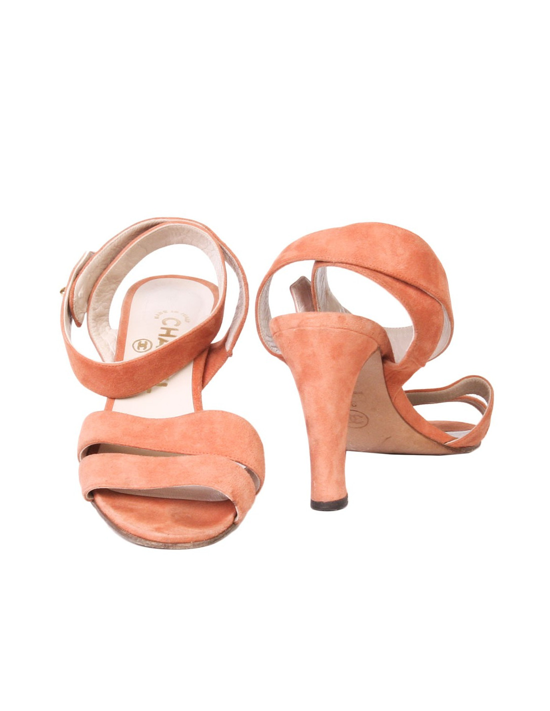 Lovely pair of high Sandals of the House of Chanel in coral-colored suede. Size 38.5. They attach using a 'CC' brass clasp gold ankle. In very good condition. They were laid and indicate slight traces to erase.