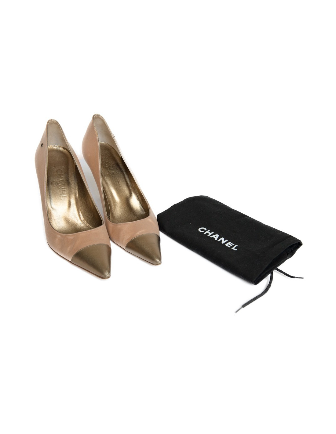 Couture CHANEL T 39 old pink satin and leather shoes bronze