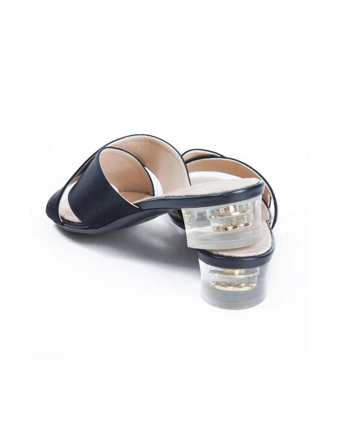 Lovely pair of Chanel House black silk satin mules. Size 36.5. The soles are in beige leather. The heels are made of plastic with inclusions of glitter and a 'C C' in gold metal. In excellent condition.