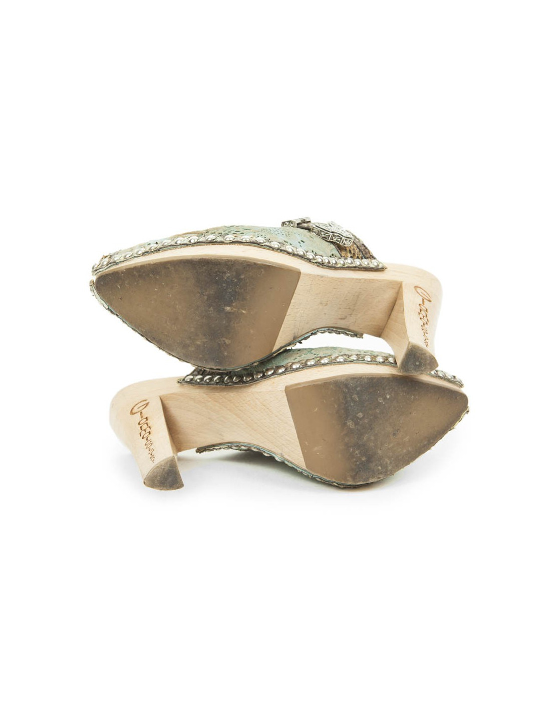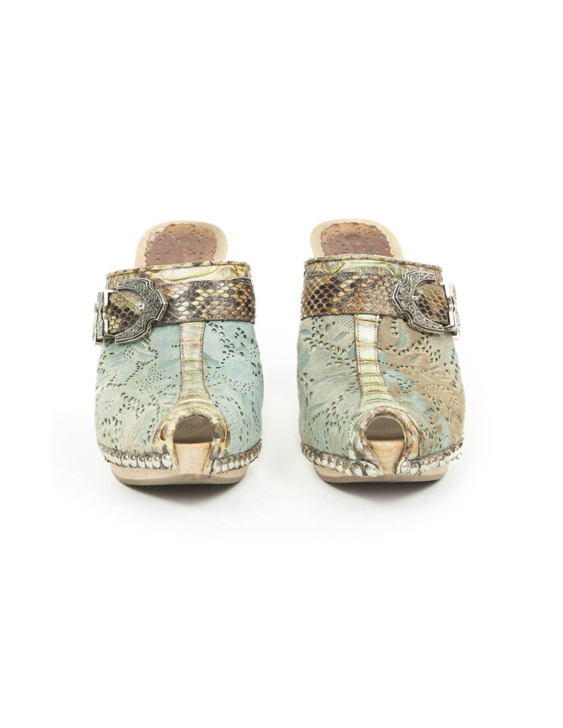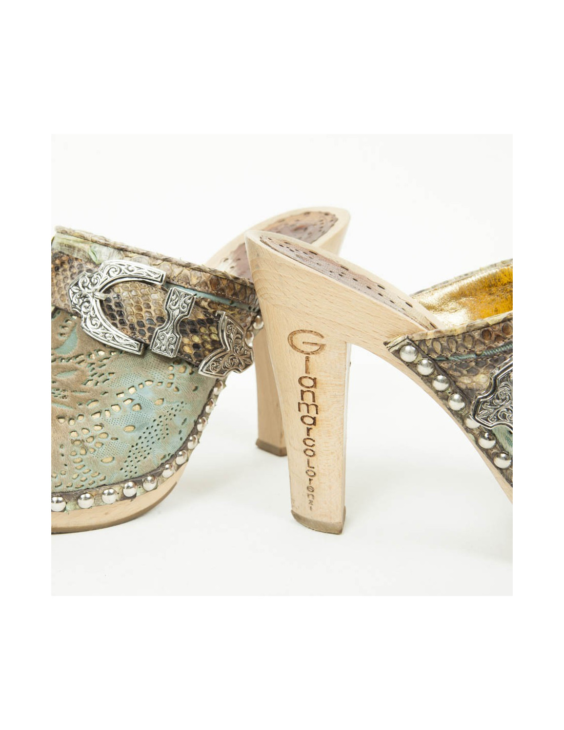Shoes with heels Gianmarco Lorenzi in green and yellow crocodile and python green. Size 8 (39). Natural wooden heels.