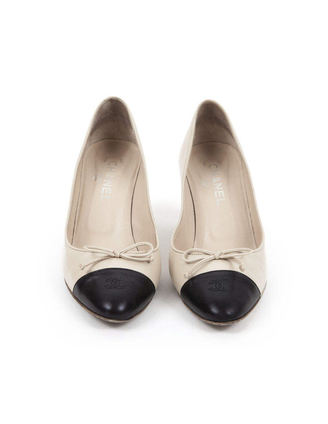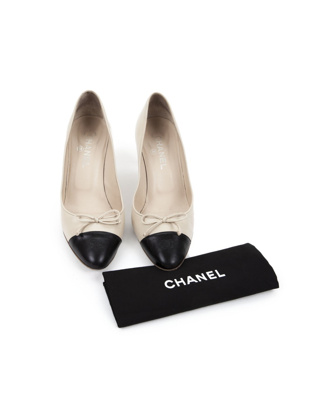 Pumps two-tone Chanel in black and beige leather size 39.5, the front of the shoe is adorned with a small bow, on the black tip is the acronym 'CC'.