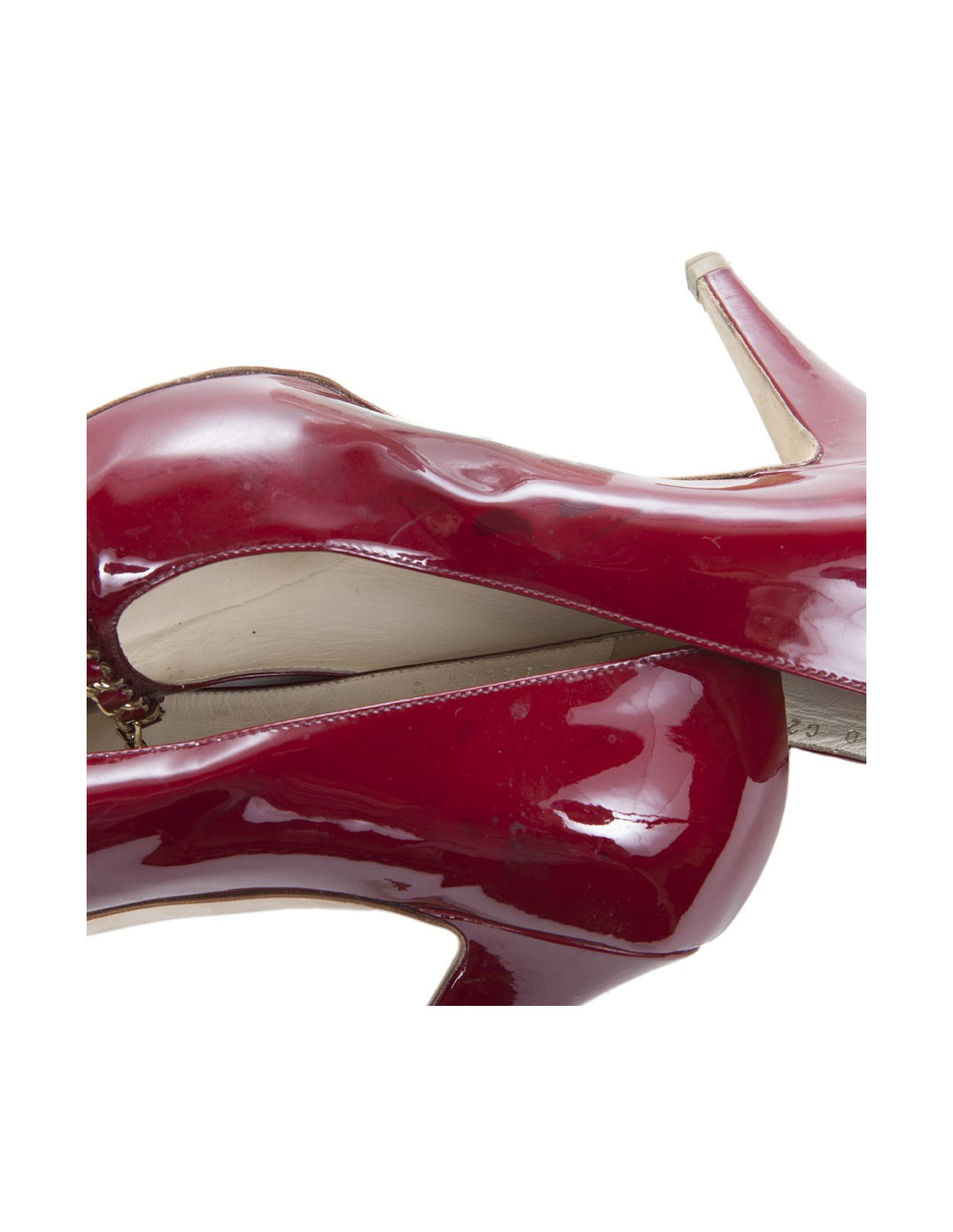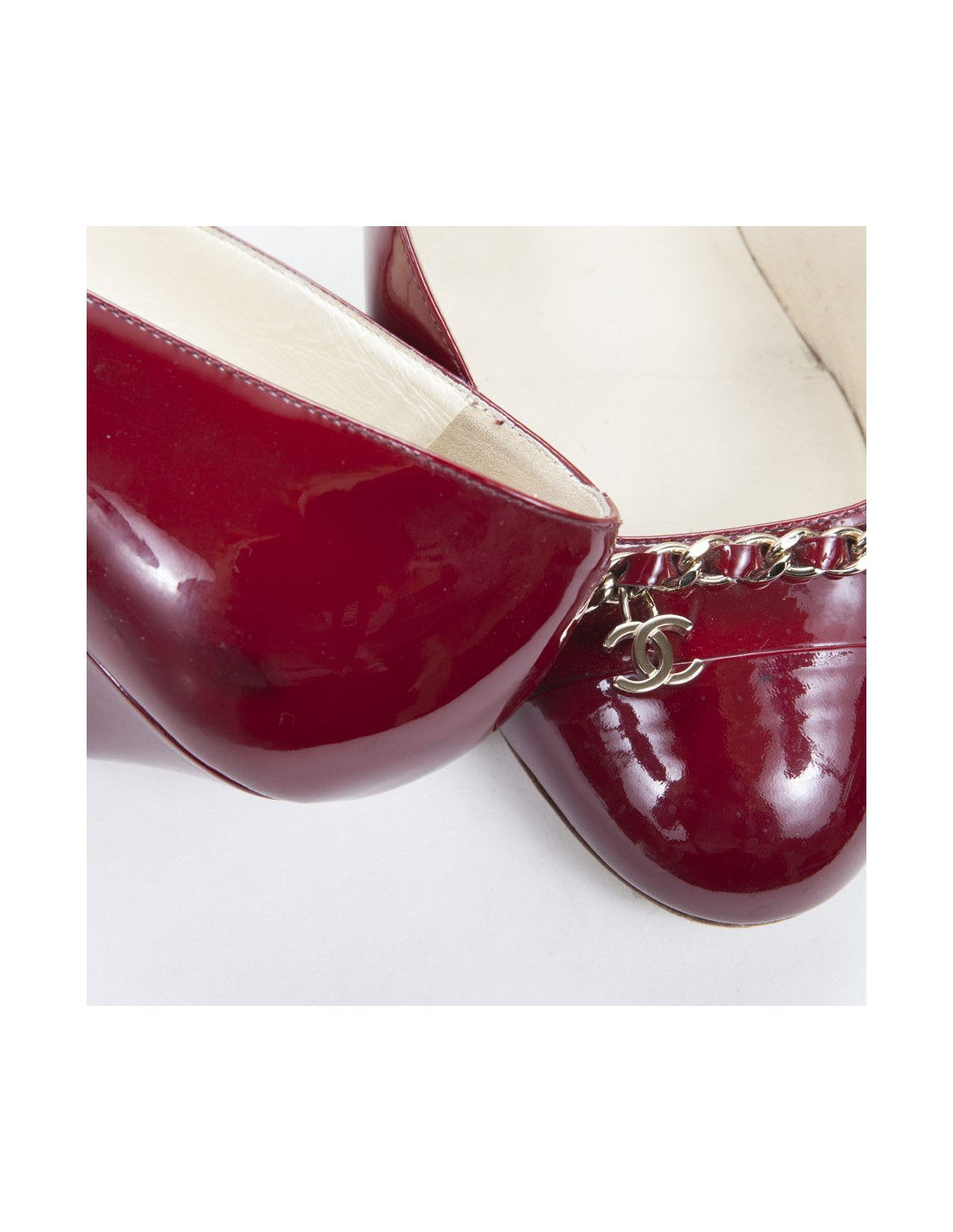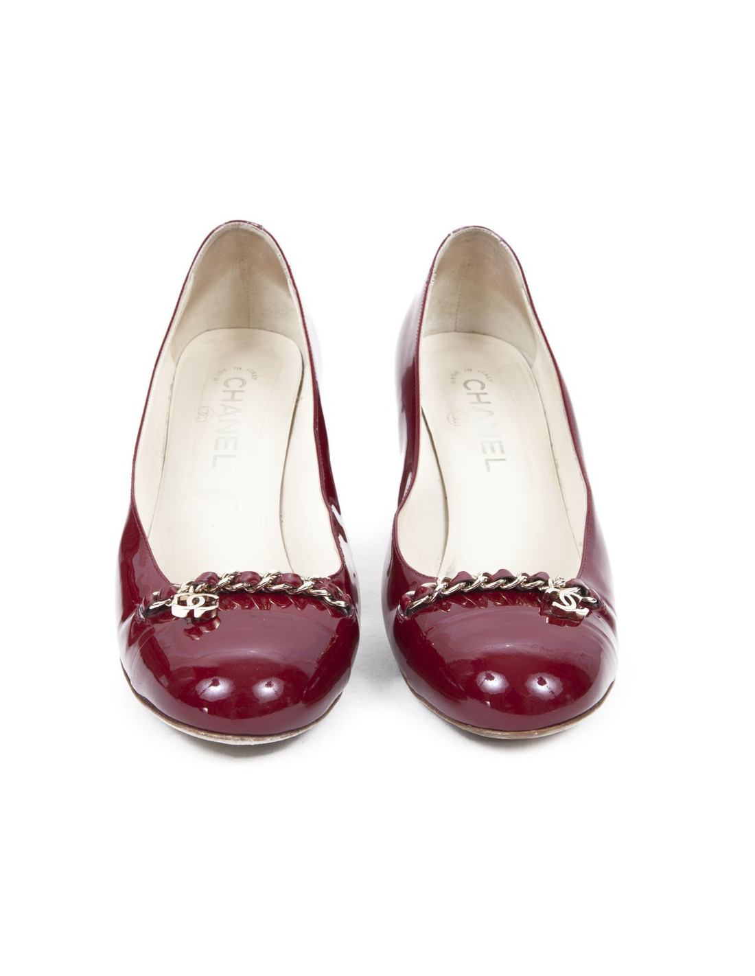 Pumps patent leather Burgundy of the House of Chanel. Size 39.5 C chain Golden at the front with the acronym 'CC'. In good condition: small scratch on the right heel and little dark traces in some places in the leather.