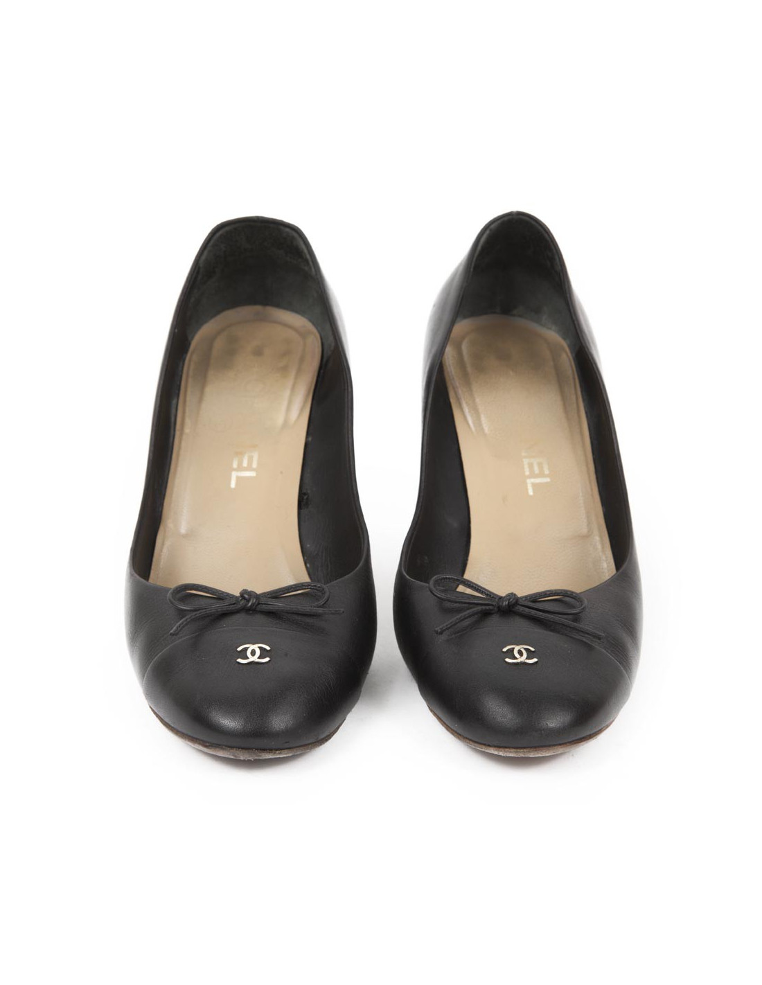 Shoes Chanel leather black T en 39, at the front of the shoe is a node and the tip of the Golden initials "CC".