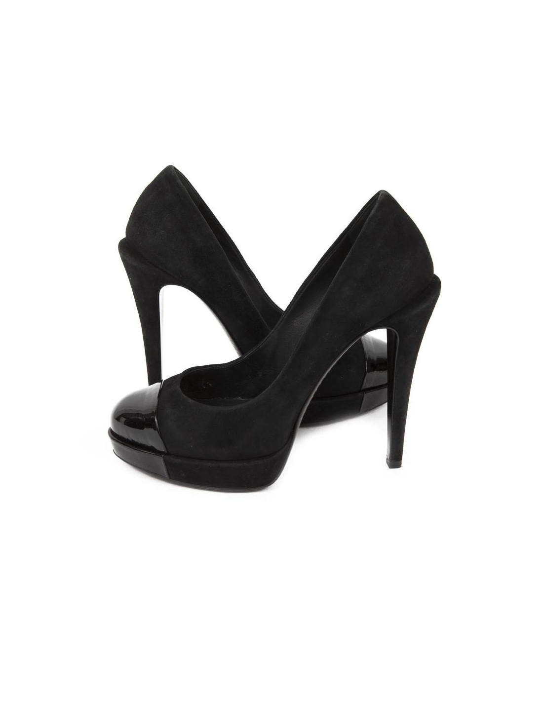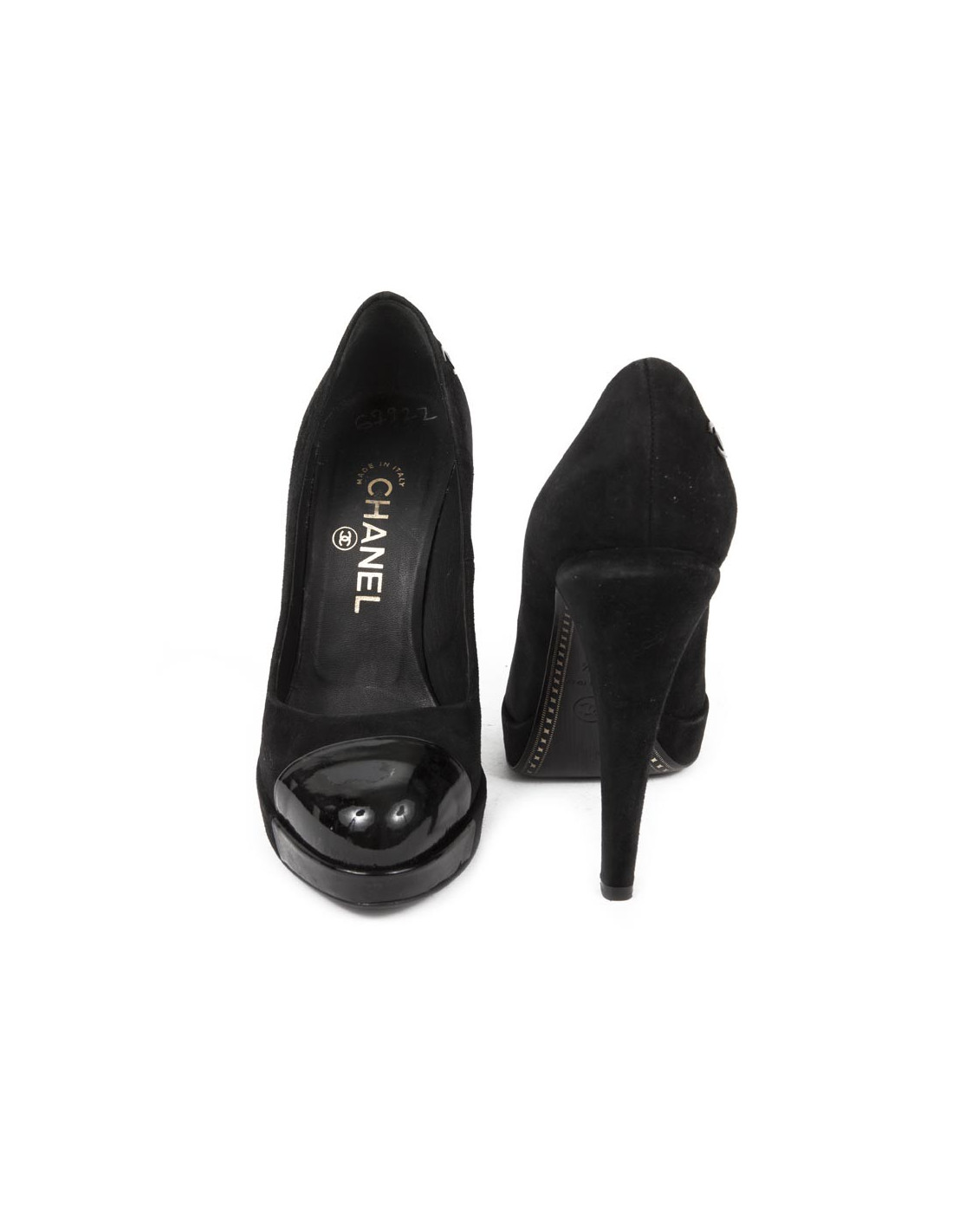 Chanel shoes in suede black T 36, 5 en, the tip of the shoe is black patent leather. The insole is made of black leather, the heel is mounted shifted in, on the back of the shoes we find the acronym 'CC' money.