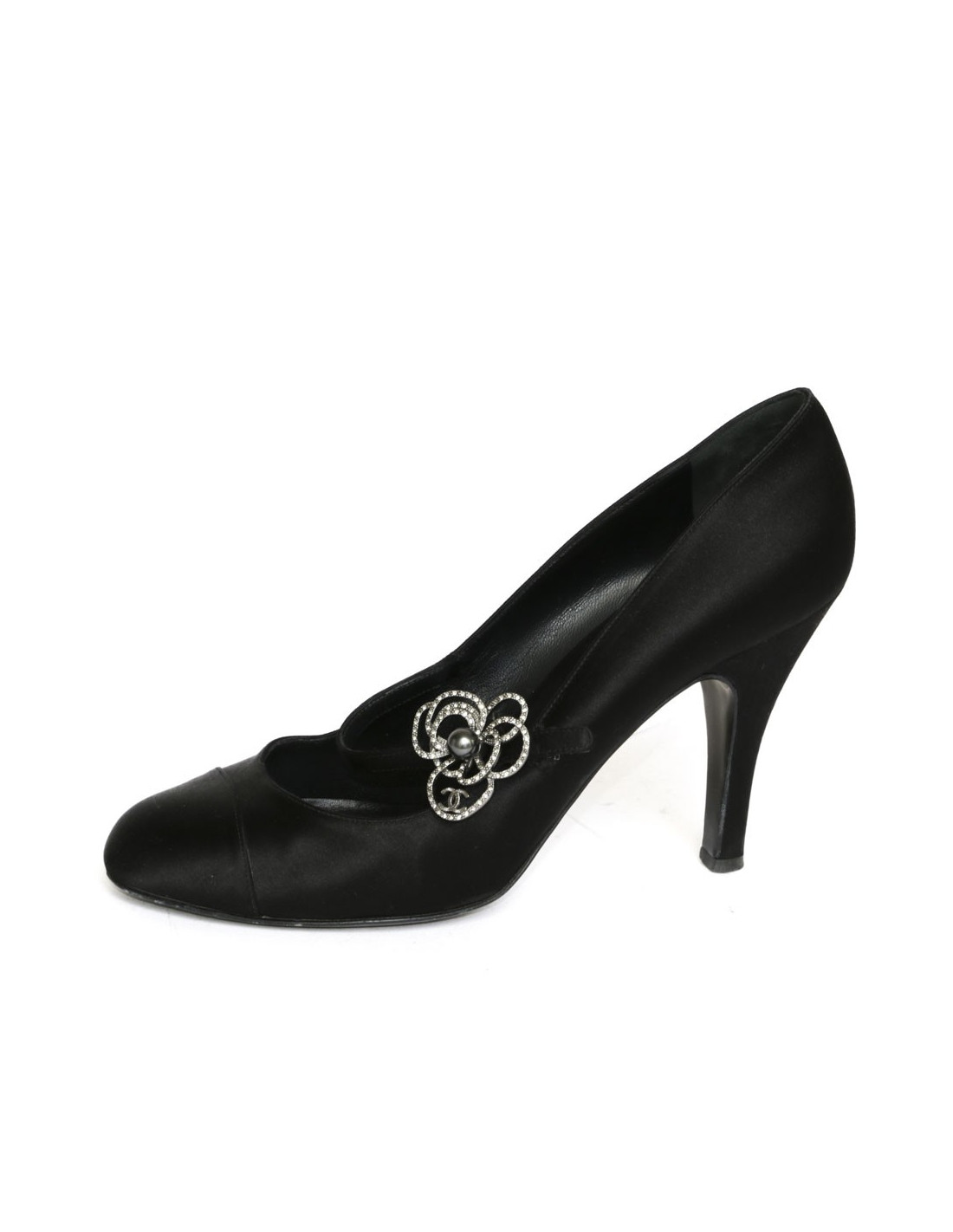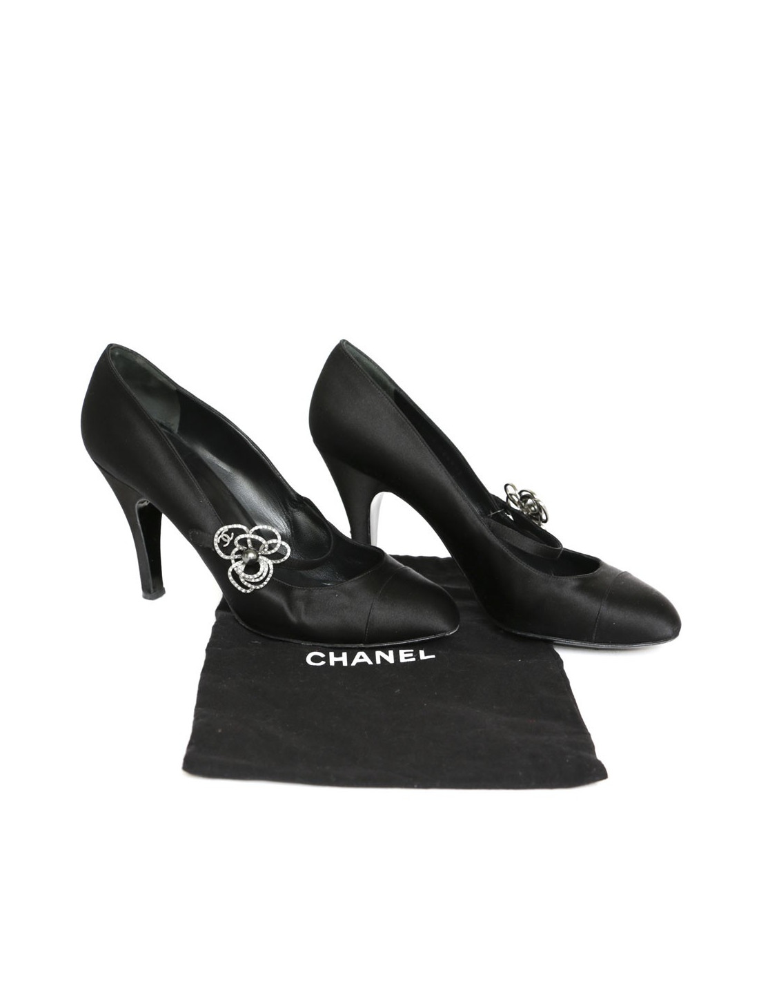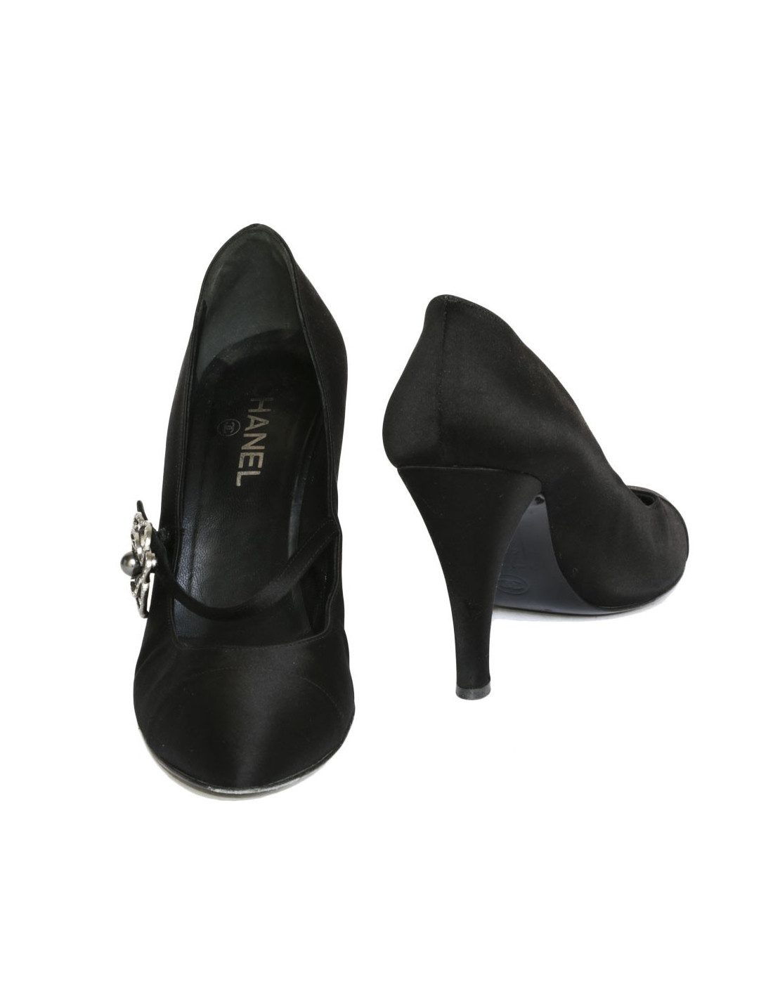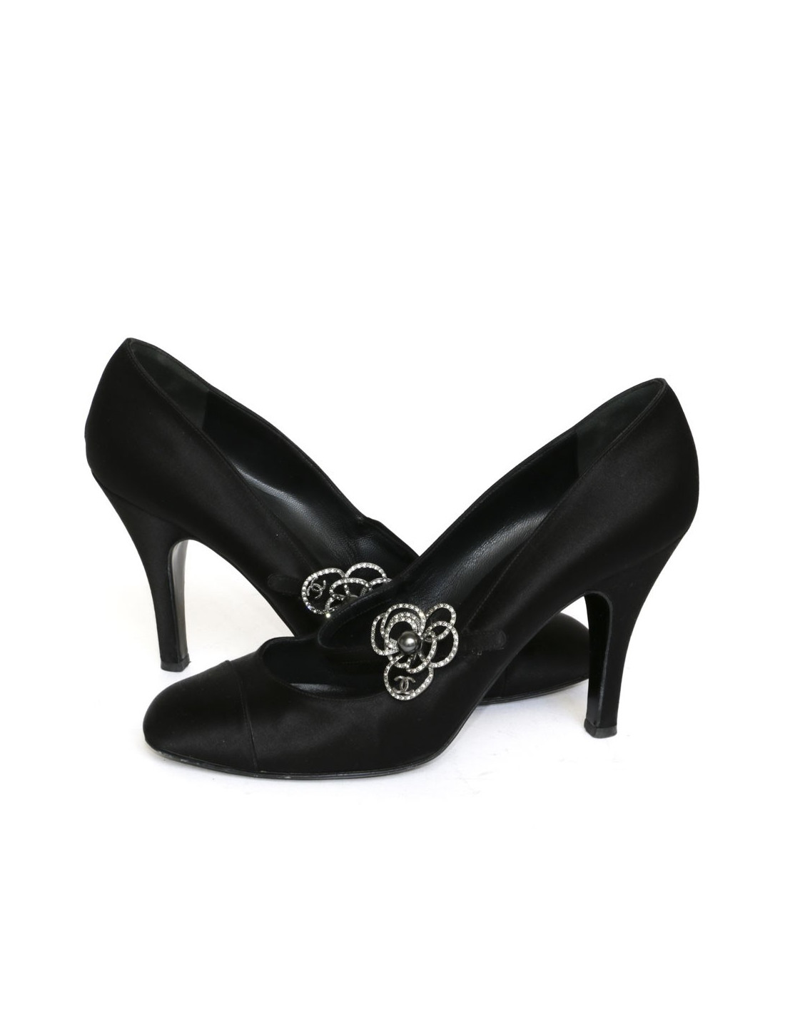 Size 40.5. Camelia set with brilliant with a silver bead and the 'CC' logo on the side. In very good condition. (hitch on the left heel).