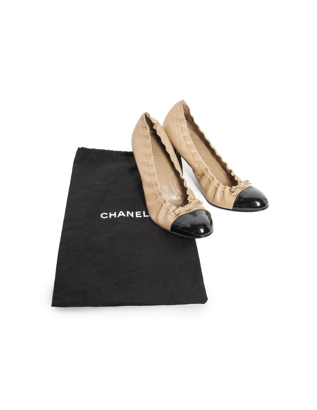 Two-tone CHANEL pumps in black patent leather and beige lamb.