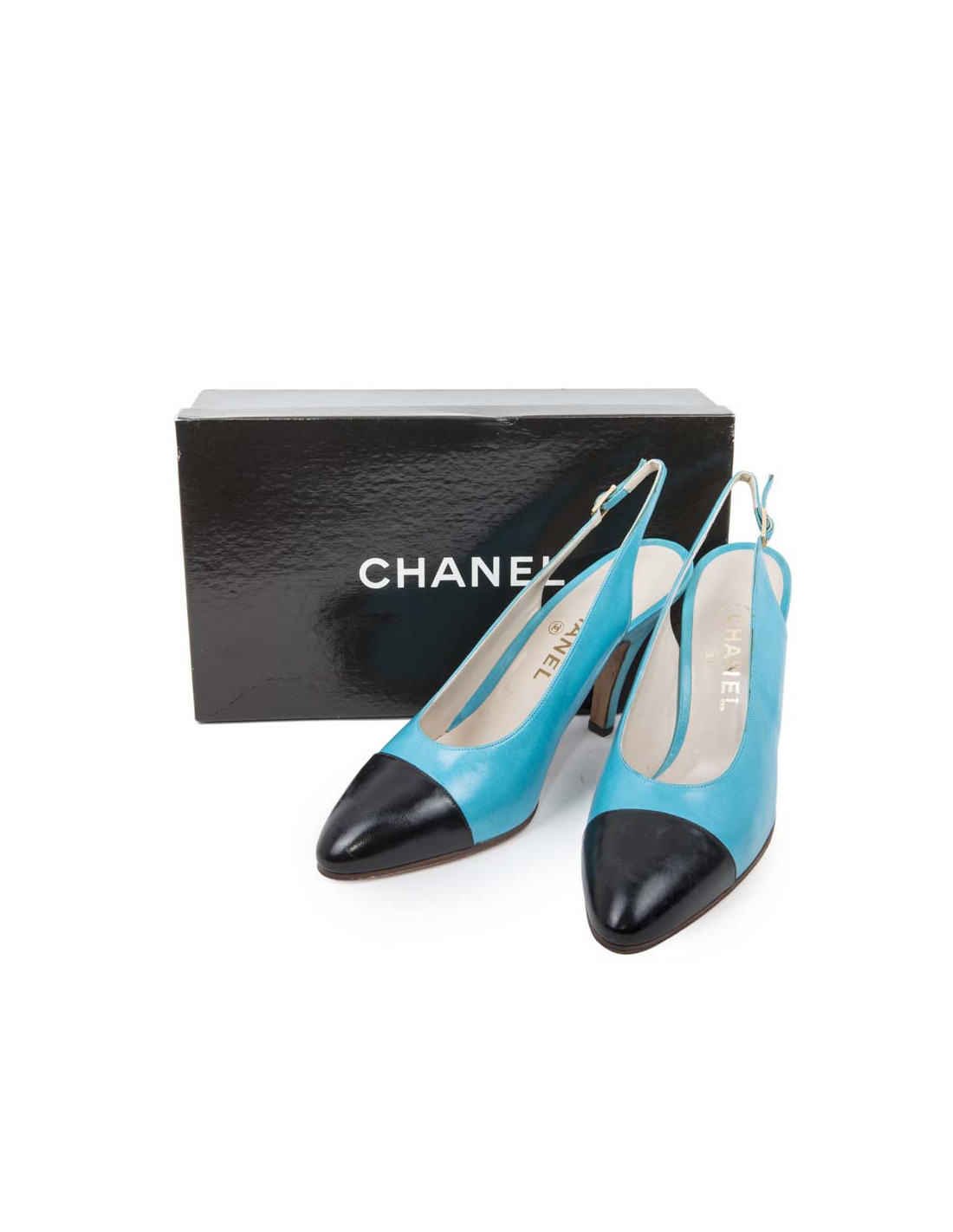 Collector ! Grand classique de la Maison Chanel. Escarpins bicolore en cuir noir et bleu turquoise. Taille 40. Boucles dorées. Etat neuf. Très légères griffures sur le cuir au bout.