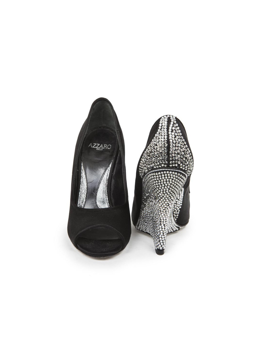 AZZARO wedge heels pumps in black silk satin, embellished with Swarovski crystal on the heel.