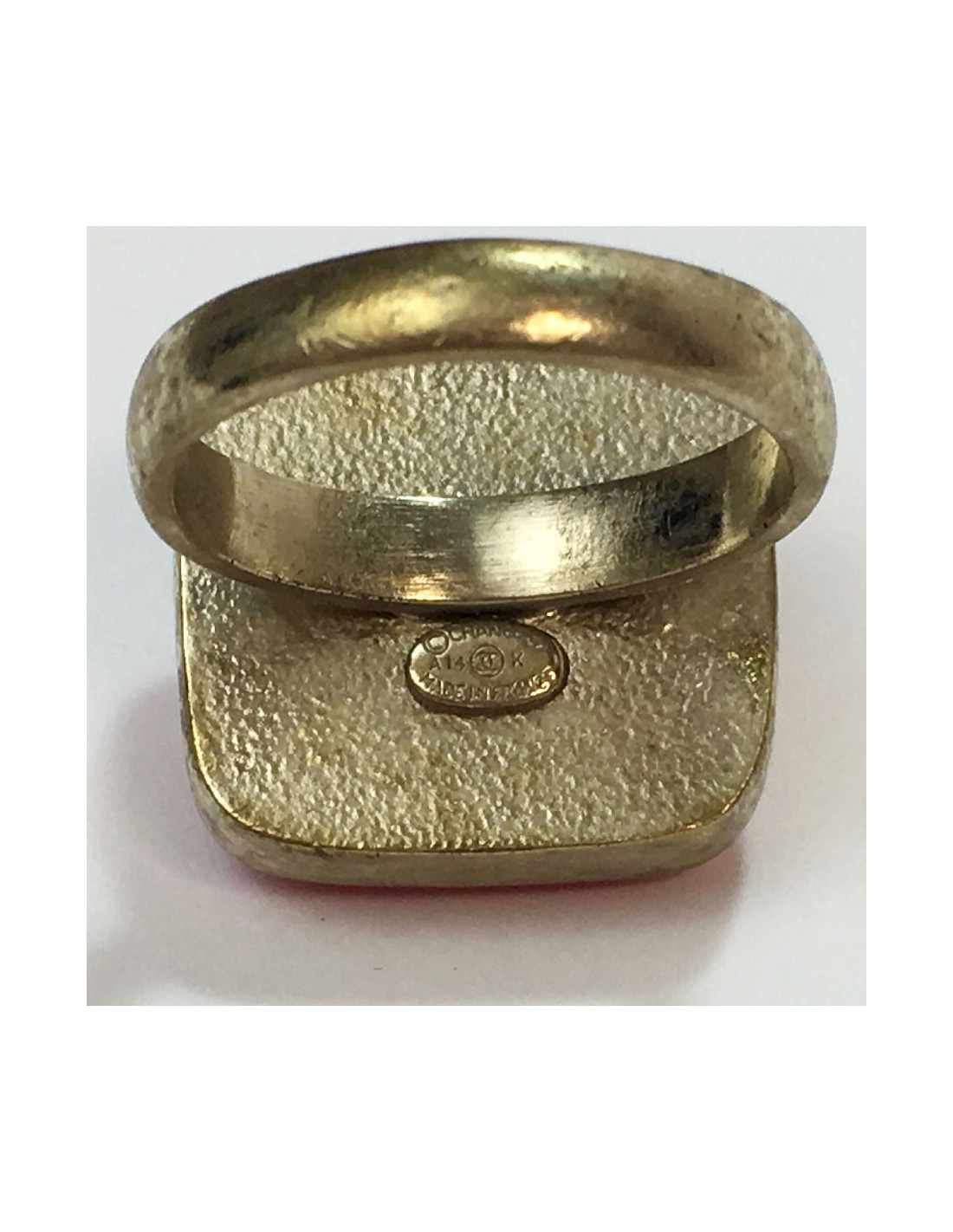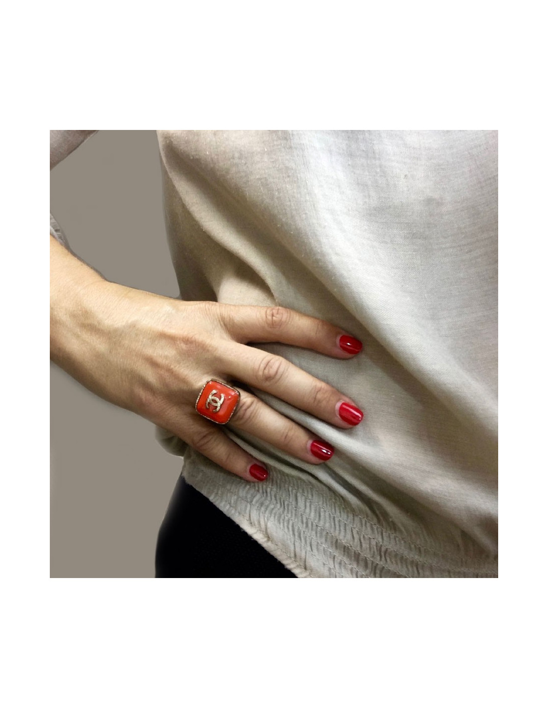 Chanel ring in matte gold metal and coral resin, overhung with a golden CC, T51.