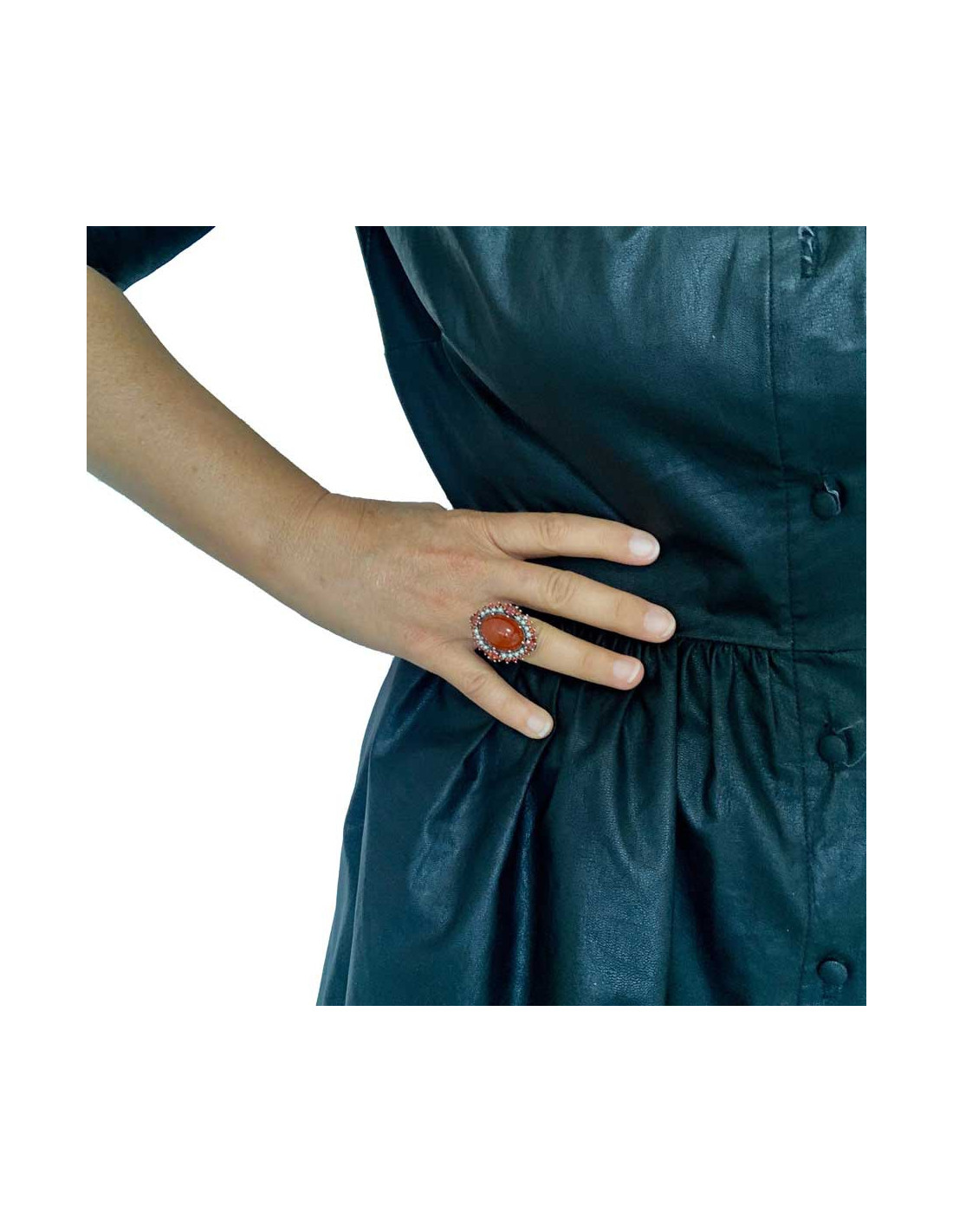 Magnificent antique ring whose central element is a magnificent orange stone that appears to be carnelian, domed and oval-cut. Its entire contour is set with red brilliants and small pearly pearls.