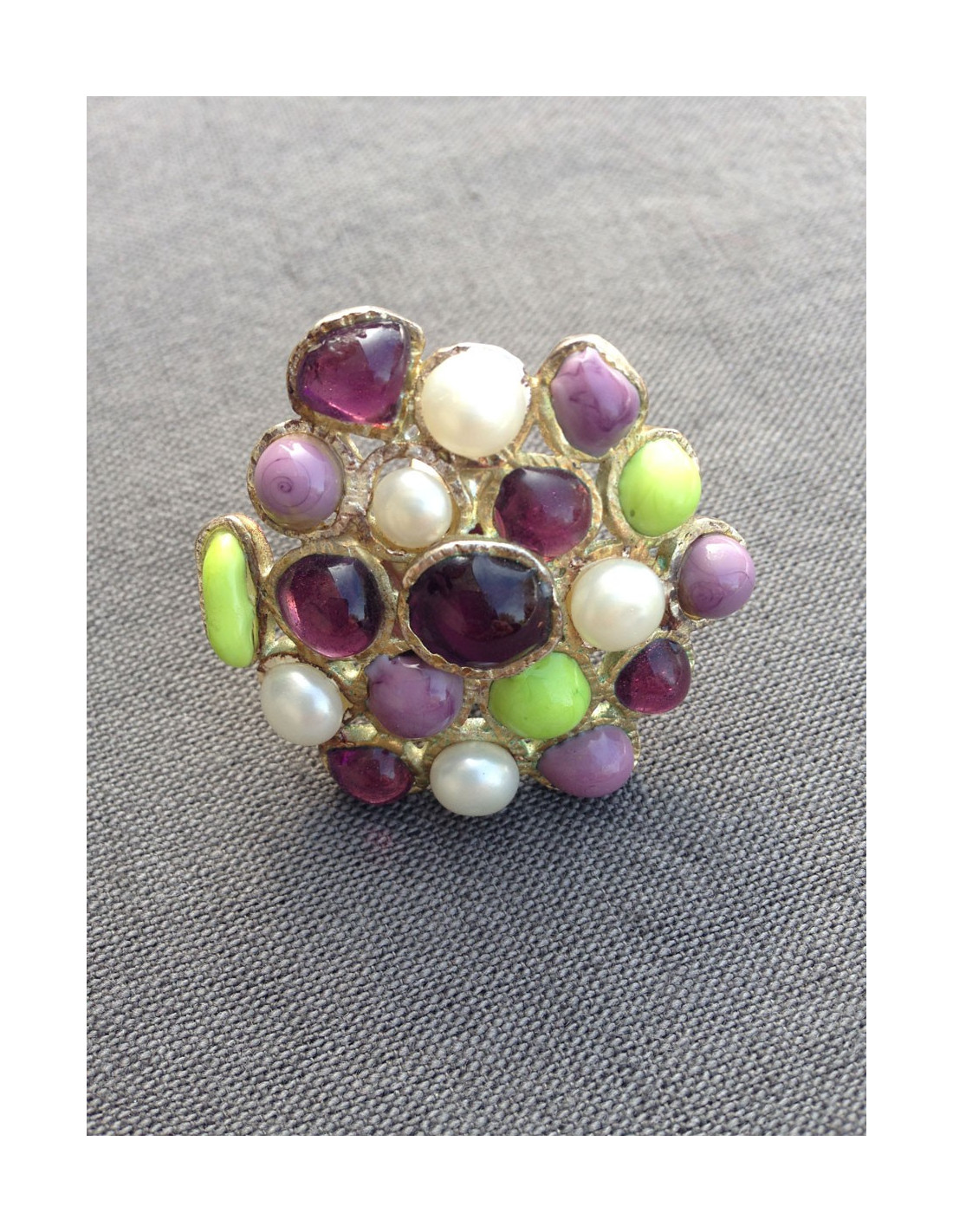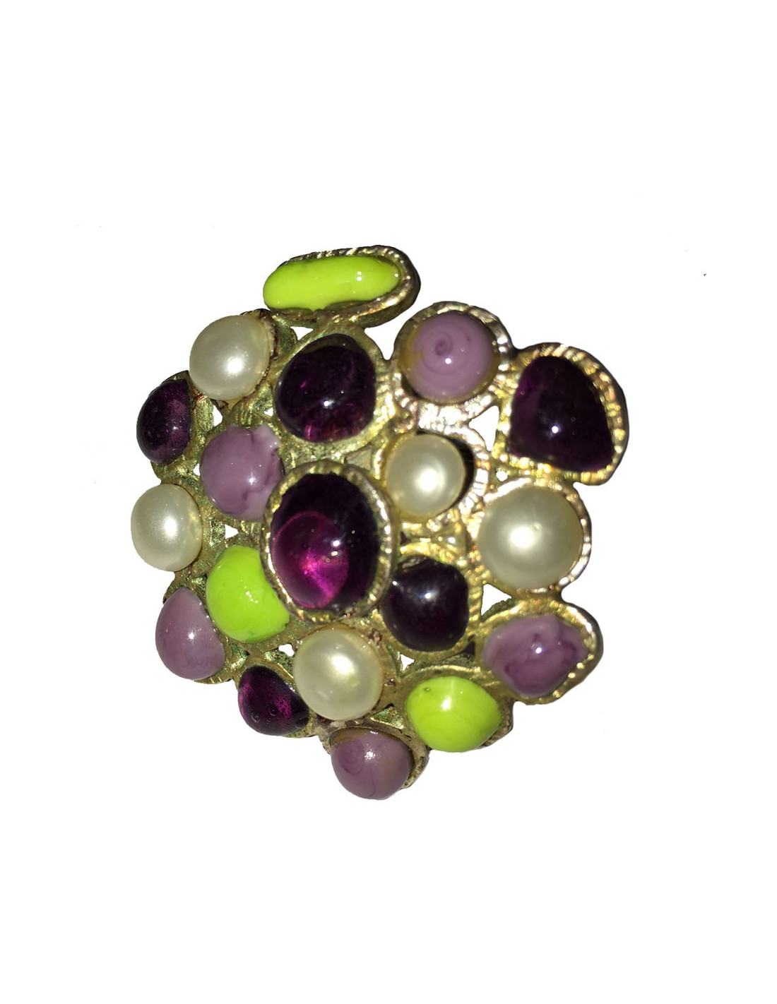 Ring style Byzantine Marguerite de Valois purple glass transparent, aniseed green and purple translucent and Pâte de verre pearly, all mounted on metal Golden to pale gold.
