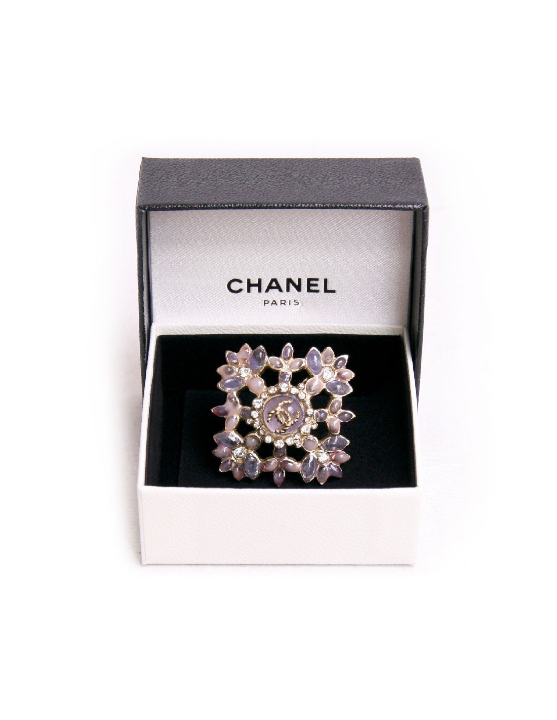 Beautiful ring 54 adjustable t gold Golden pale, of the House of Chanel, paste of glass Amethyst, pink and Rhinestones, square shape, surmounted by a double "C". She is in very good condition. Measures: 3 cm x 3 cm-Jever reach.