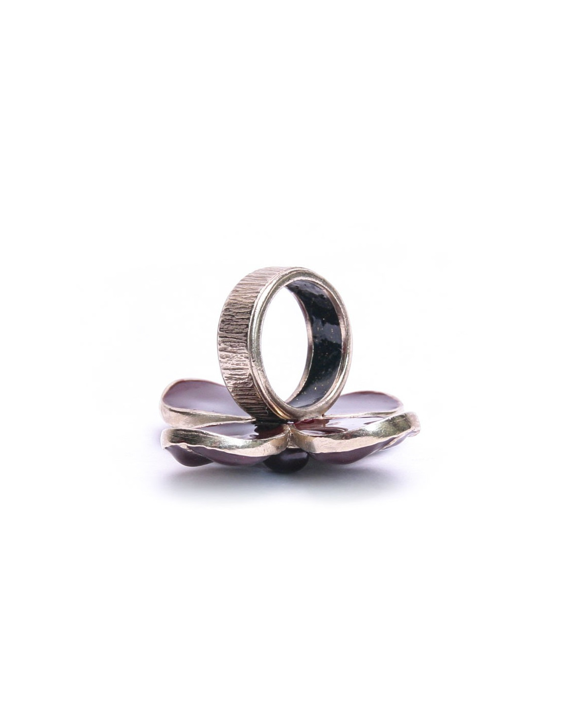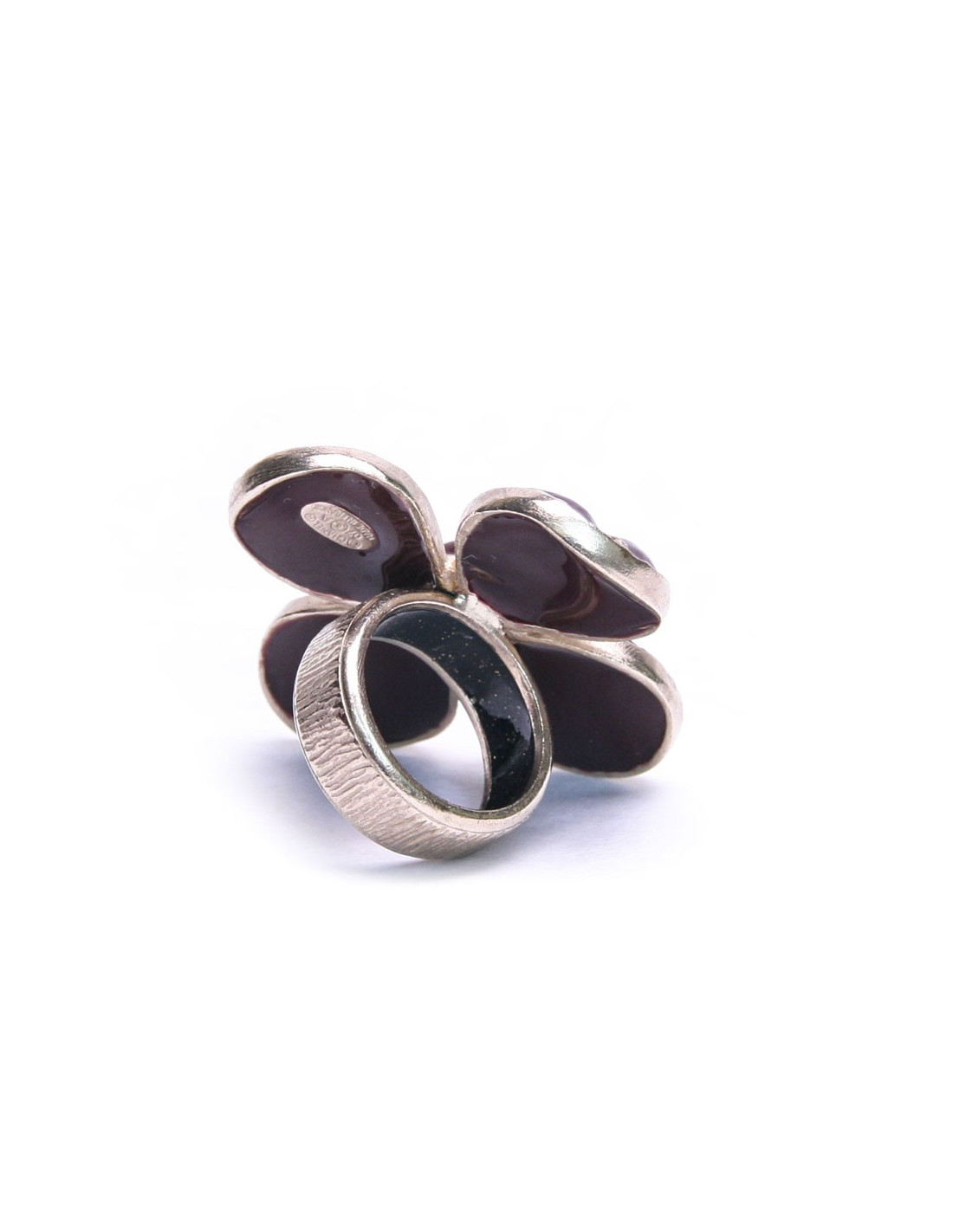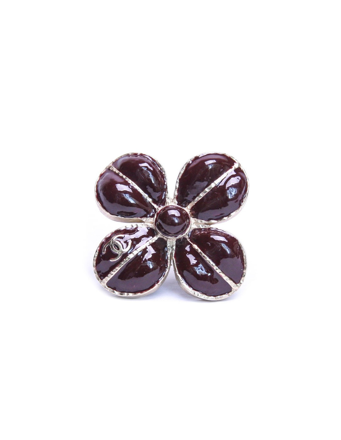 Ring CHANEL flower-shaped, Brown resin and silver age. This CC on a petal. The inside of the ring is in glittery black enamel. The ring is streaked on the tour. Collection autumn winter 2007. Size 51. In very good condition.
