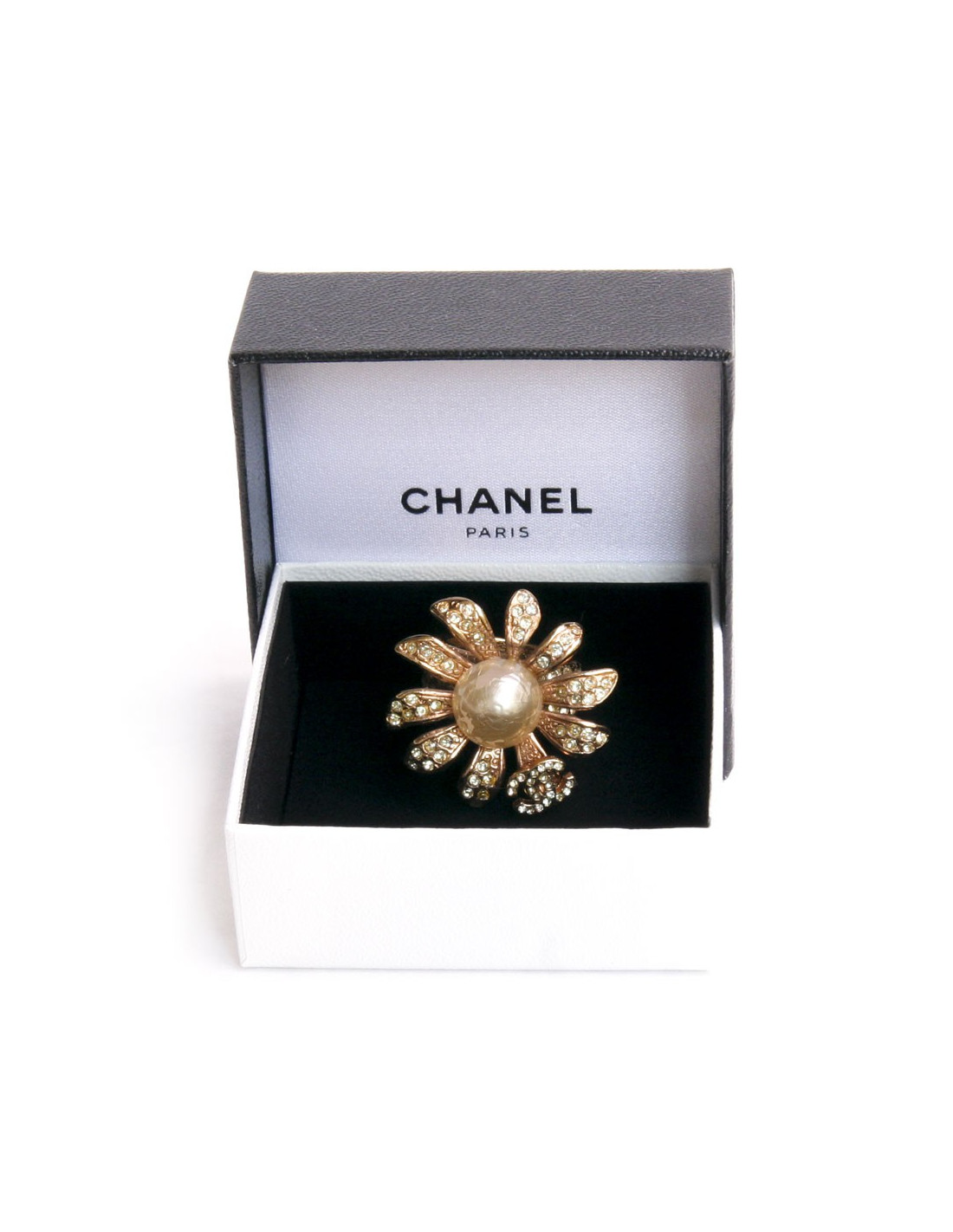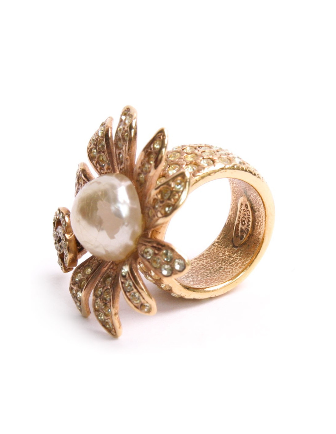 Ring size 54 Chanel couture, collection 05/A (fall 2005), representing a daisy gold and set with Rhinestones with a double on a petal. At the Center, a half Pearl Pearl glass paste. The ring is also set with Rhinestones. She is in very good condition