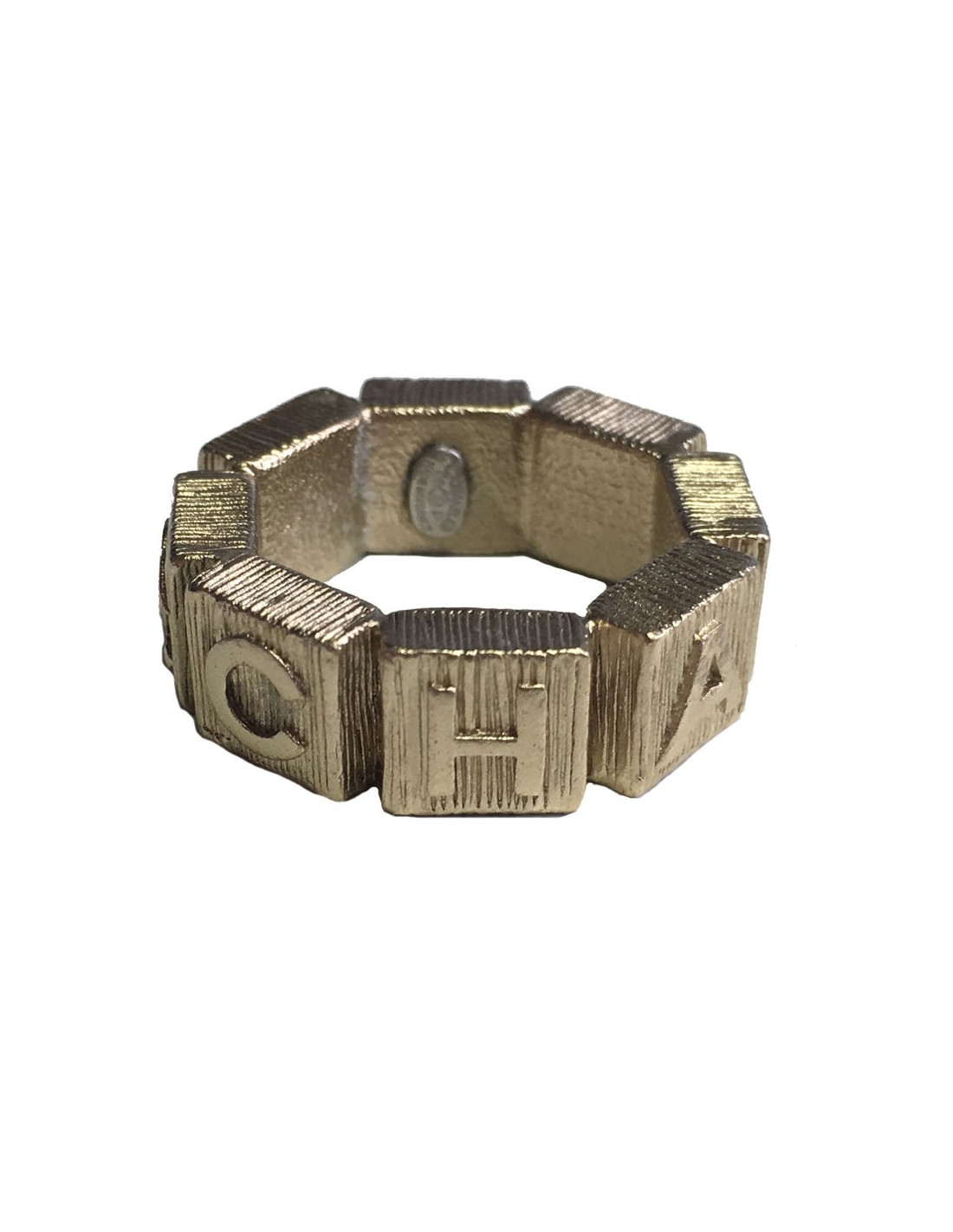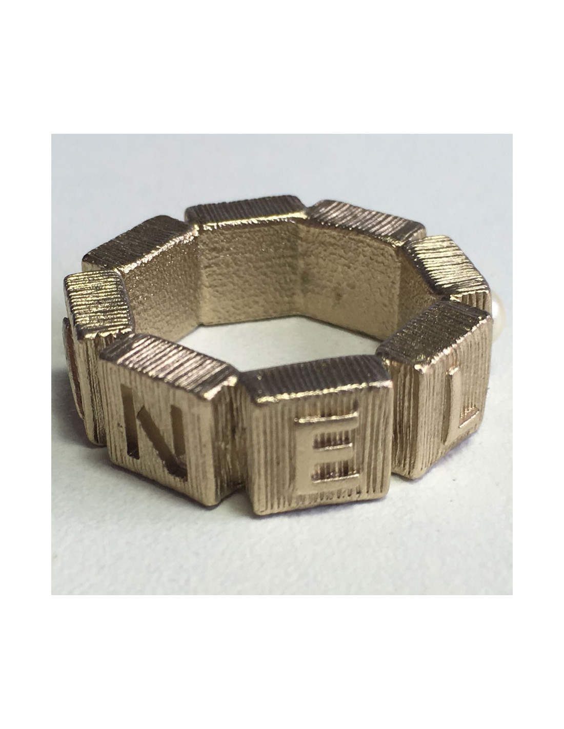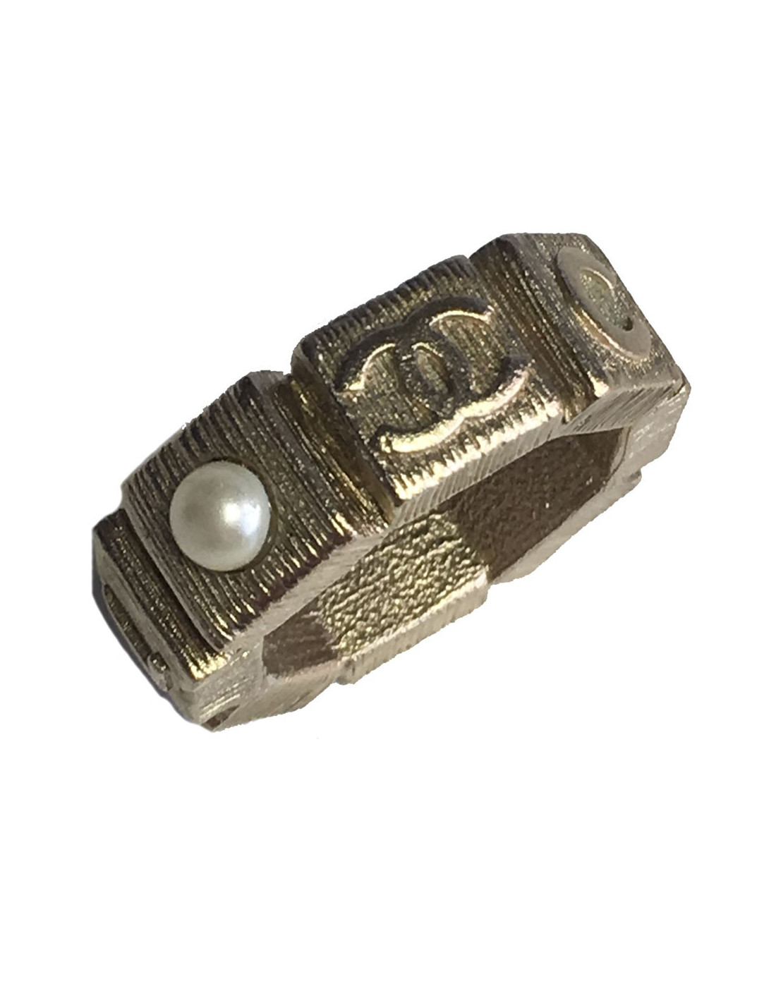 Beautiful metal color ring CHANEL pale hammered gold set with a little Pearly Pearl. A CC and CHANEL on the back of the ring. In very good condition. Lozenge of the brand presents.