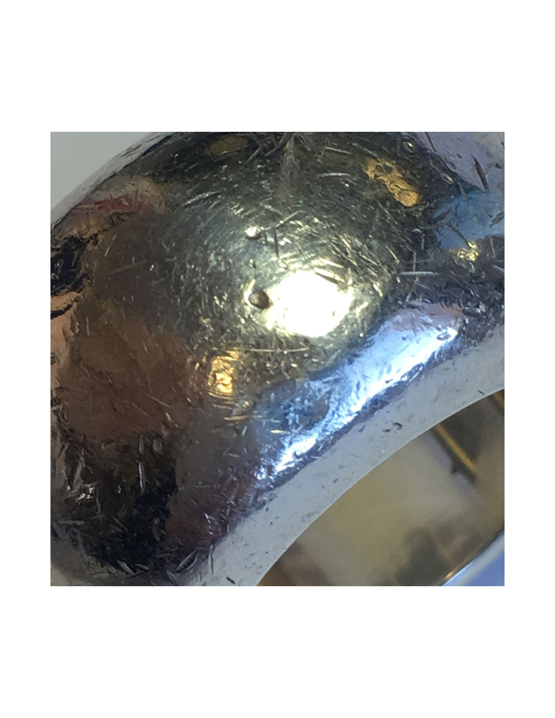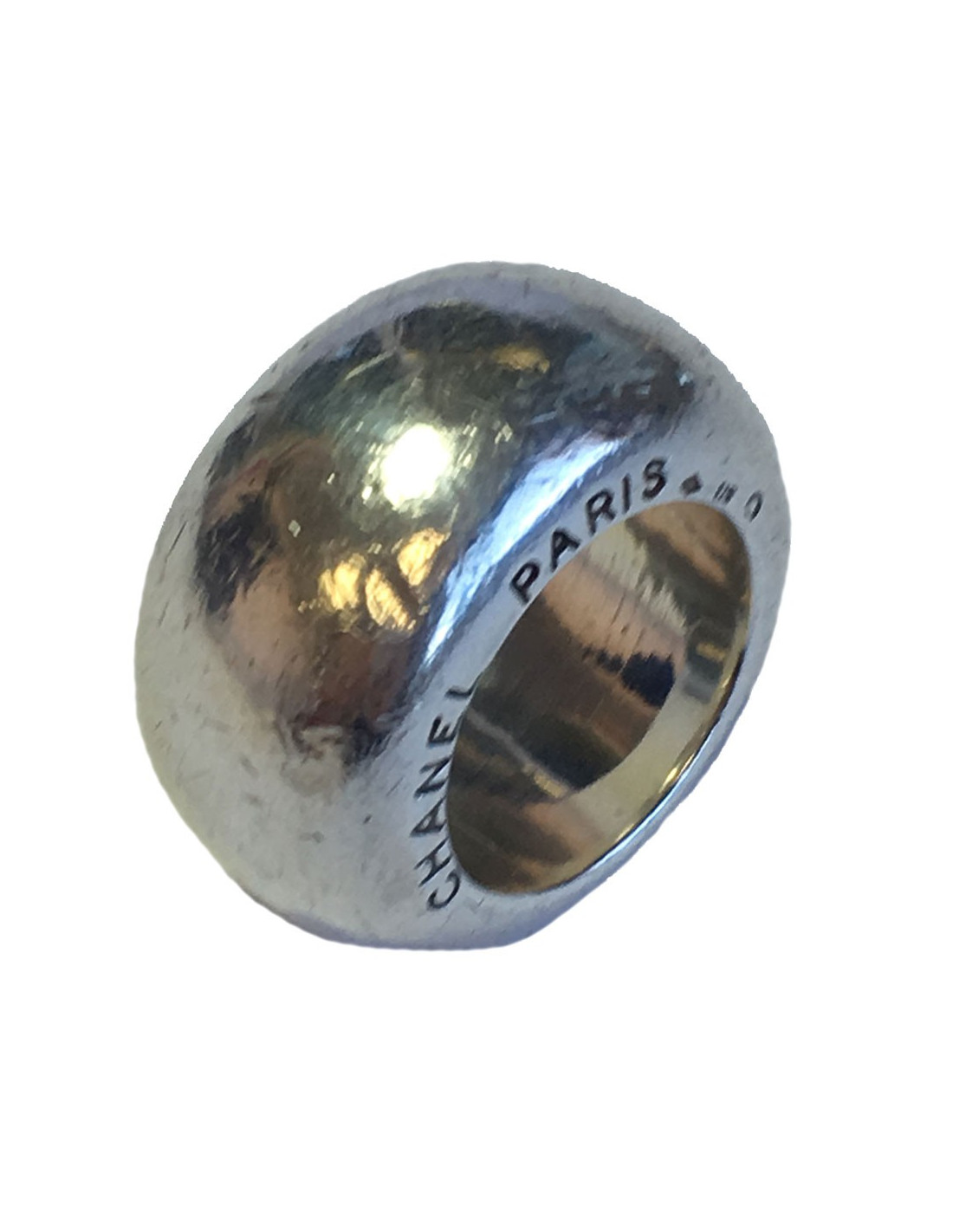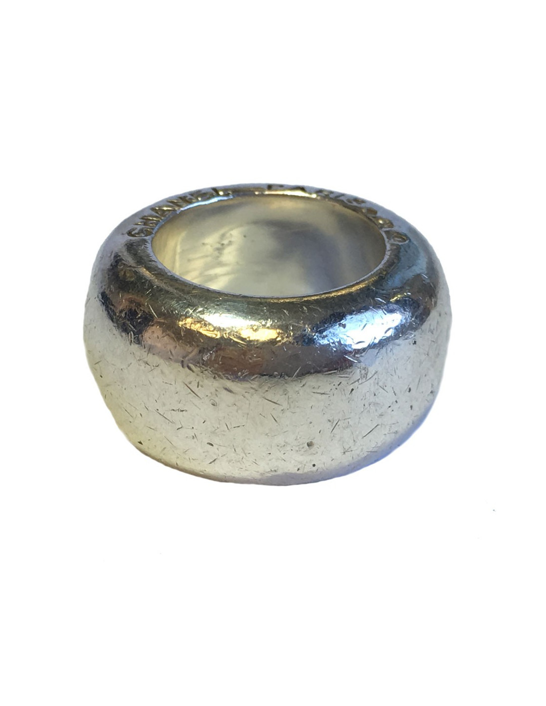 CHANEL ring in sterling silver (hallmark), size 52.5 cm. CHANEL PARIS inscription on the outline. non-smooth effect on the entire ring. A small depression on a small part of the ring (see photo)