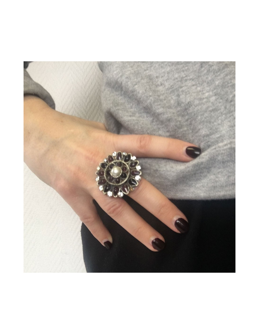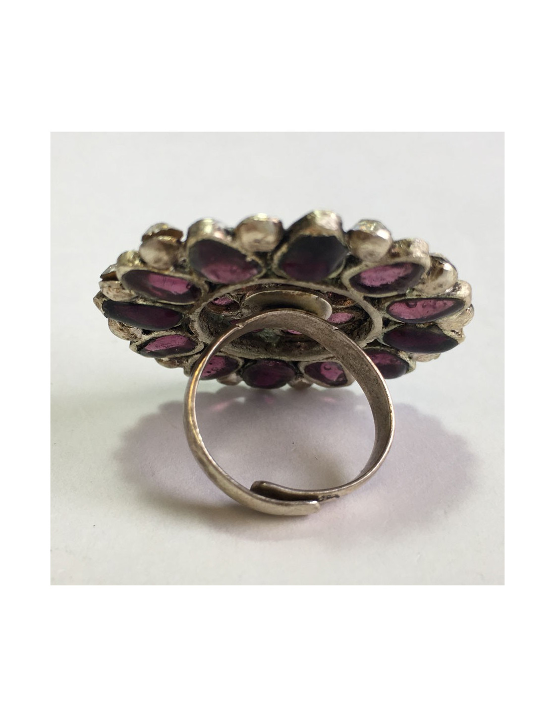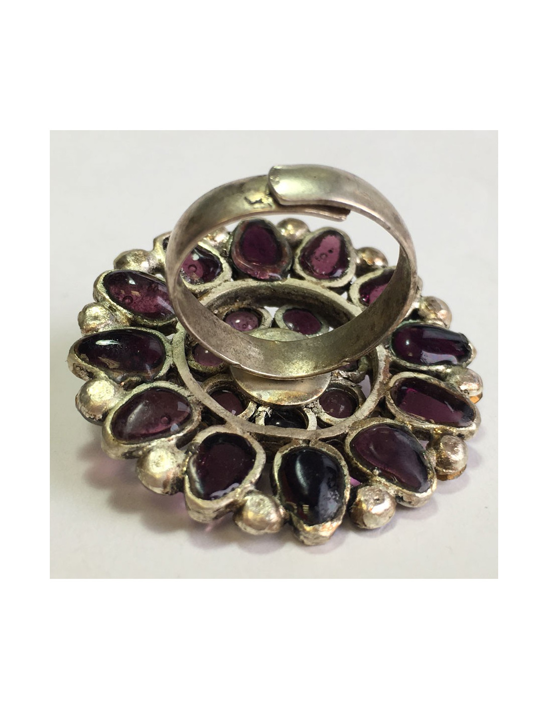 Ring MARGUERITE of VALOIS round purple glass paste, rhinestone and Pearl Pearl T53