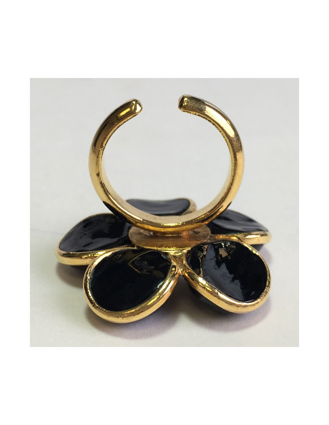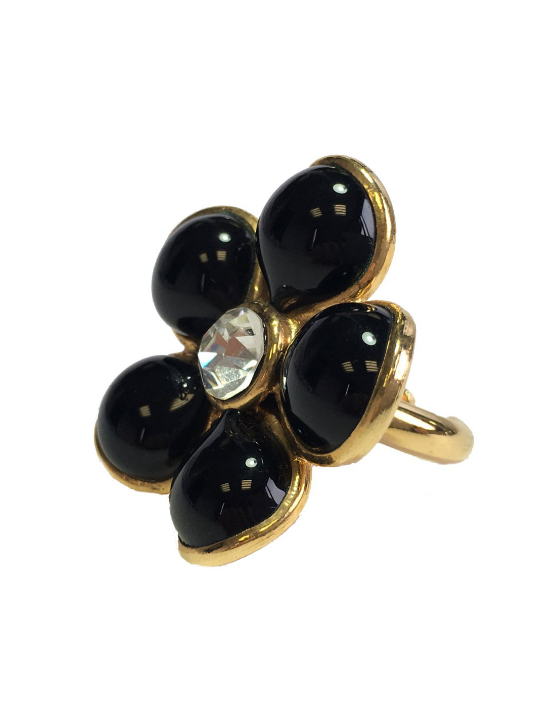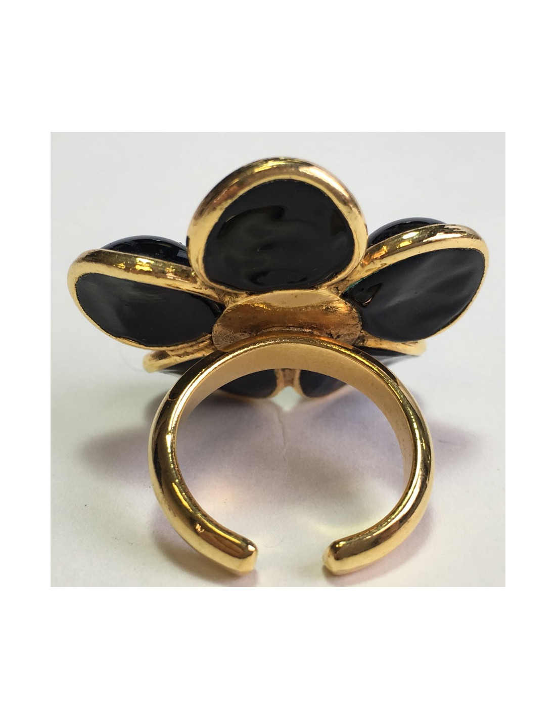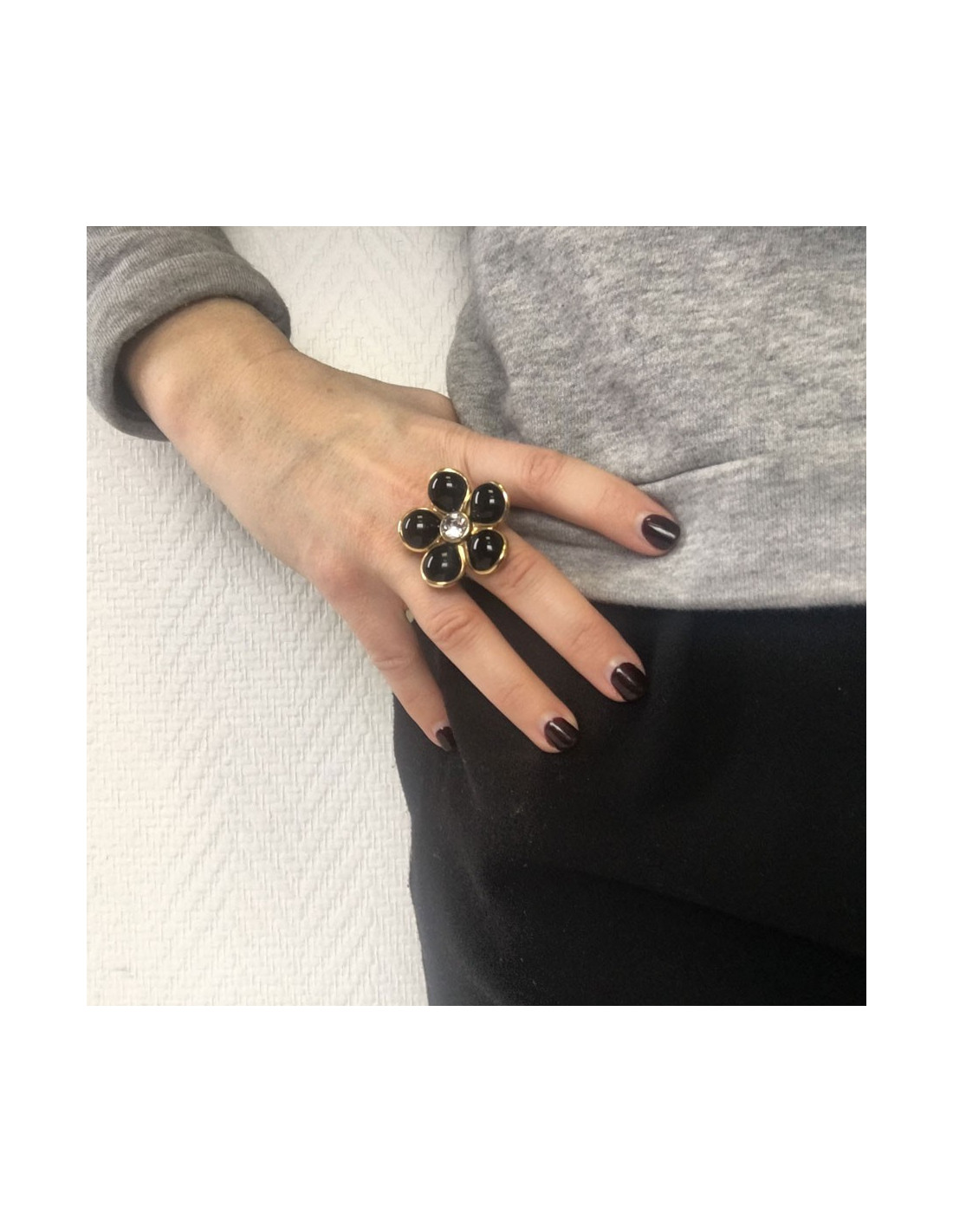 Marguerite de Valois flower ring in black molten glass, a rhinestone in the center. Gold metal with fine gold.