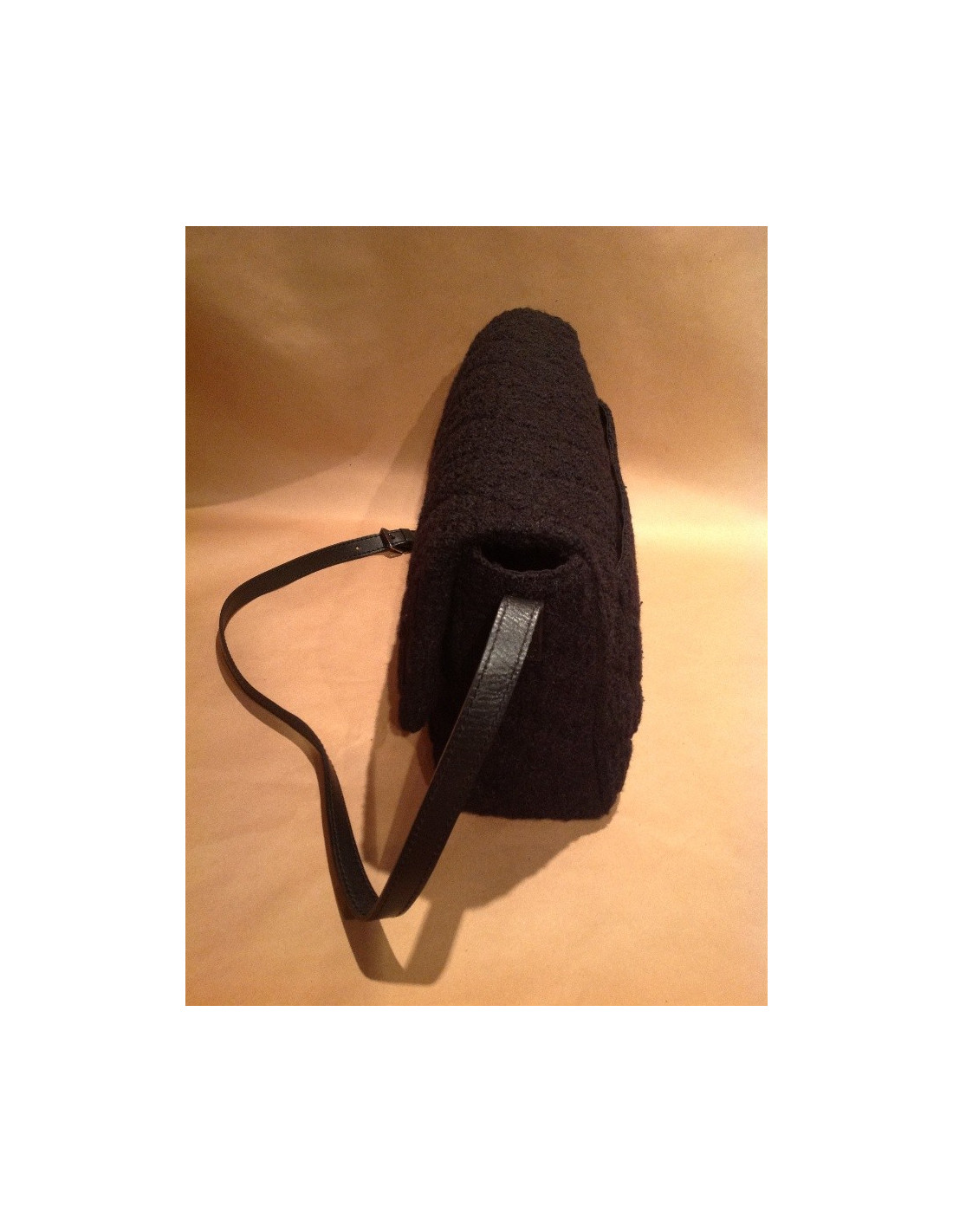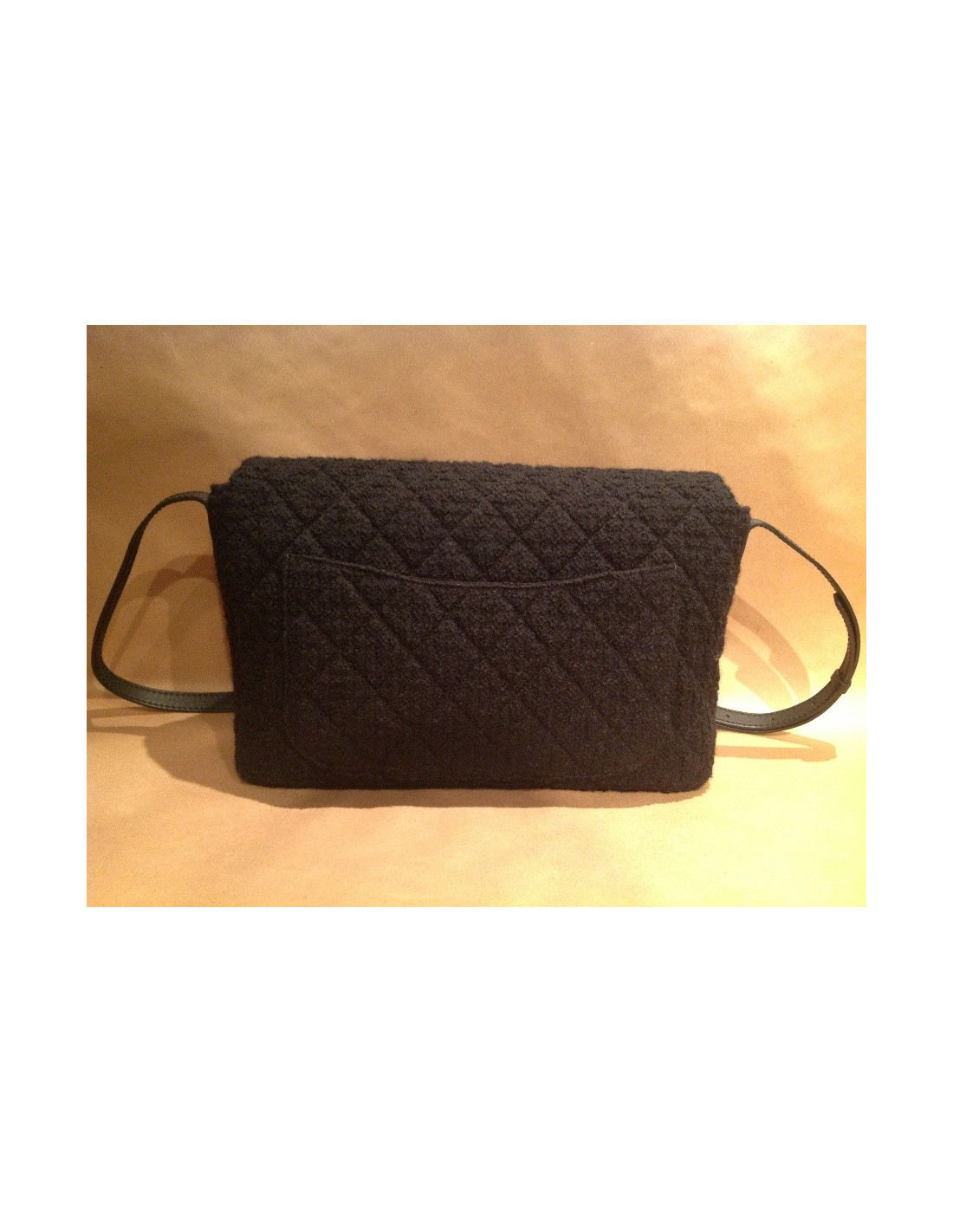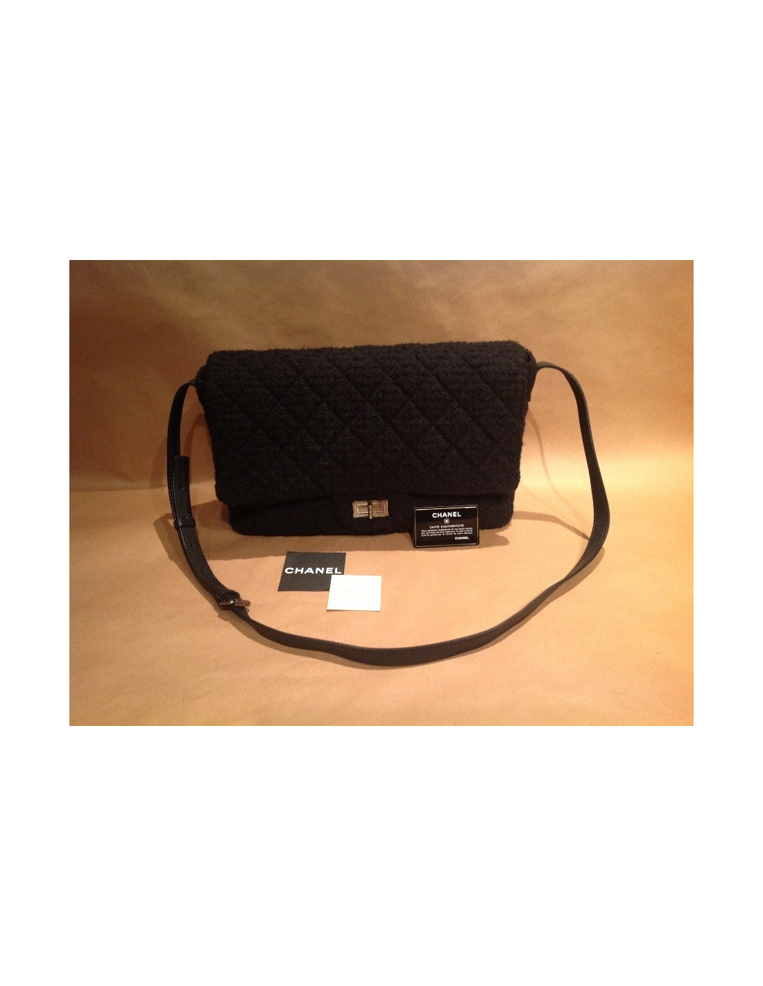 Very large satchel in black tweed quilted CHANEL 2.55 bag. The jewelry is aged silver metal, the inner lining is in Black canvas. There are 3 inside including one zippered pockets and a pocket on the back of the bag outdoor. The strap is black leather, it is adjustable and is 120 cm long.