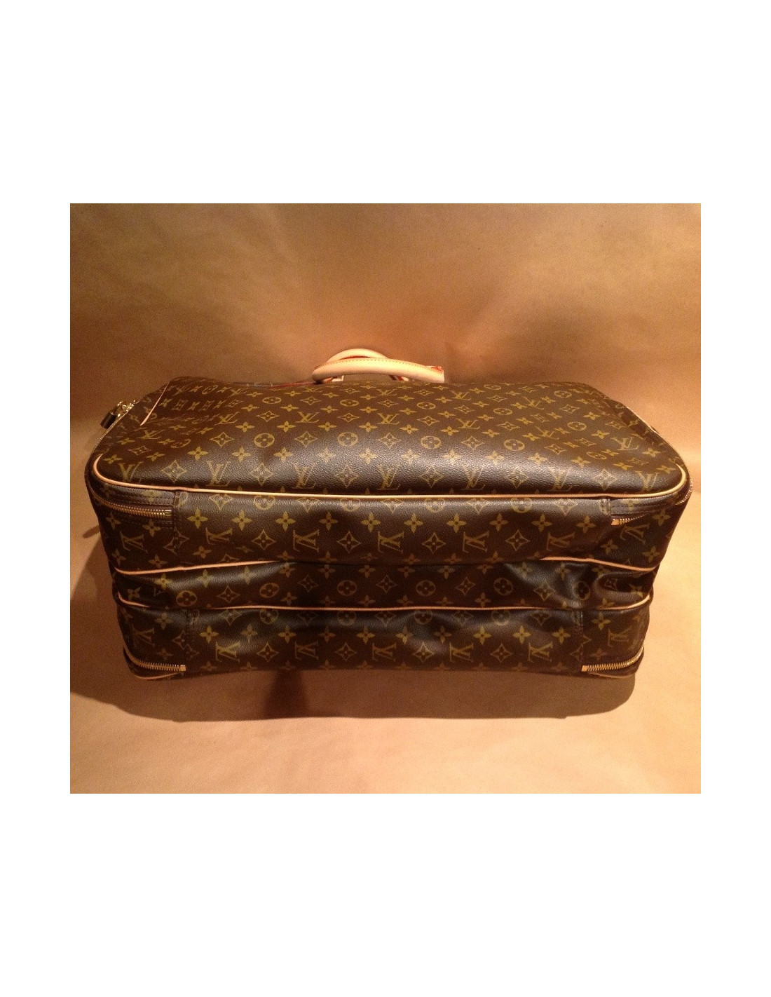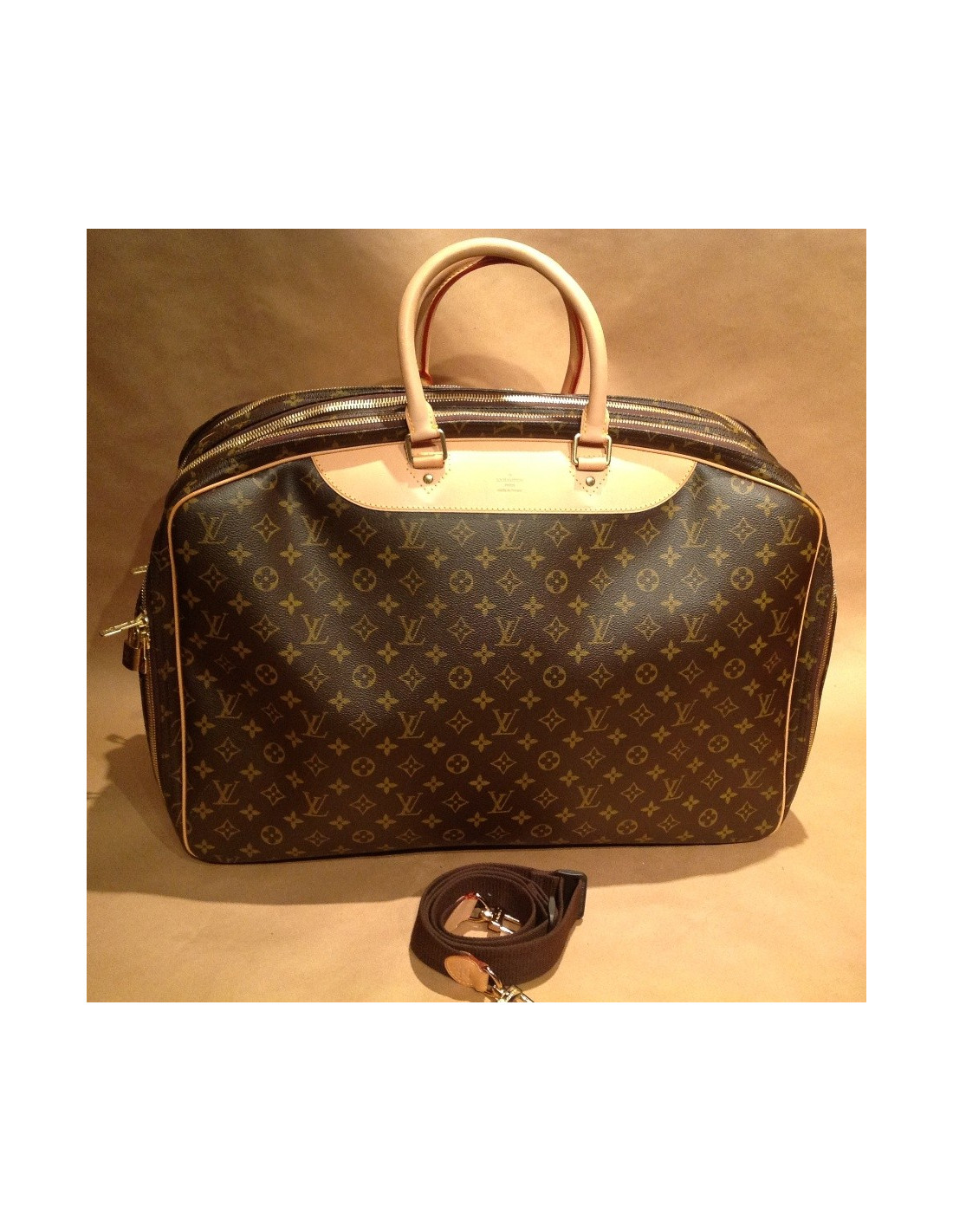 Beautiful Alizé 3 suitcase pockets in coated Canvas Monogram LV LOUIS VUITTON. Exceptional piece from a special order dating back to 2006. Perfect compromise between a light bag and a suitcase, he has 3 compartments closed with zipper closures. The jewelry is made of gilded brass, handles and amenities are natural cowhide.