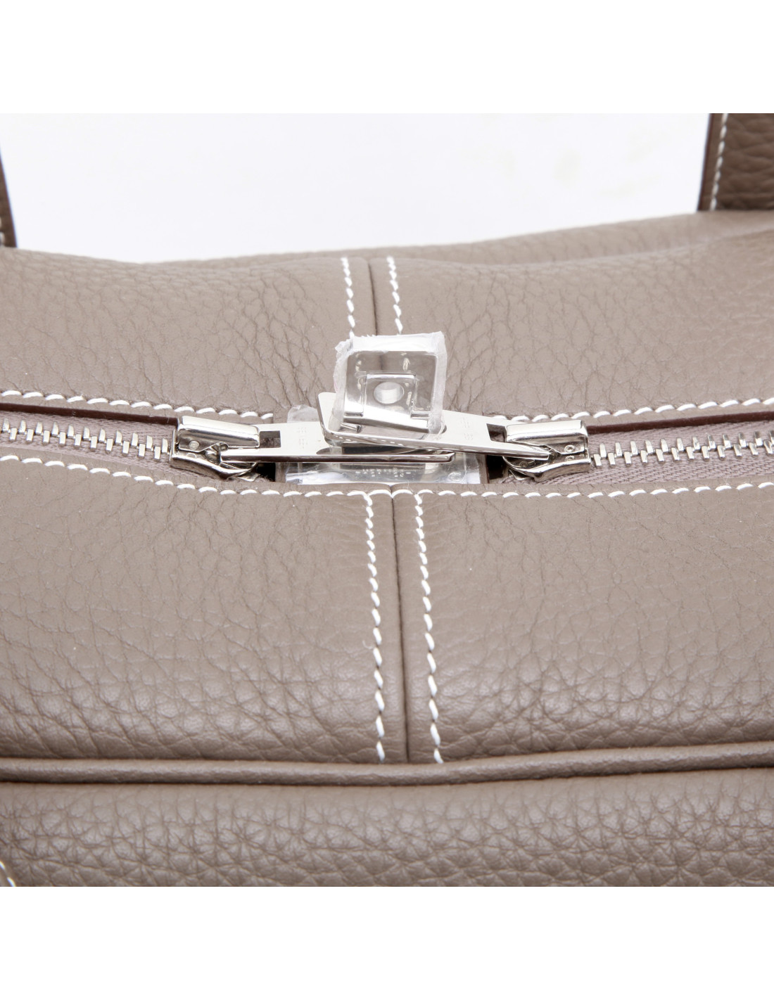 Hermes Victoria bag in étoupe clémence taurillon leather, with white saddle stitching. The interior is in chevron fabric.