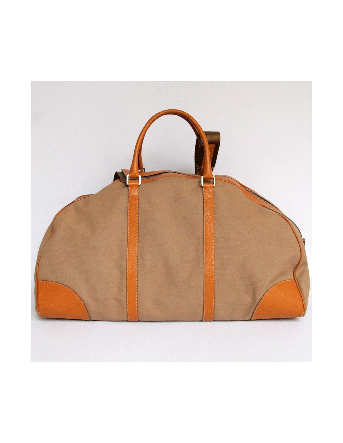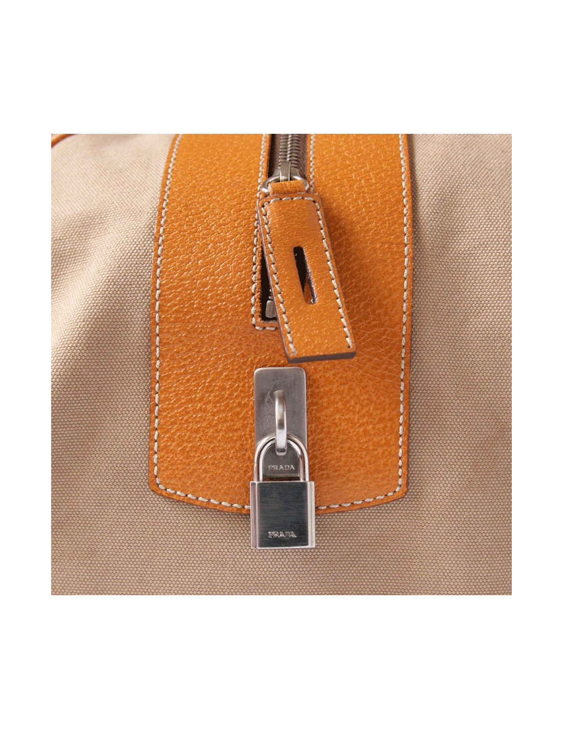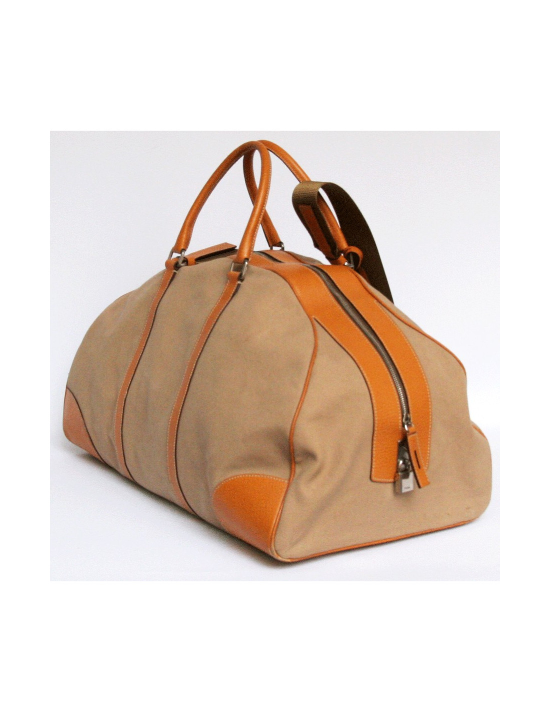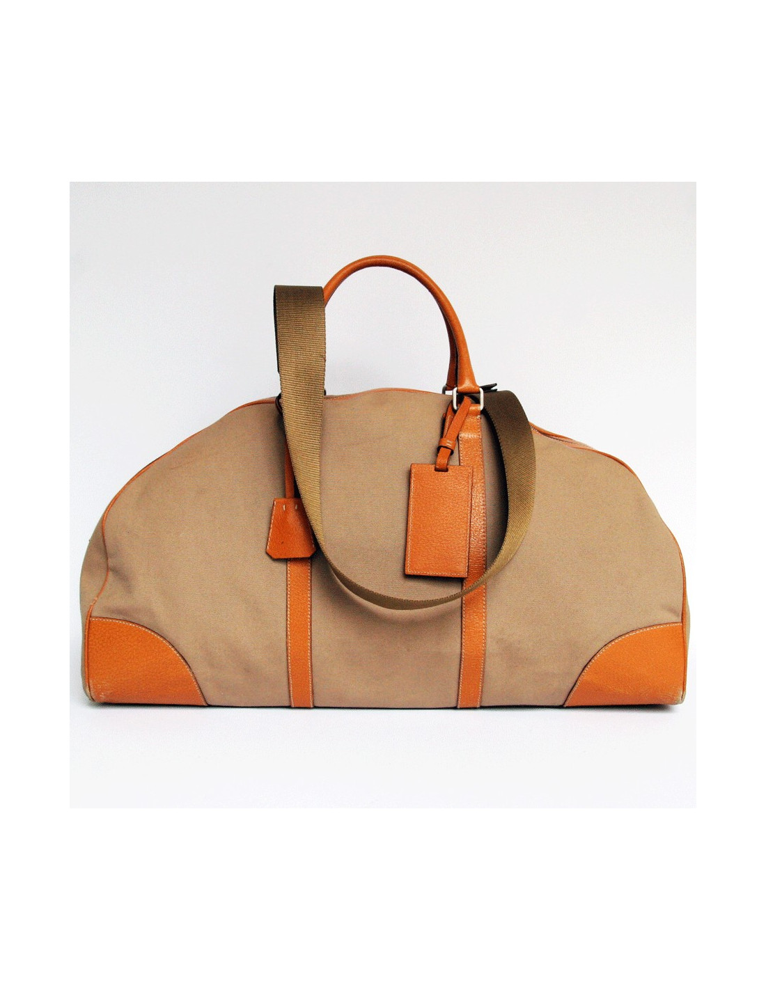 Bag weekender PRADA beige canvas and camel leather.The fittings are in brushed silver metal.