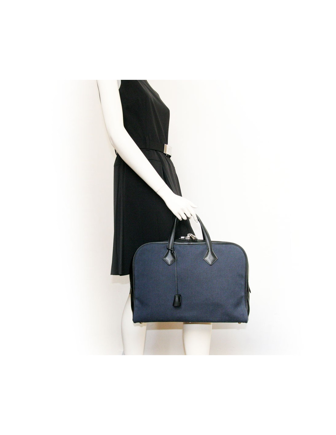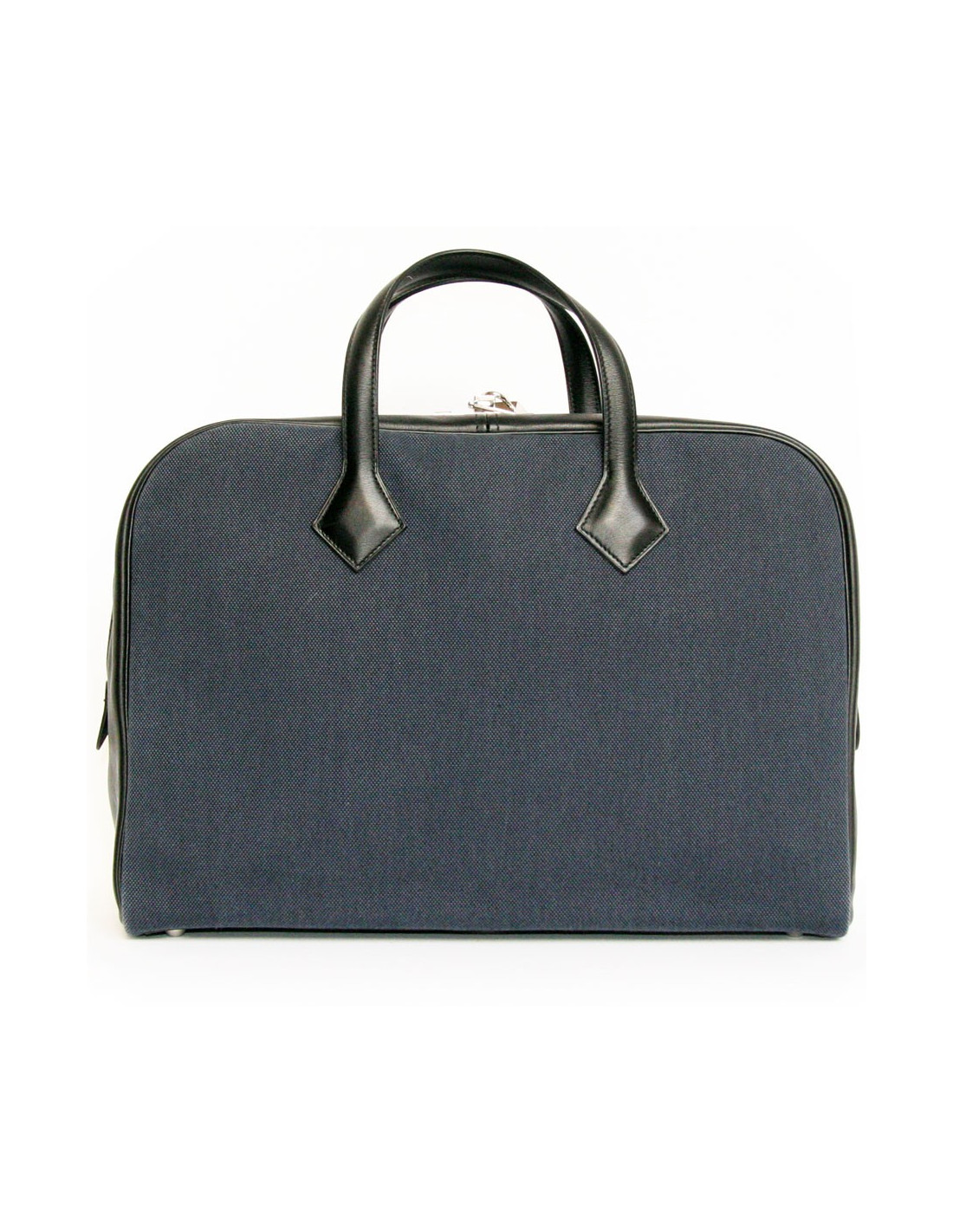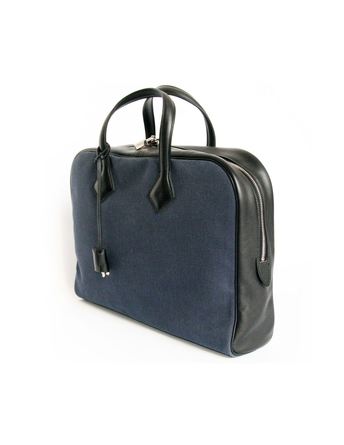 It is semi black leather and blue cloth. The Interior is beige canvas. It has one large Pocket as well as smaller 3. The fittings are silver-plated.