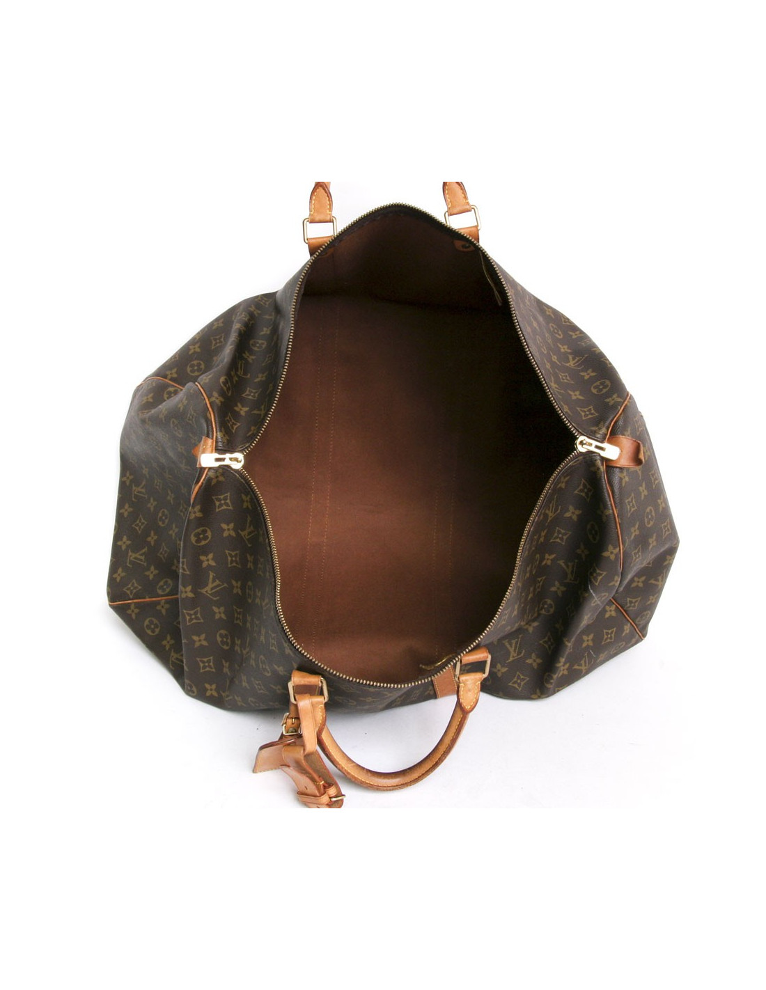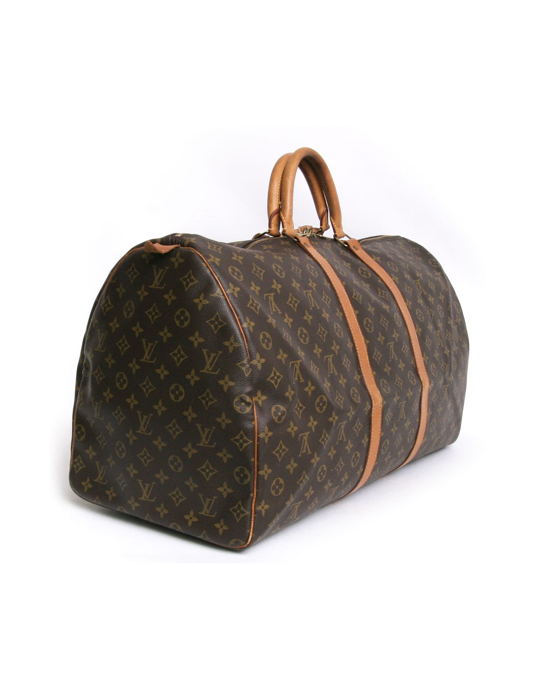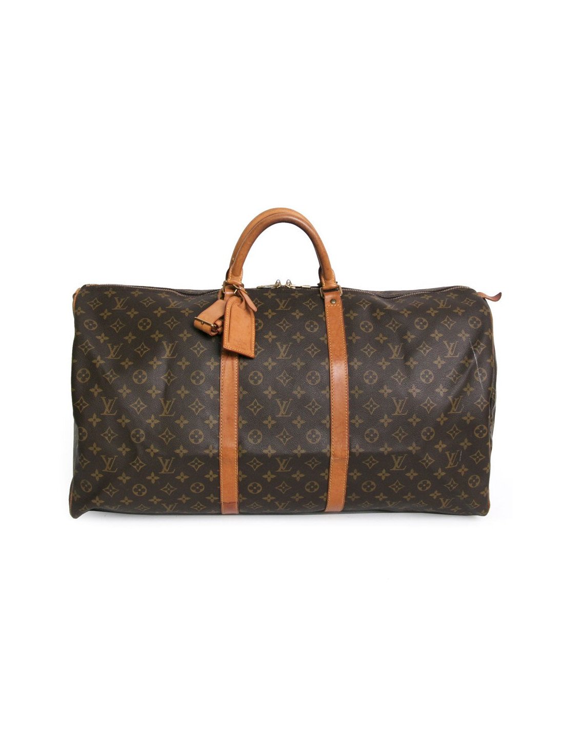"Keepall 60" bag of the Maison Louis Vuitton monogram canvas. An icon since its inception in 1930. The followers of the art of making her suitcase can easily slide into its generous size, the business necessary for a week. Les pièces métalliques sont en laiton doré. Fermeture zippée. Porté main à l'aide de deux poignées. Porte nom. La doublure est en toile marron. Les parements sont en cuir de vache naturel. Patinage du cuir. Légère usure sur les coins sous le sac. Deux fines traces blanches sur le côté. Voir photos.