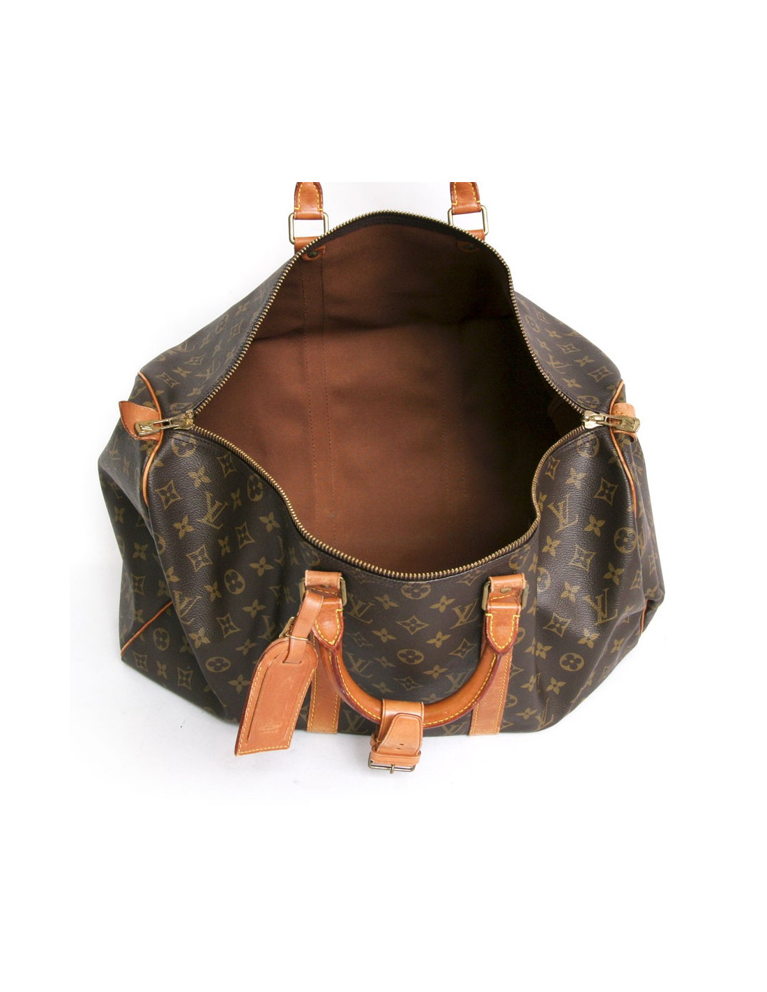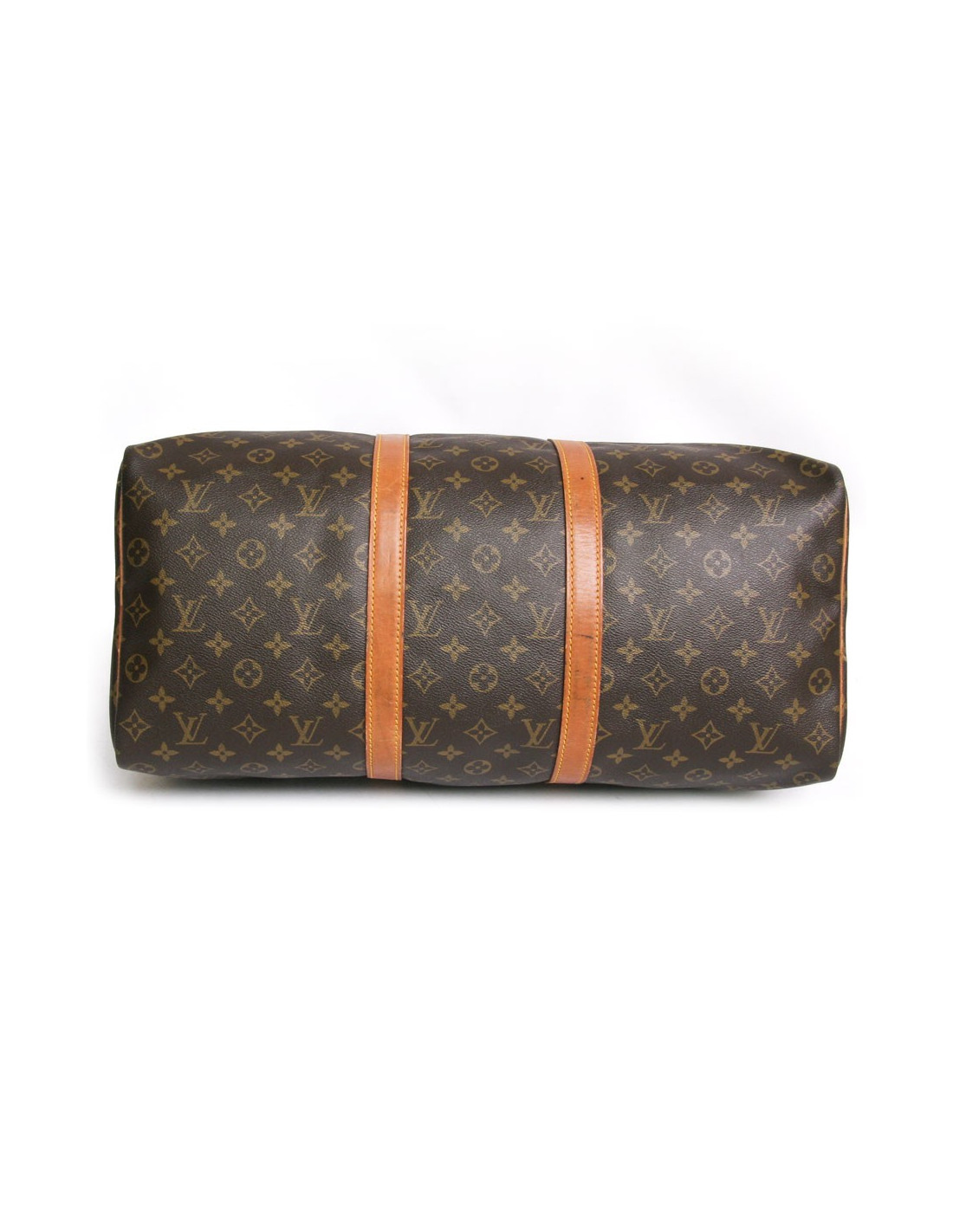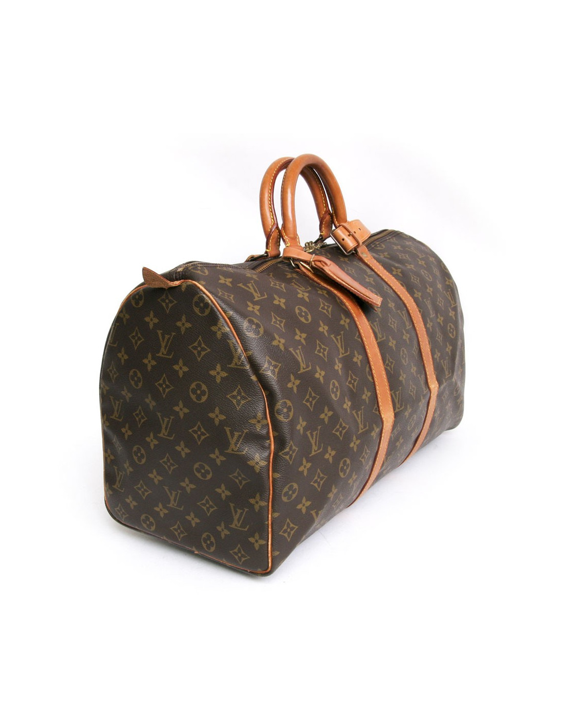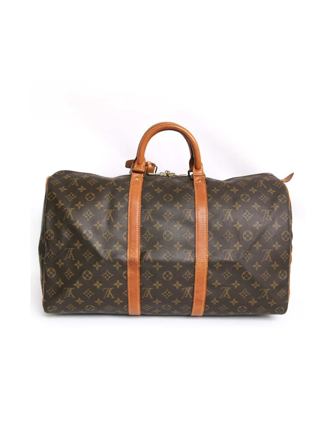 "Keepall 50" bag of the Maison Louis Vuitton monogram canvas. An icon since its inception in 1930. Light, flexible and always ready for a start imminent but especially practical because of its cabin size. The metal parts are made of gilded brass. Zipped. Door hand using two handles. Door name. The lining is brown canvas. The facings are natural cowhide. In very good condition. Very light patina of leather. A few small marks of wear under the bag. See photos.