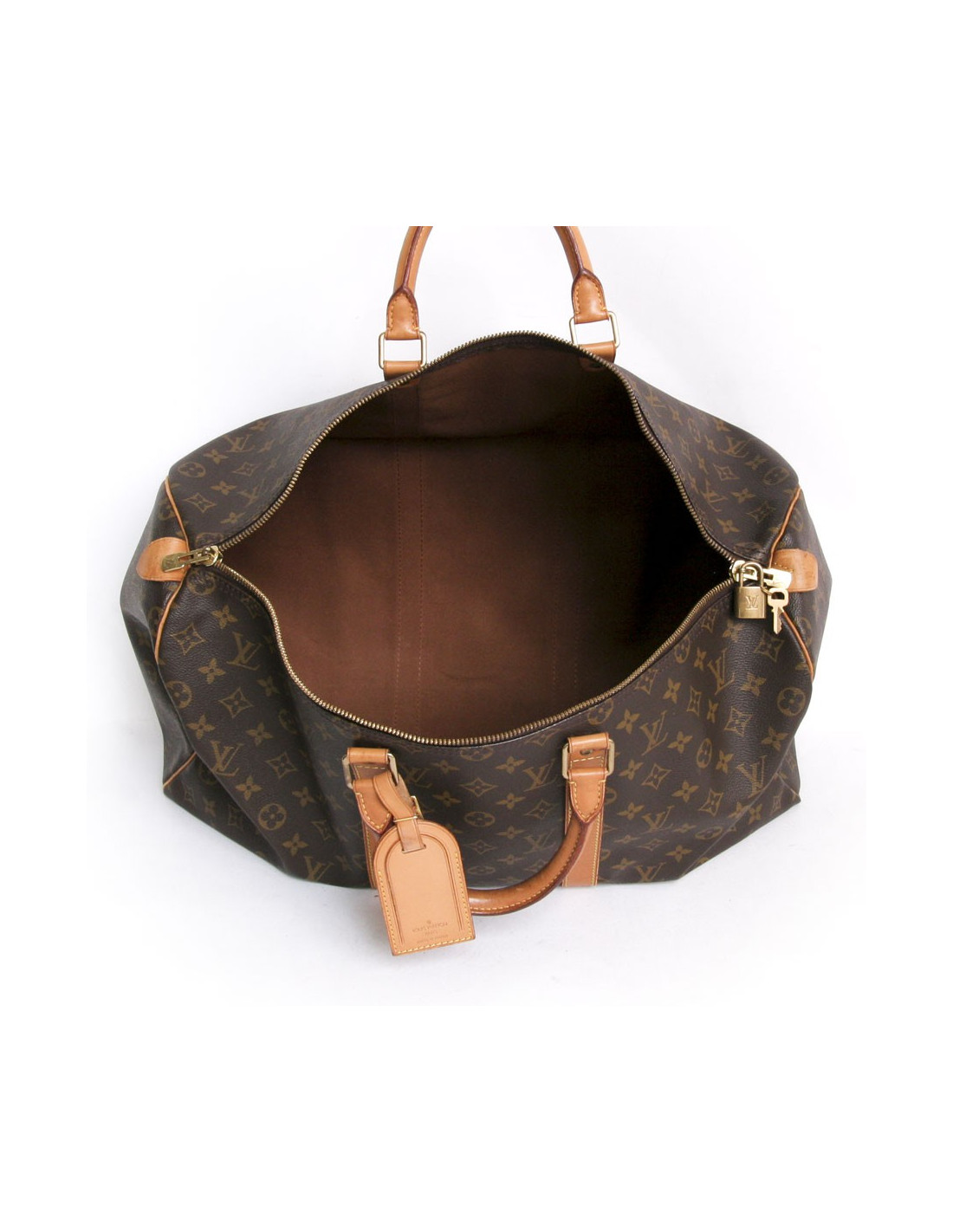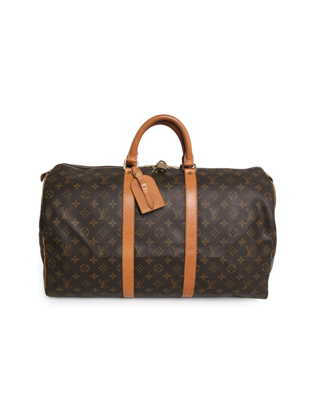 "Keepall 50" bag of the Maison Louis Vuitton monogram canvas. An icon since its inception in 1930. Light, flexible and always ready for a start imminent but especially practical because of its cabin size. The metal parts are made of gilded brass. Zipped. Door hand using two handles. Door name. The lining is brown canvas. The facings are natural cowhide. In very good condition. Very light patina of leather.