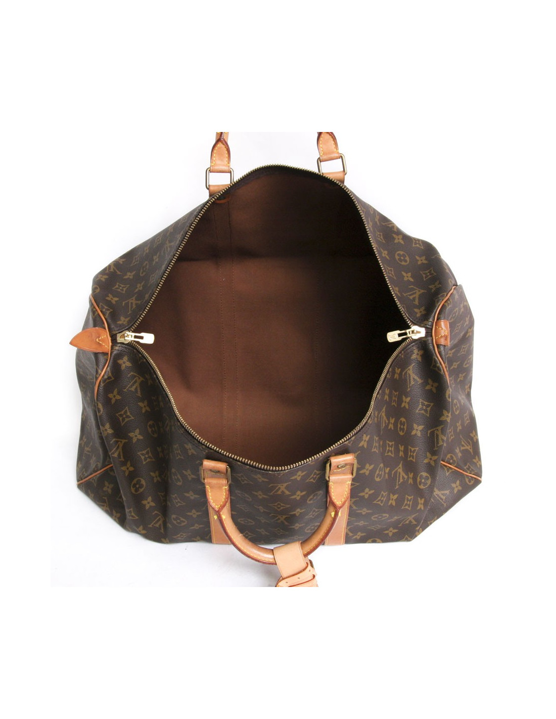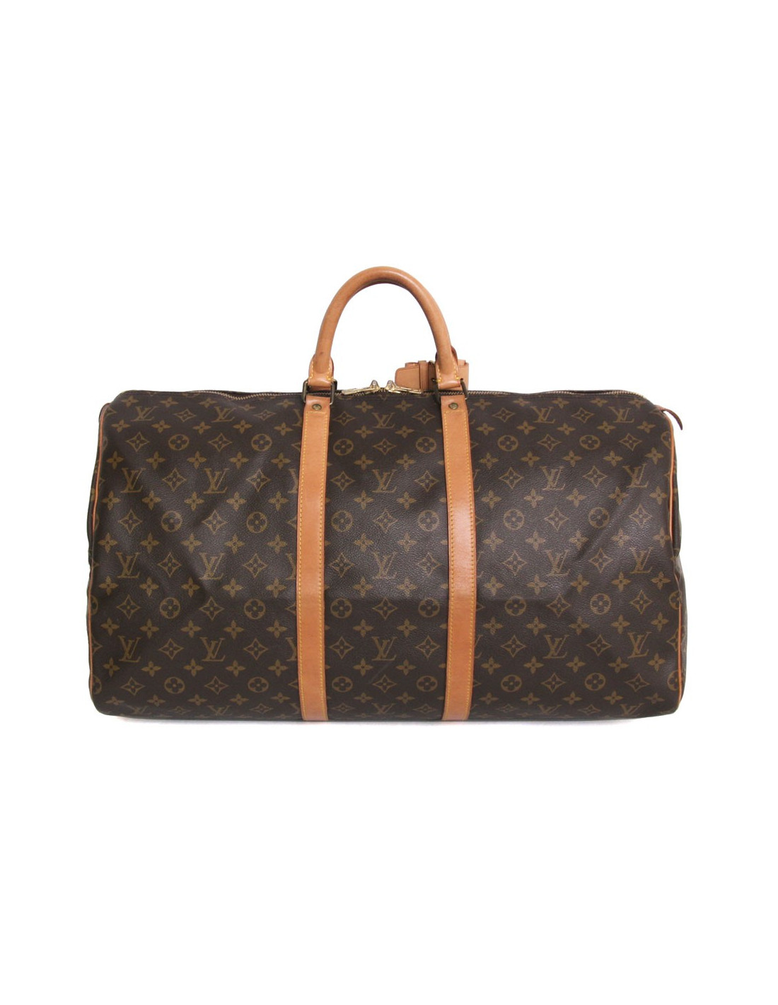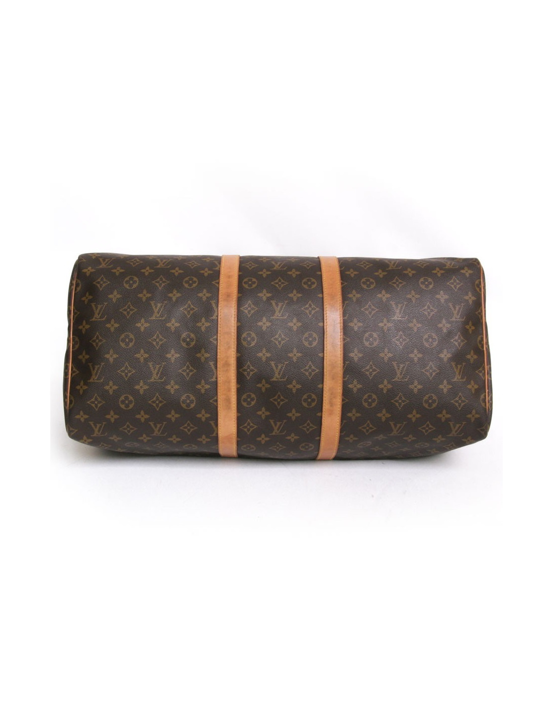 Bag "keepall 55" of the Maison Louis Vuitton monogram canvas. An icon since its inception in 1930. Light, flexible and always ready for a start imminent but especially practical because of its cabin size. The metal parts are made of gilded brass. Zipped. Door hand using two handles. Door name. The lining is brown canvas. The facings are natural cowhide. In very good condition. Slight wear and skating the leather under the bag, as well as on the handles.