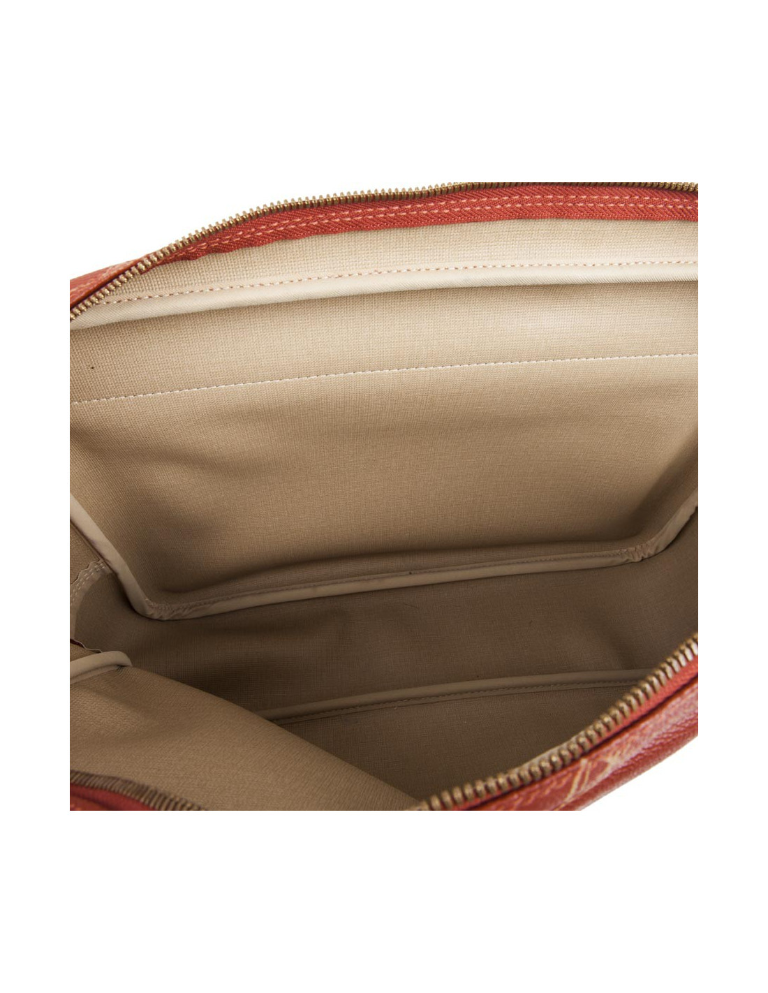 It has a large inside pocket with zipper and a second outside flap pocket with inside zip pocket.