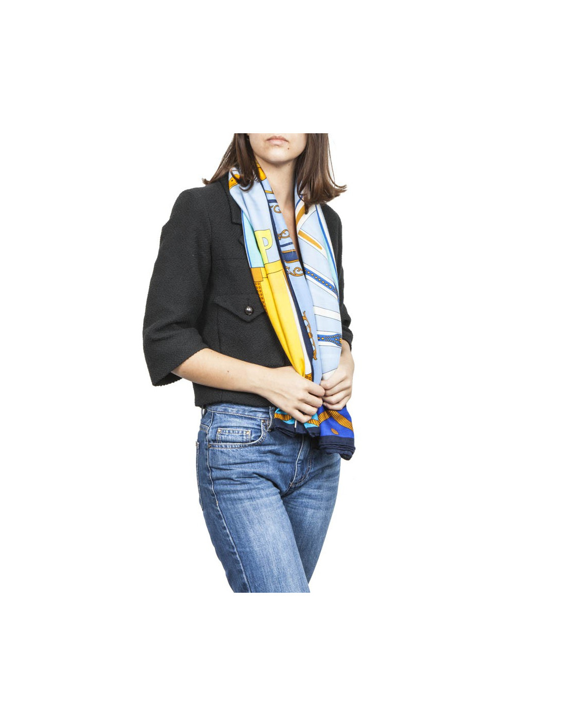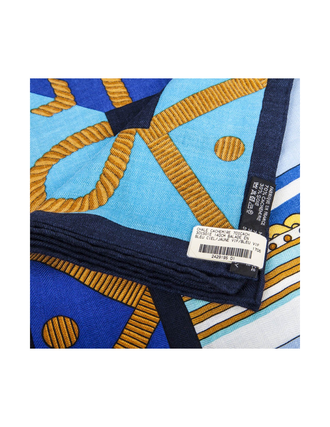 Hermès shawl "Balade en Berline" in cashmere and silk colored in blue sky, bright blue and bright yellow.