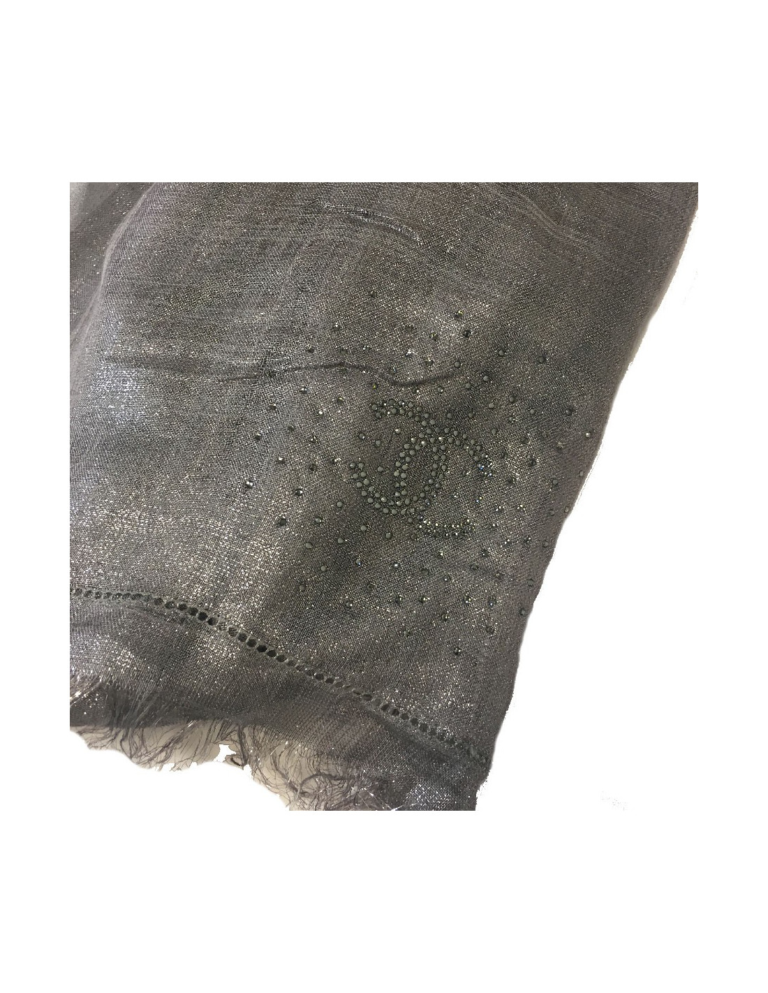 Very beautiful Chanel shawl with small fringes in grey modal, silk and cupro embellished with small silver threads. A rhinestone CC is at one end of the shawl.