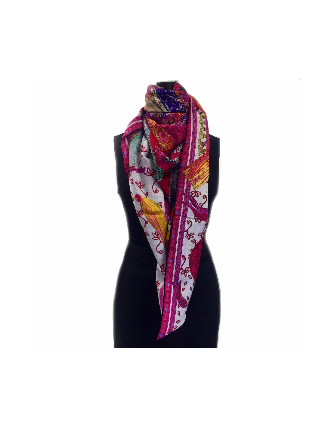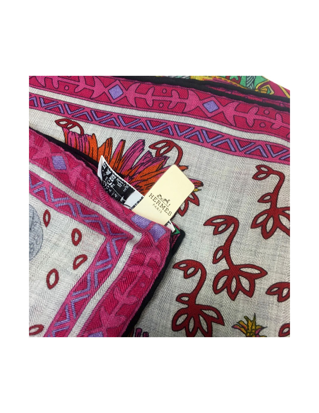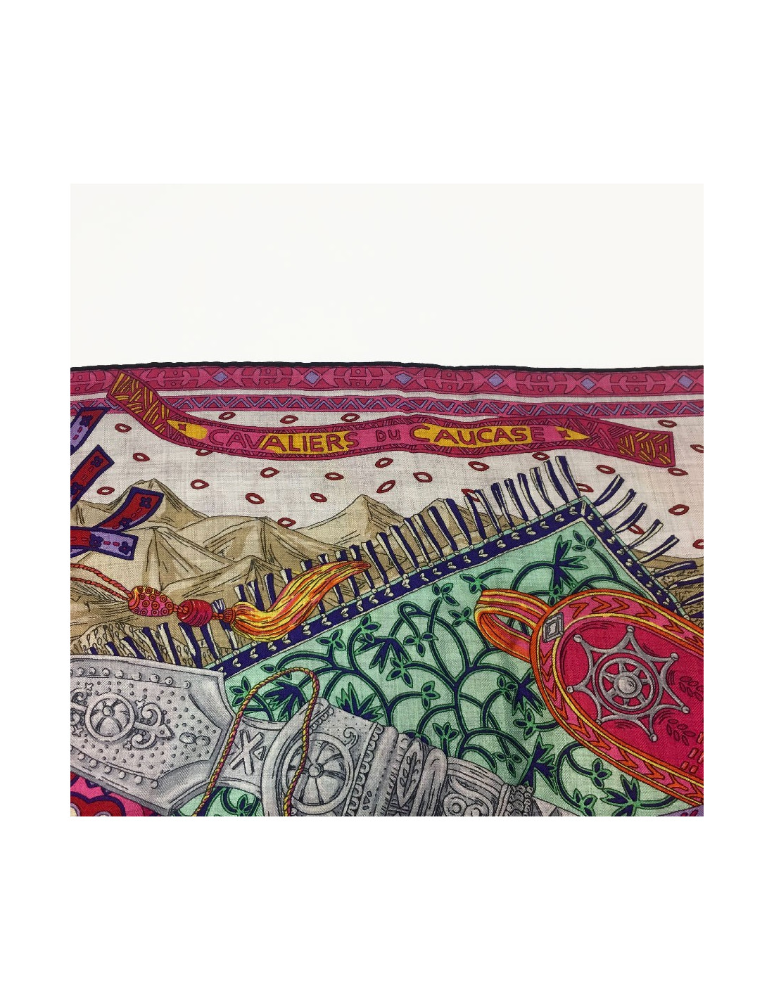 Hermès shawl 'Cavaliers du Caucase' in light gray, fuchsia and green cashmere and silk