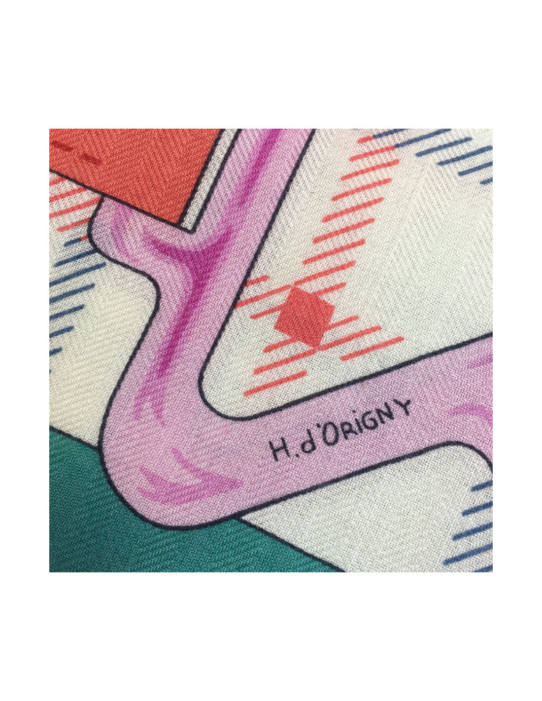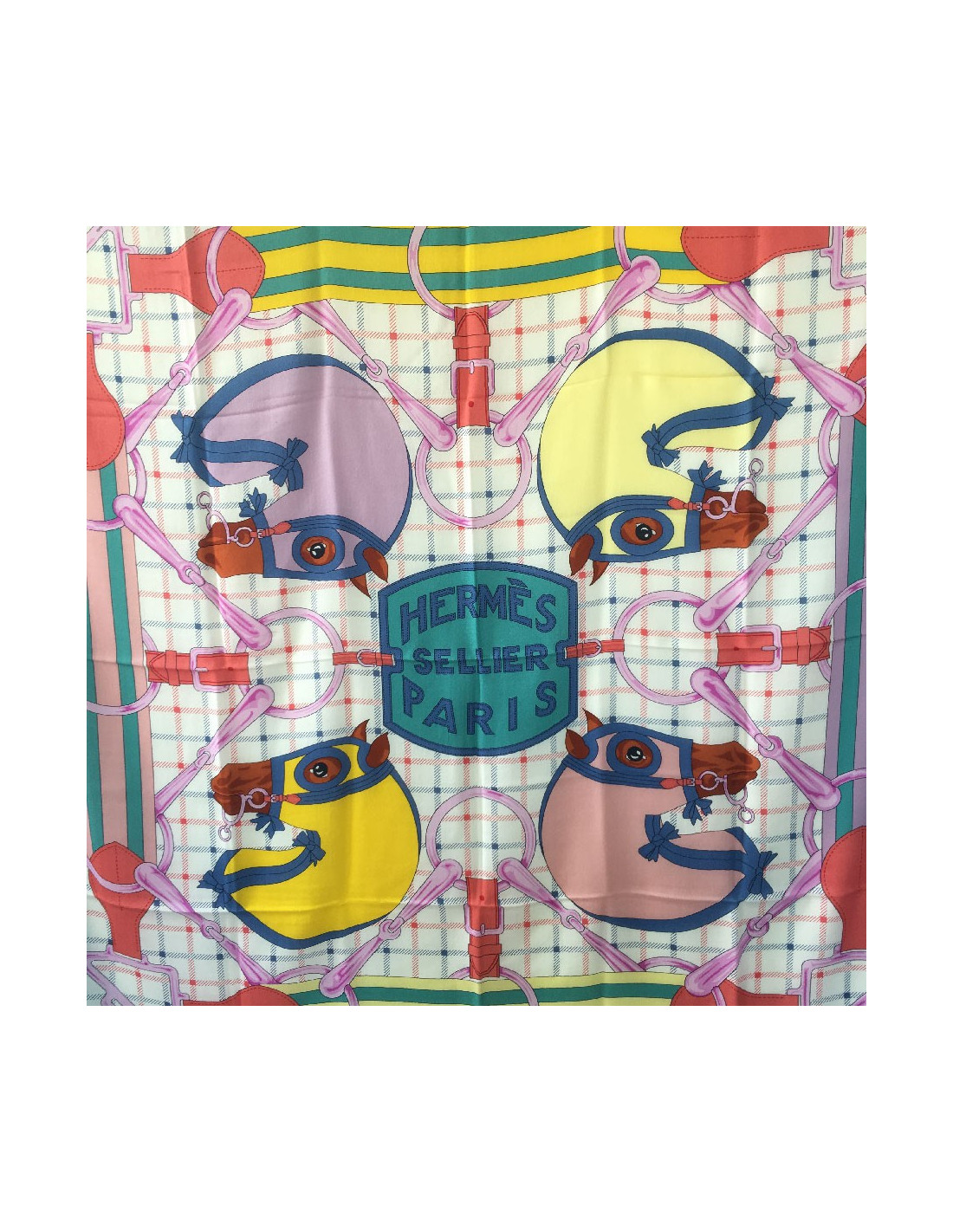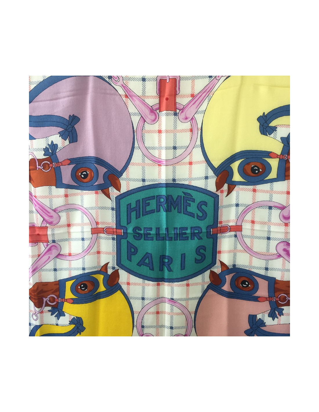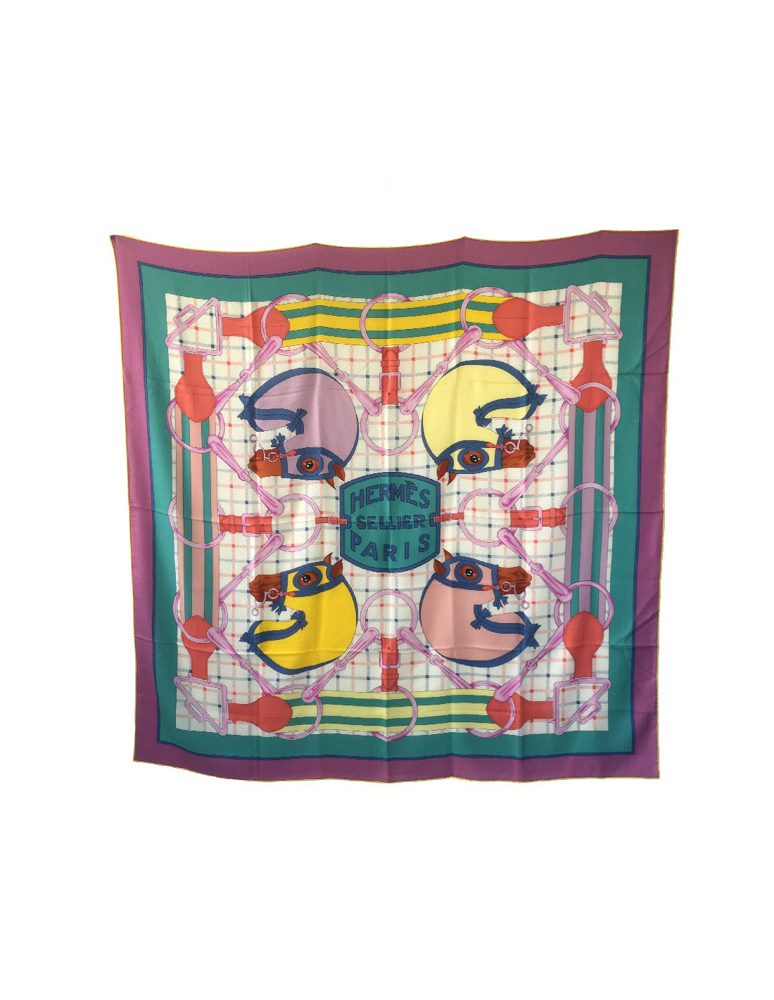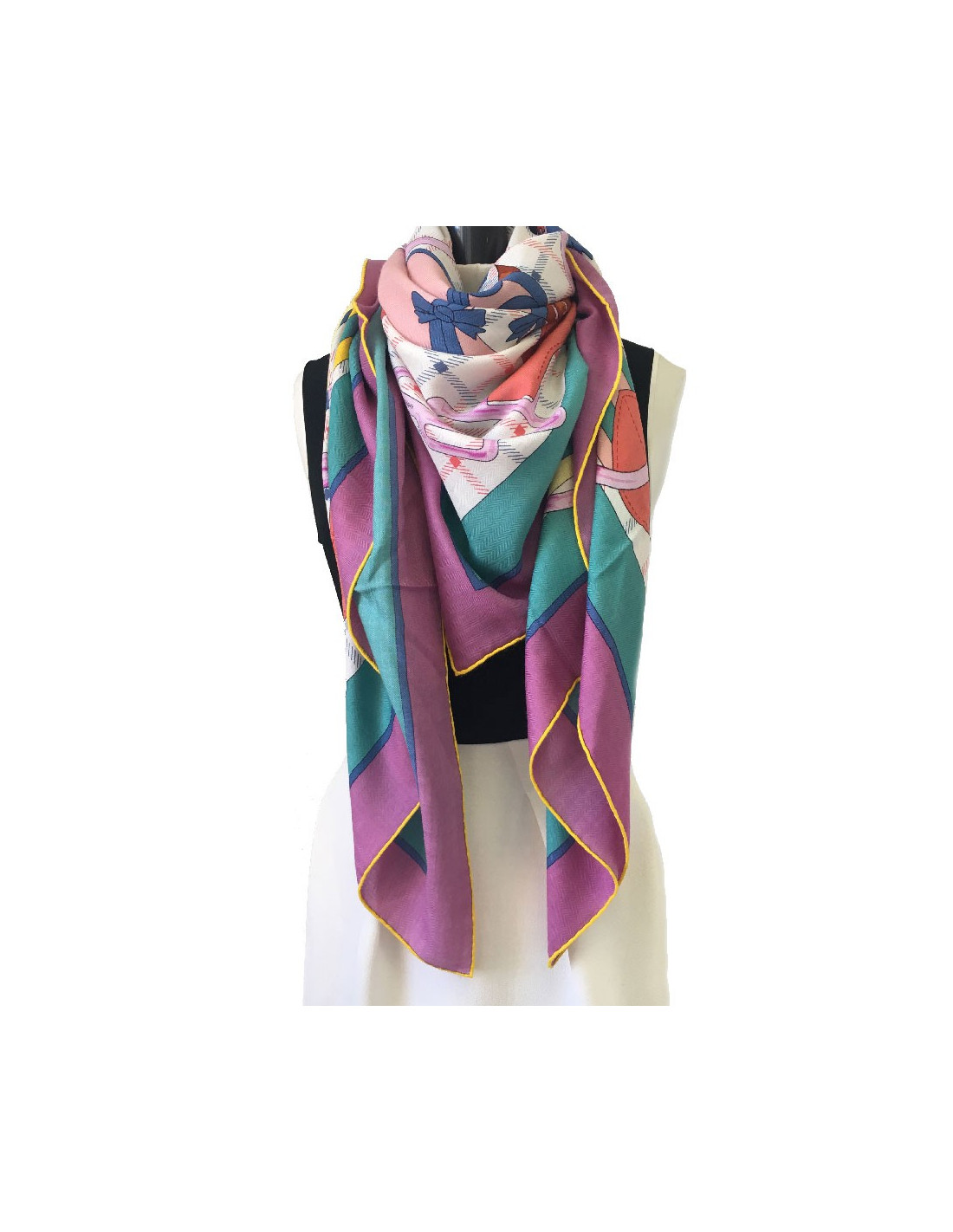 Hermès 'Sellier' shawl in cashmere and silk. Colors: purple, cream and bright yellow.