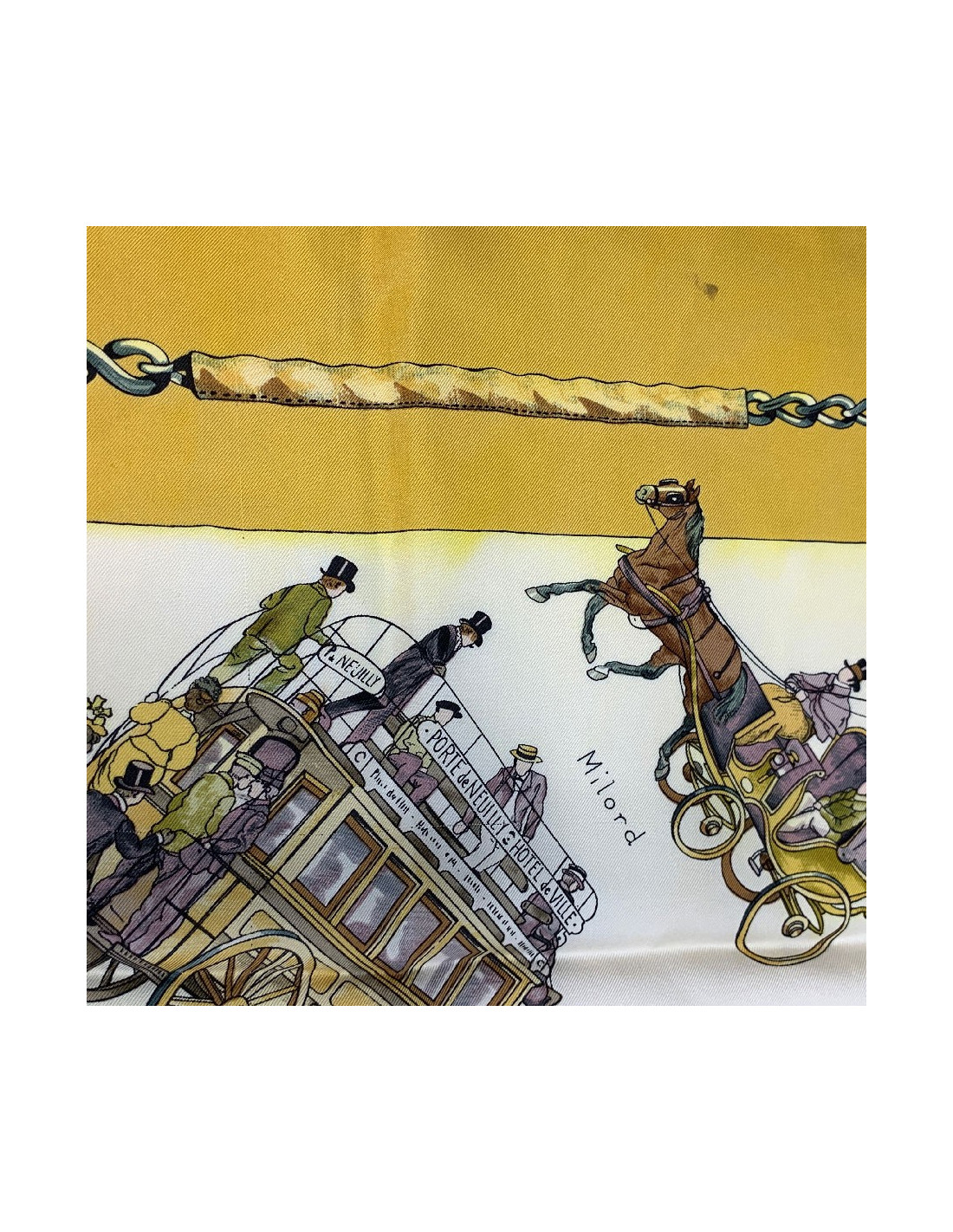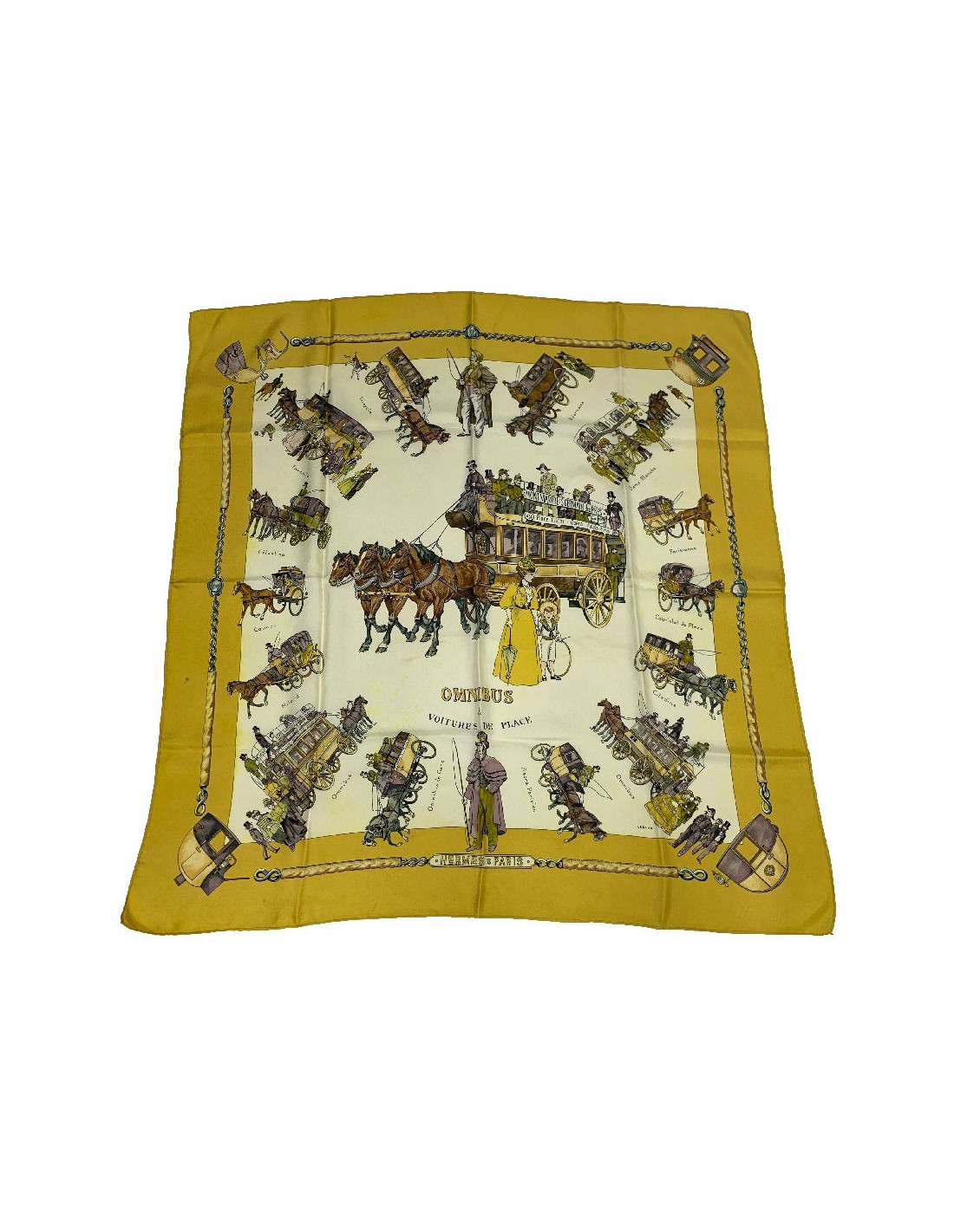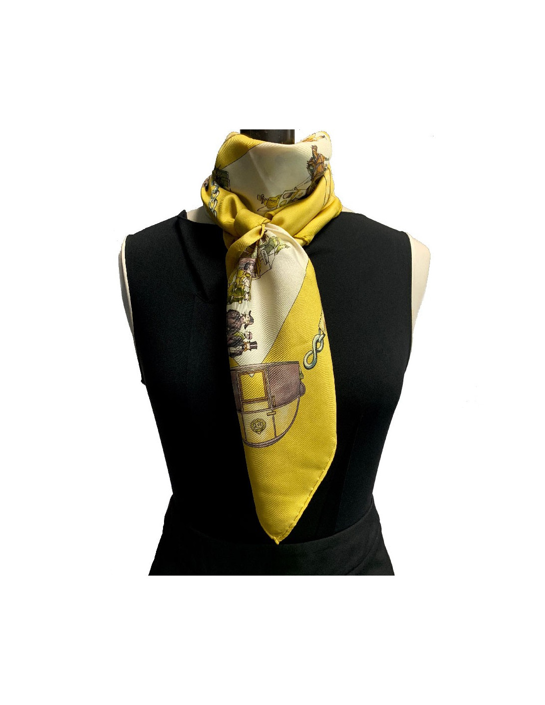 Last items in stock SCARVES AND SHAWLS HERMES "Folklore" white and yellow silk twill large scarf HERMES 17049 970.00 € HERMES "Folklore" white and yellow silk twill large scarf Made in FranceCondition: very goodMaterial: silkColors: yellow, white, blackDesigner: Henri d'Origny.S of the brand's salesMeasurements: 135x135xmDetails: HERMES “Folklore” giant square in feather silk twill with yellow borders on a white background. Impeccable black rolled hem. Advantage Valois... Add to cart