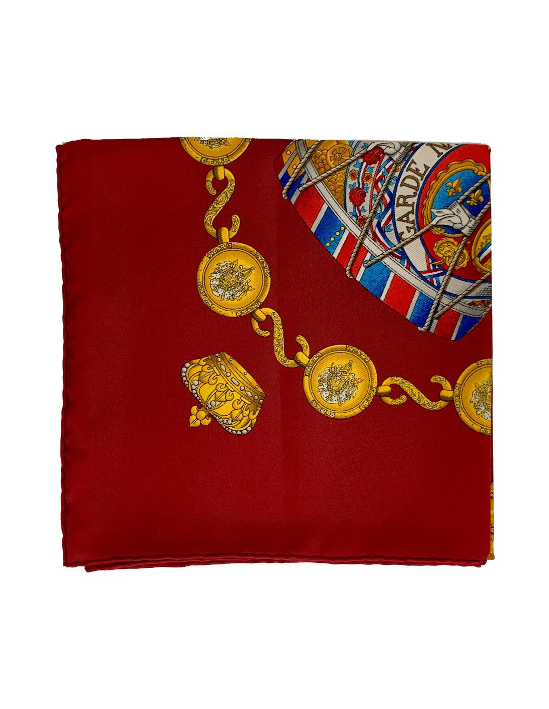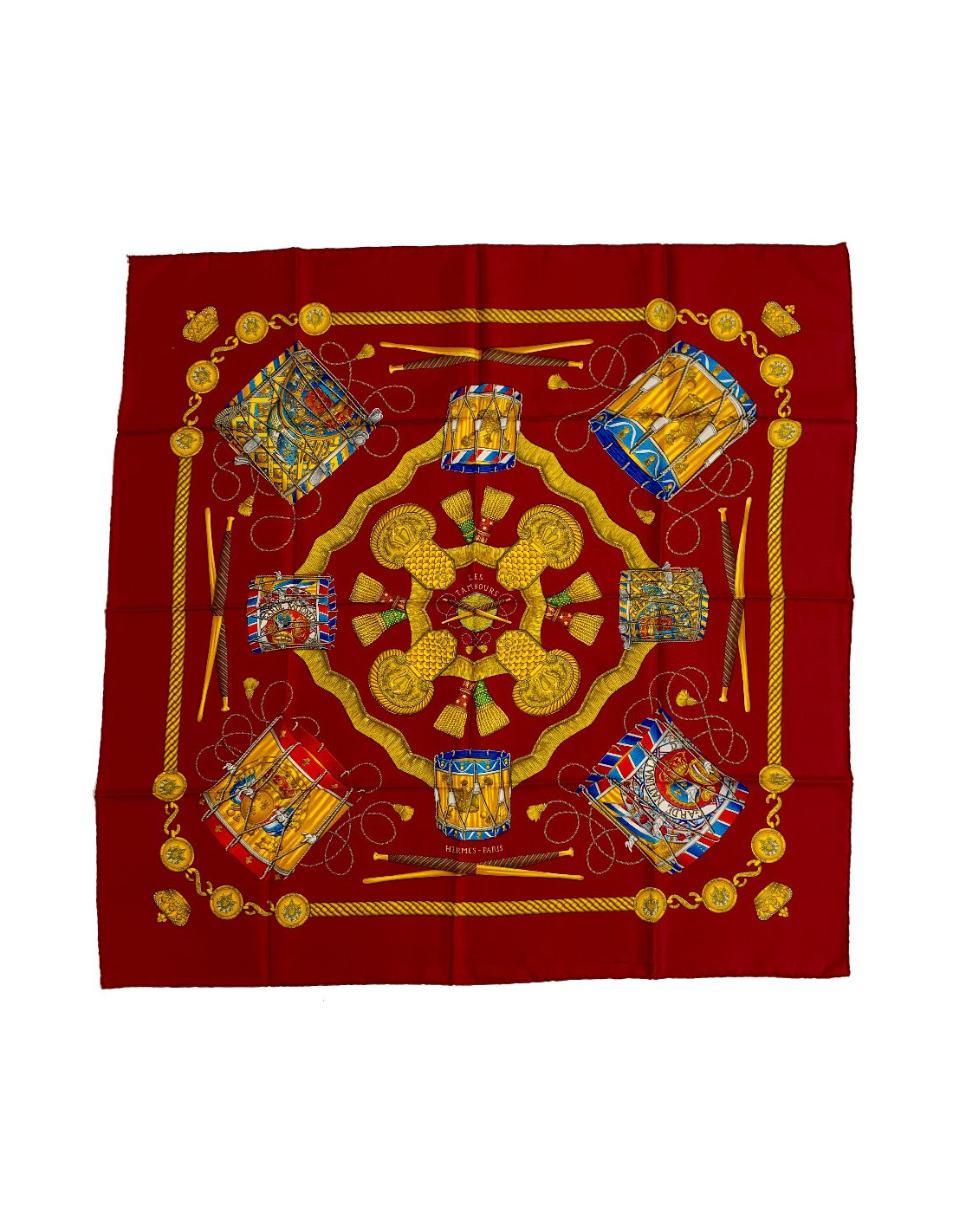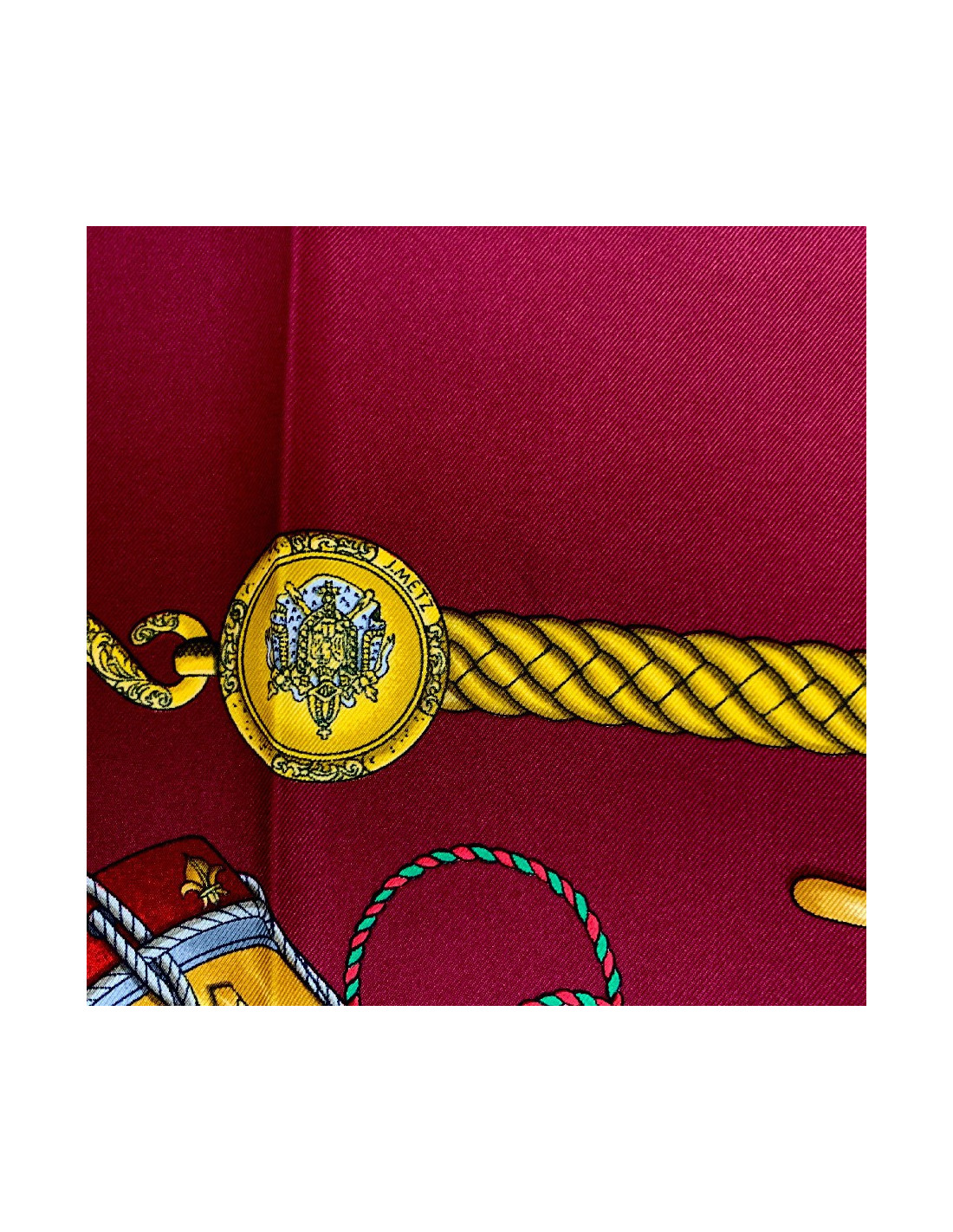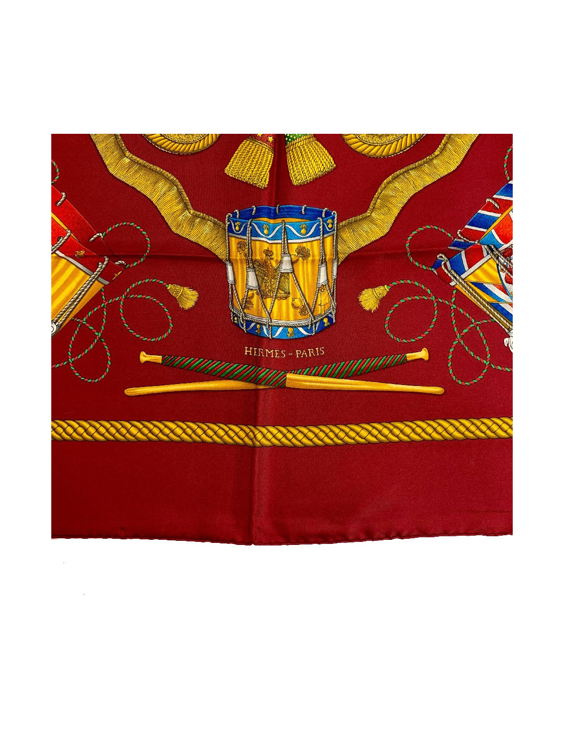 Beautiful HERMES square scarf, Les Tambours design, in wine-red silk twill with gold, blue and red motifs. Designed by Joachim Metz in 1989. It represents the drums, instruments played by the national guard.
