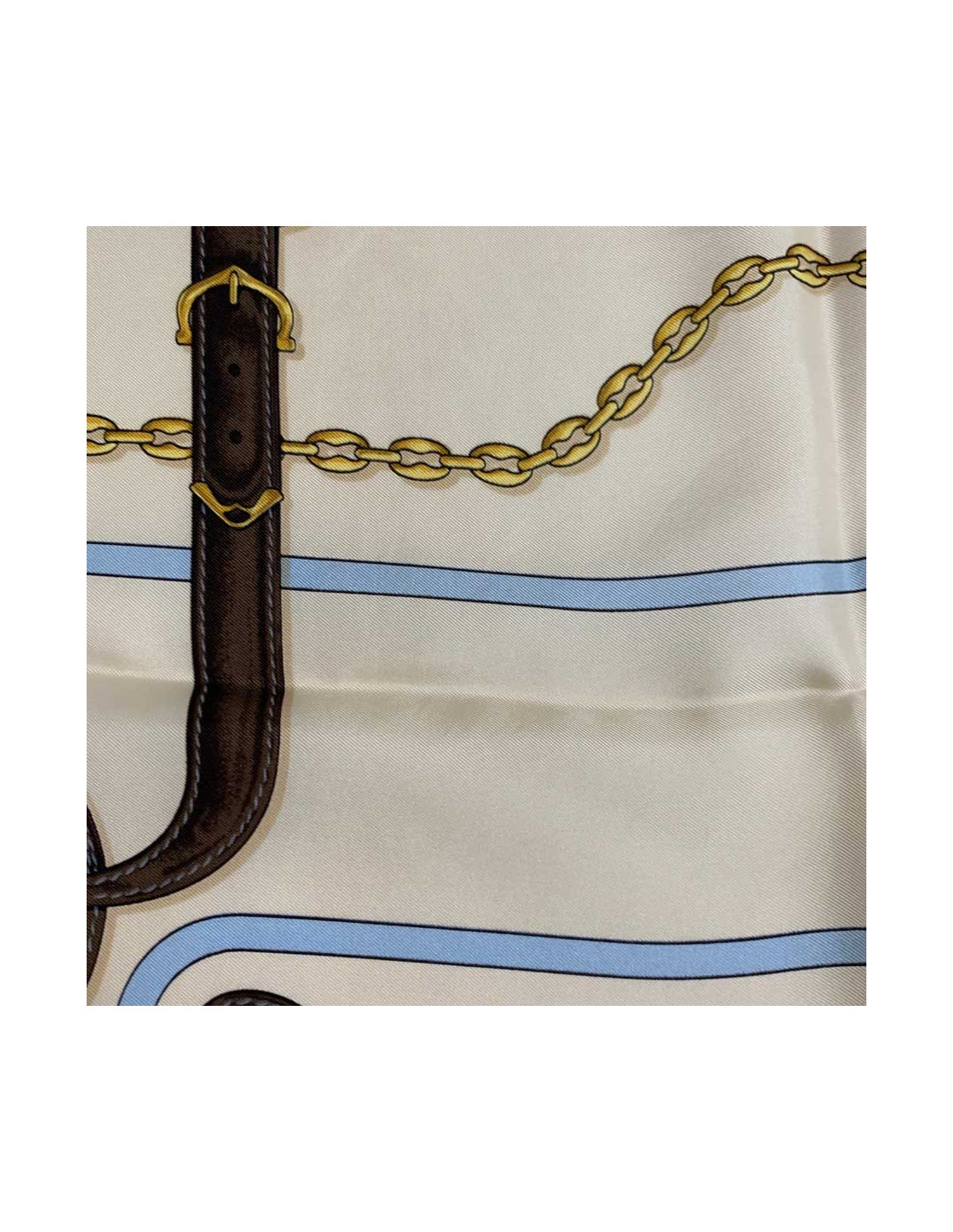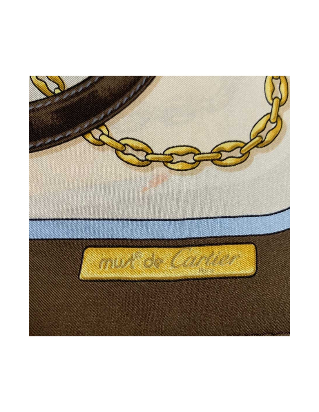 Timeless CARTIER scarf, MUST by Cartier in silk. Brown border, beige background and gold and sky-blue motif.