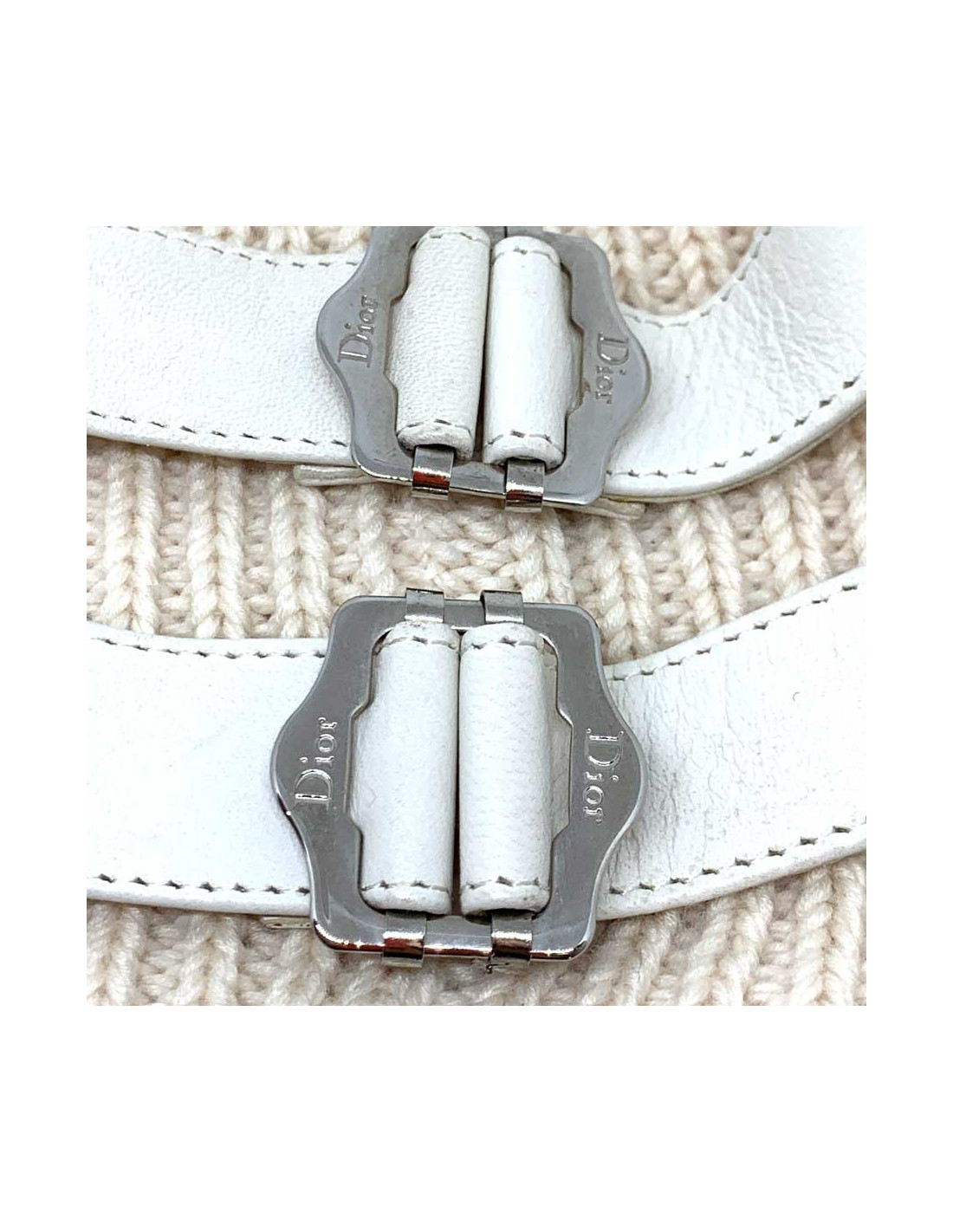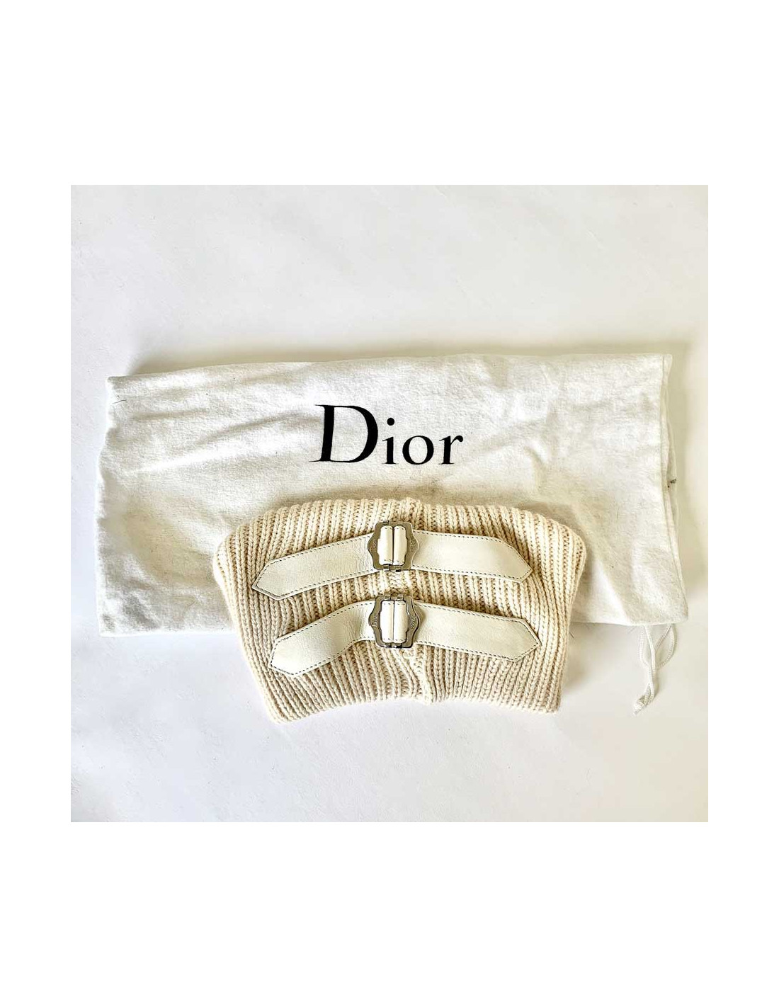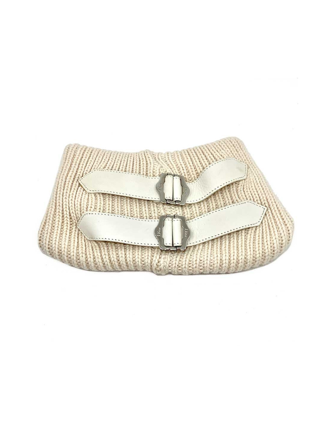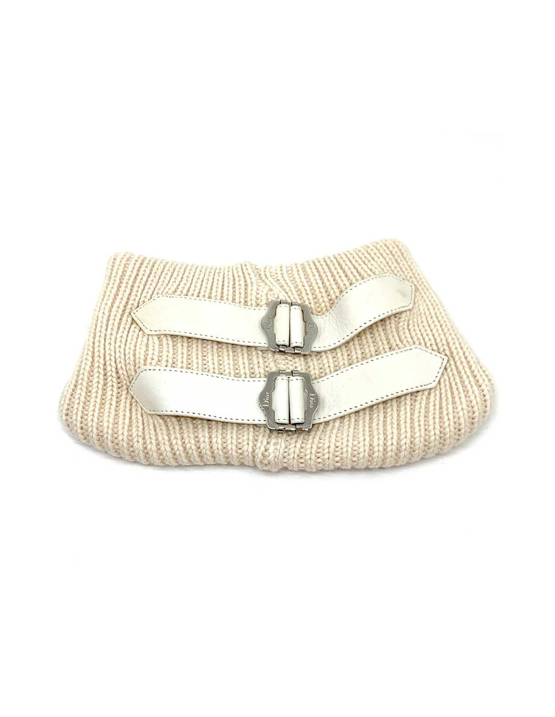 The neck warmer is signed by the House of CHRISTIAN DIOR. In ecru cashmere, it features two lambskin leather straps in the same color, with silver metal buckles engraved with the Dior brand.