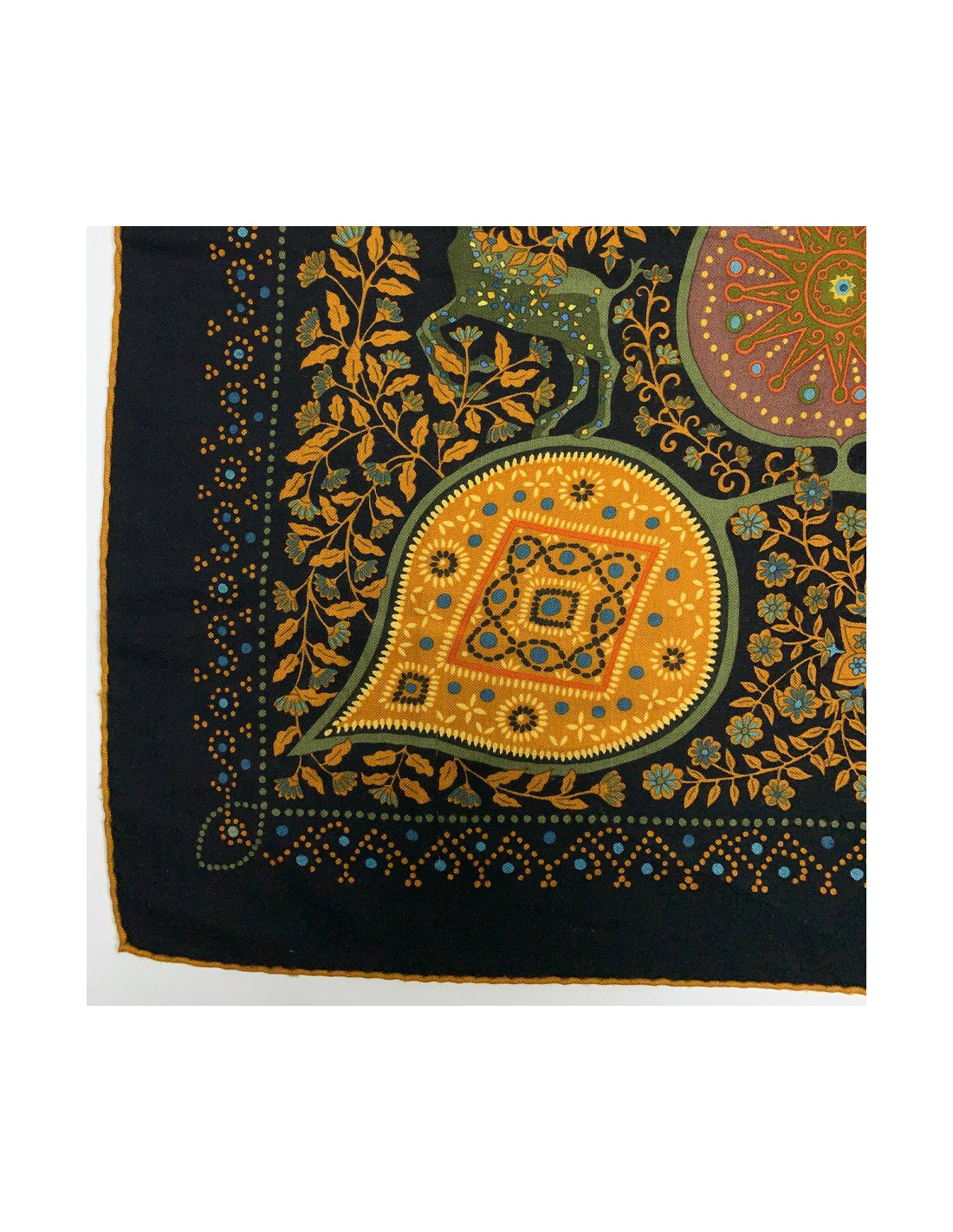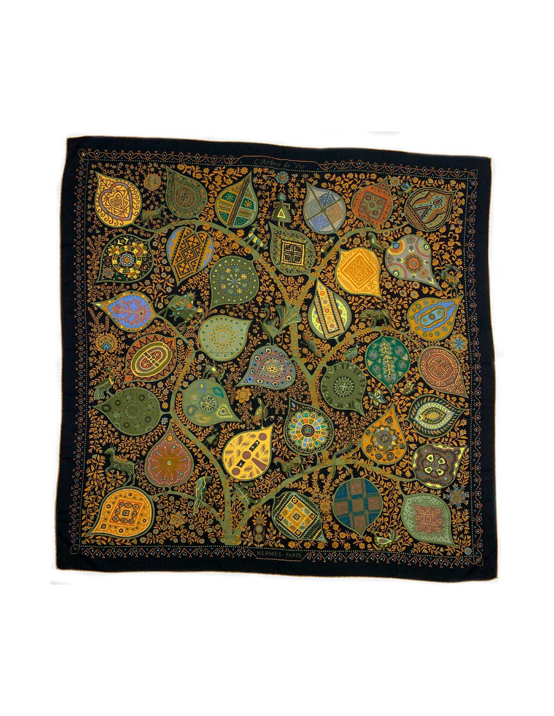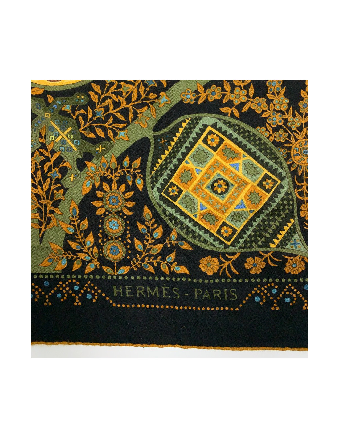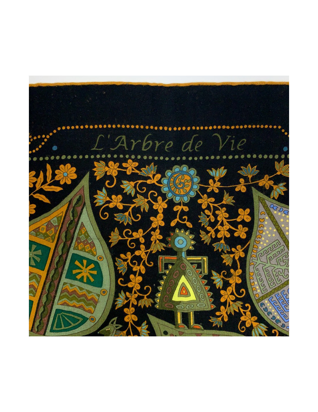 The shawl is from Maison Hermès. Designed by Christine Henry, it tells the link that unites man and plants. Each leaf of the scarf holds geometric shapes telling of various cultures. It protects against misfortune and invokes luck. The shawl is here in shades of green, yellow, brown, and orange. Put positive in your life!