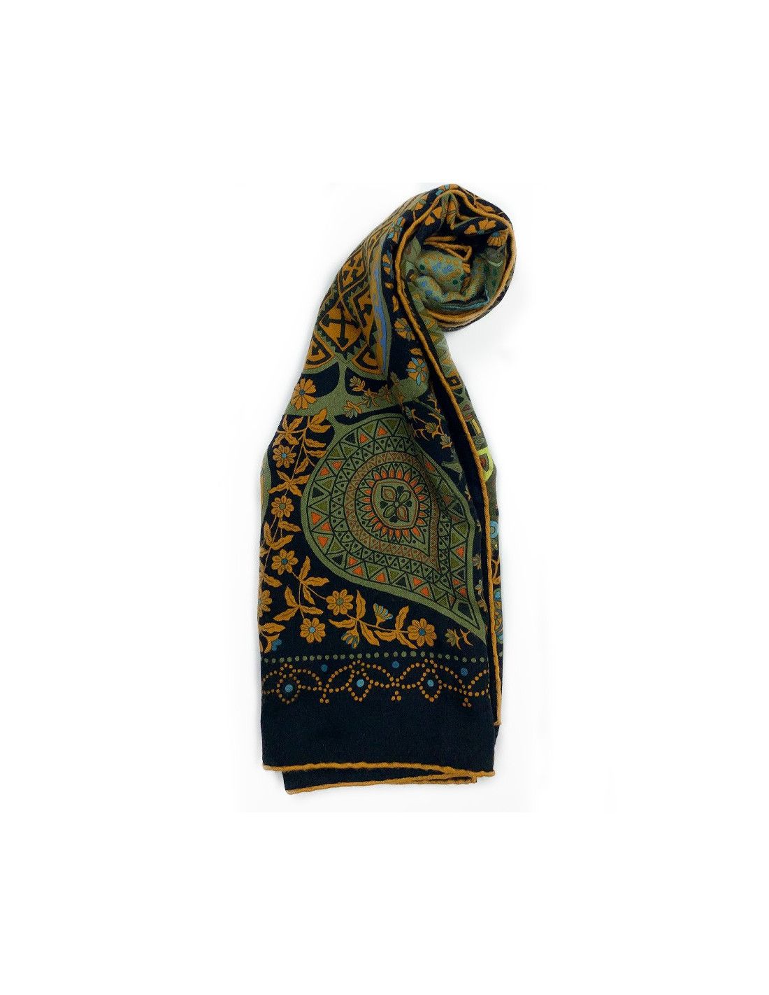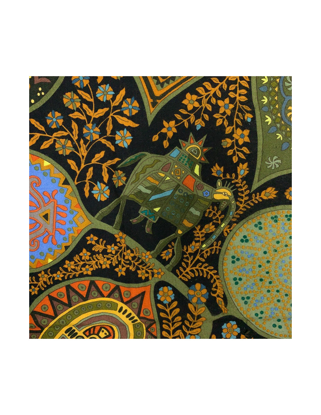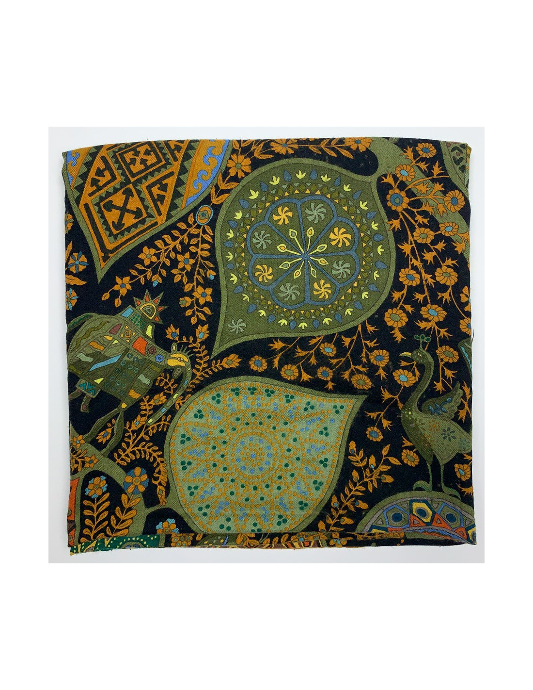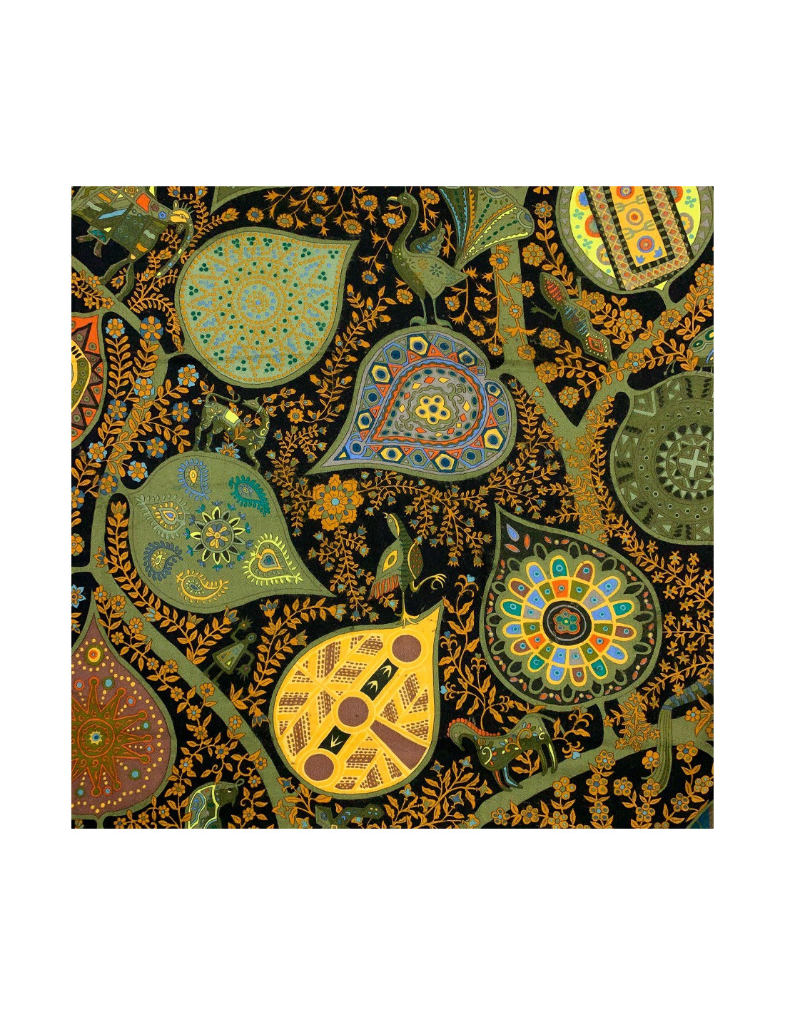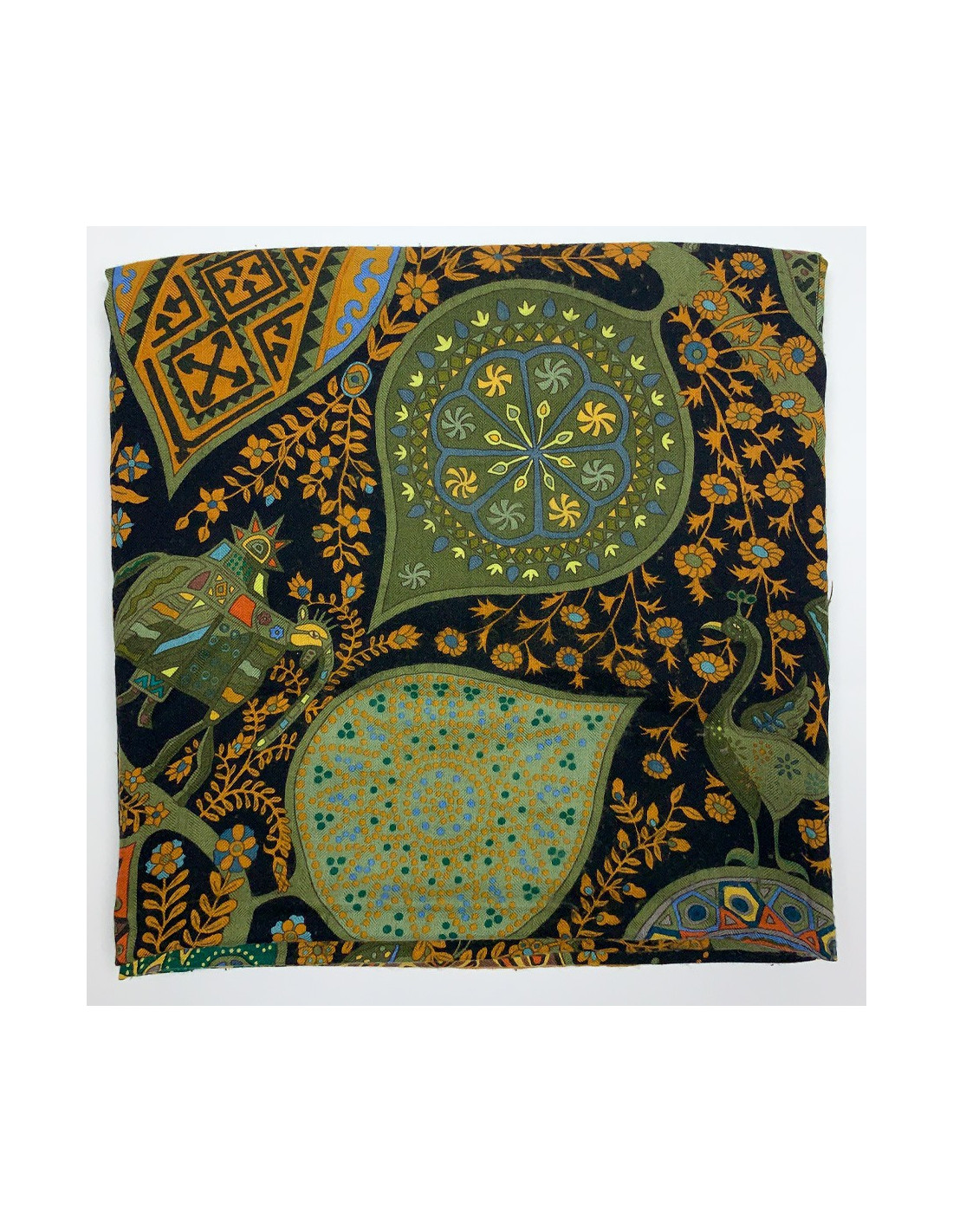 The shawl is from Maison Hermès. Designed by Christine Henry, it tells the link that unites man and plants. Each leaf of the scarf holds geometric shapes telling of various cultures. It protects against misfortune and invokes luck. The shawl is here in shades of green, yellow, brown, and orange. Put positive in your life!