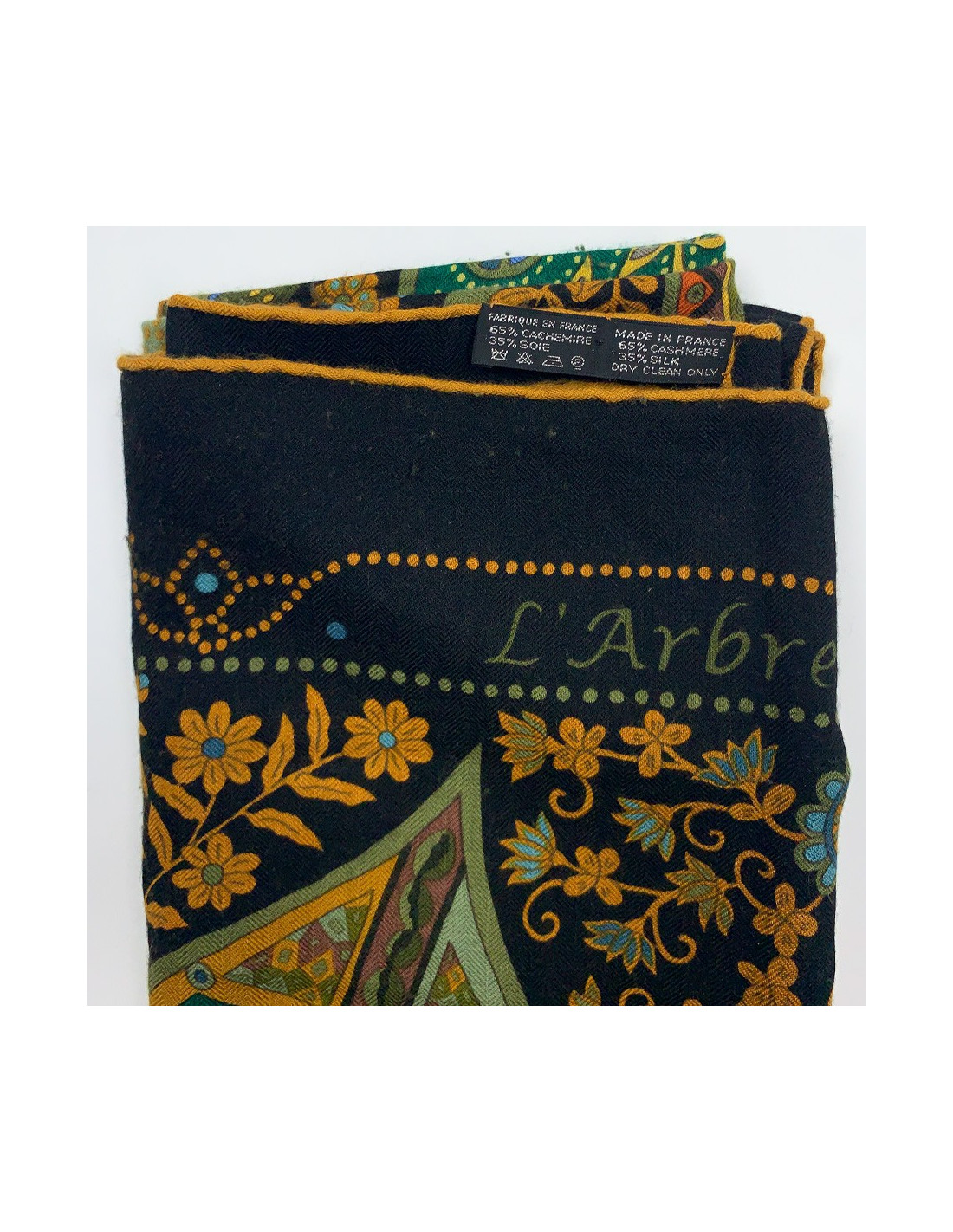 The shawl is in very good condition. No stains or zippers, and the rolled is impeccable. Dimensions : 140x140 cm. Presence of the materials label, 65% cashmere and 35% silk. The label says: dry clean. Made in France.