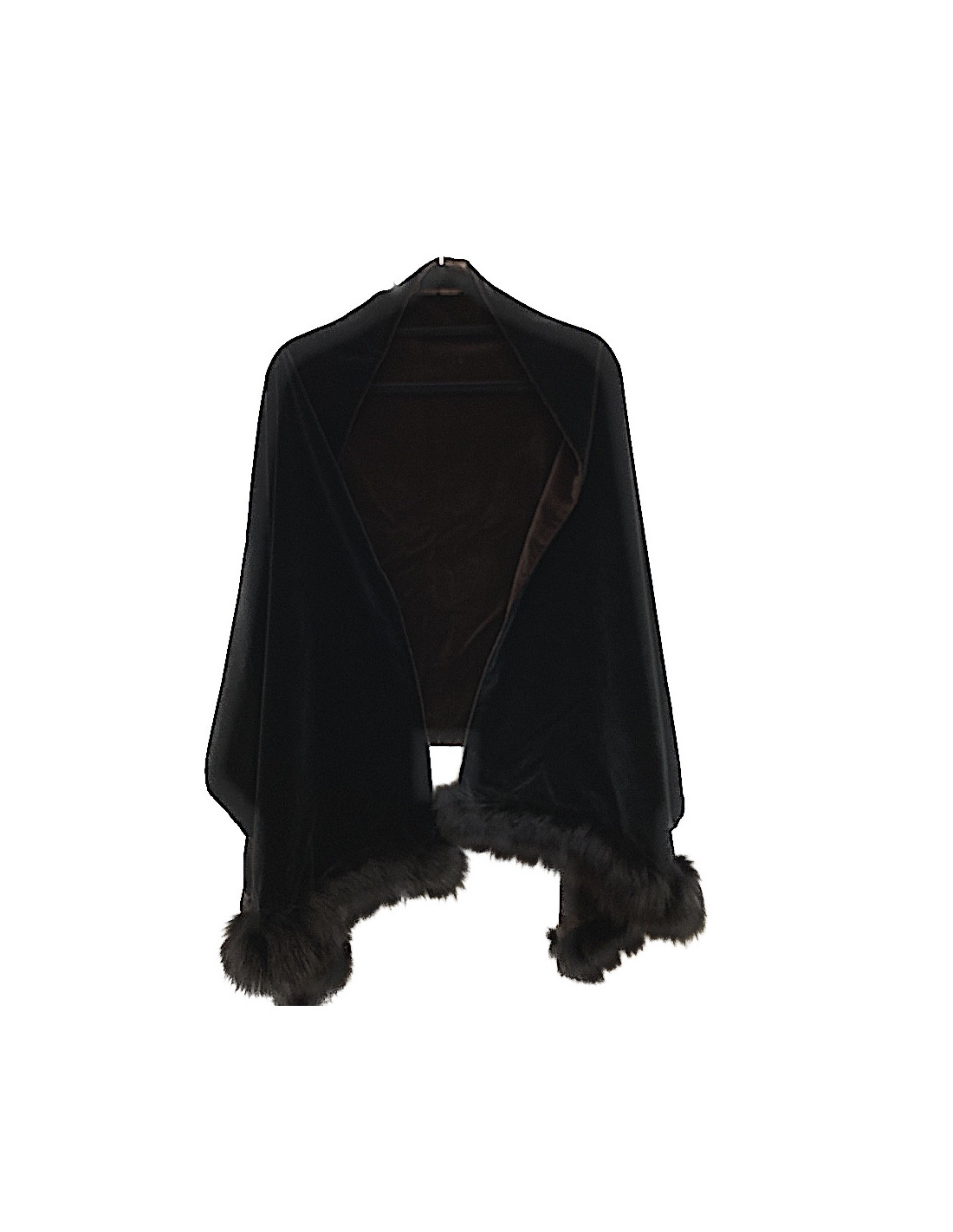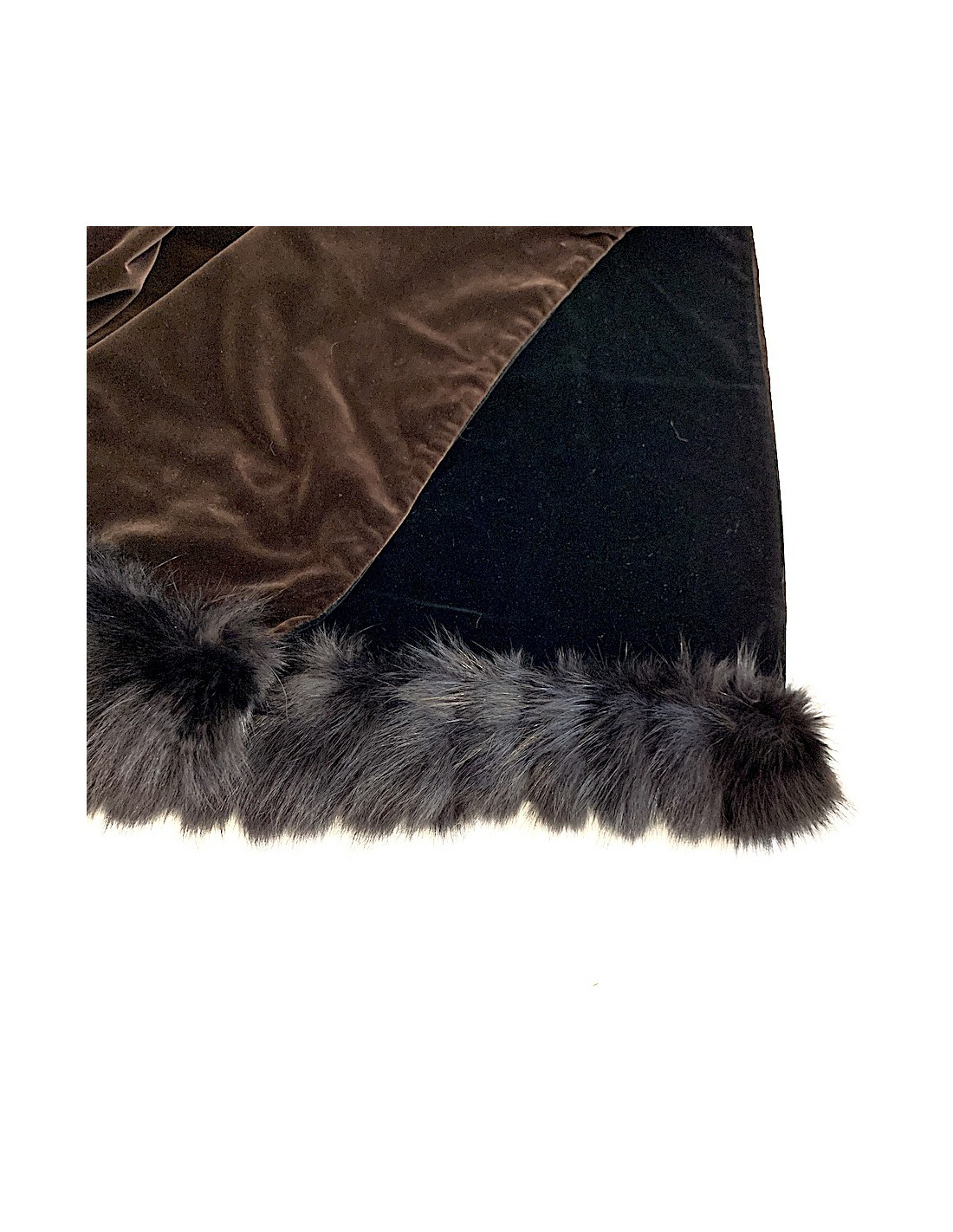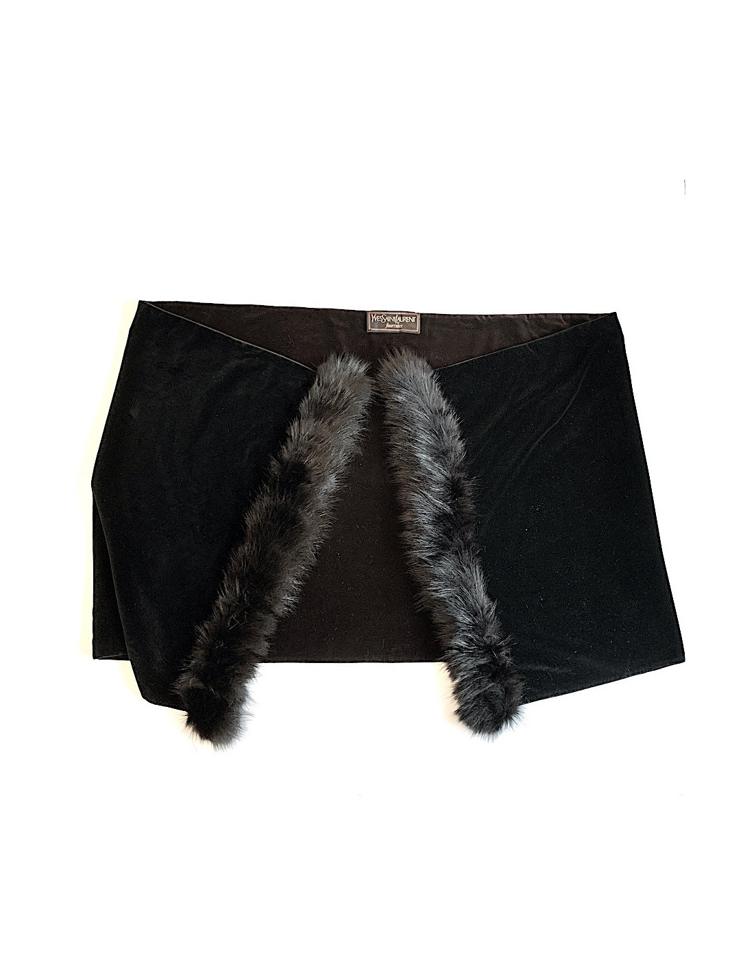 The shawl is signed YVES SAINT LAURENT Fourrures. Made of black velvet on the front and brown on the back, it is trimmed with black fur on each side. Dressed for the winter!