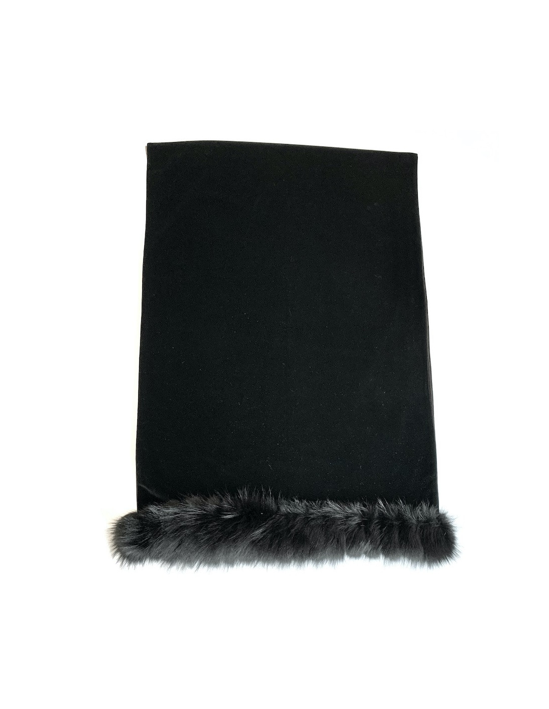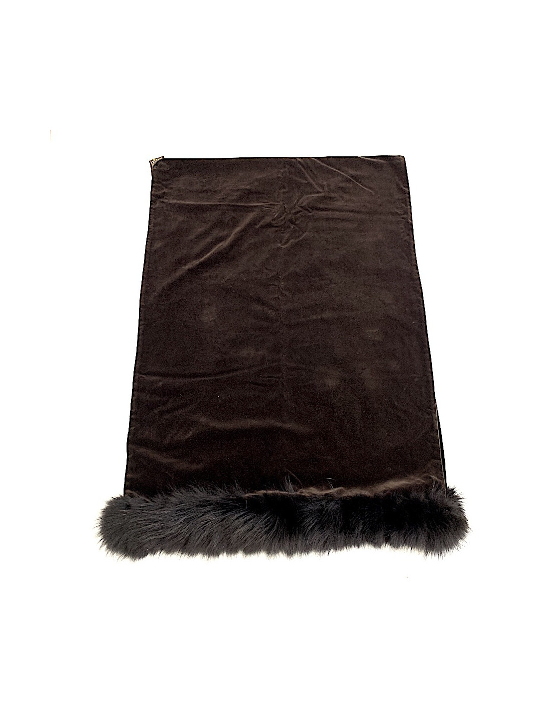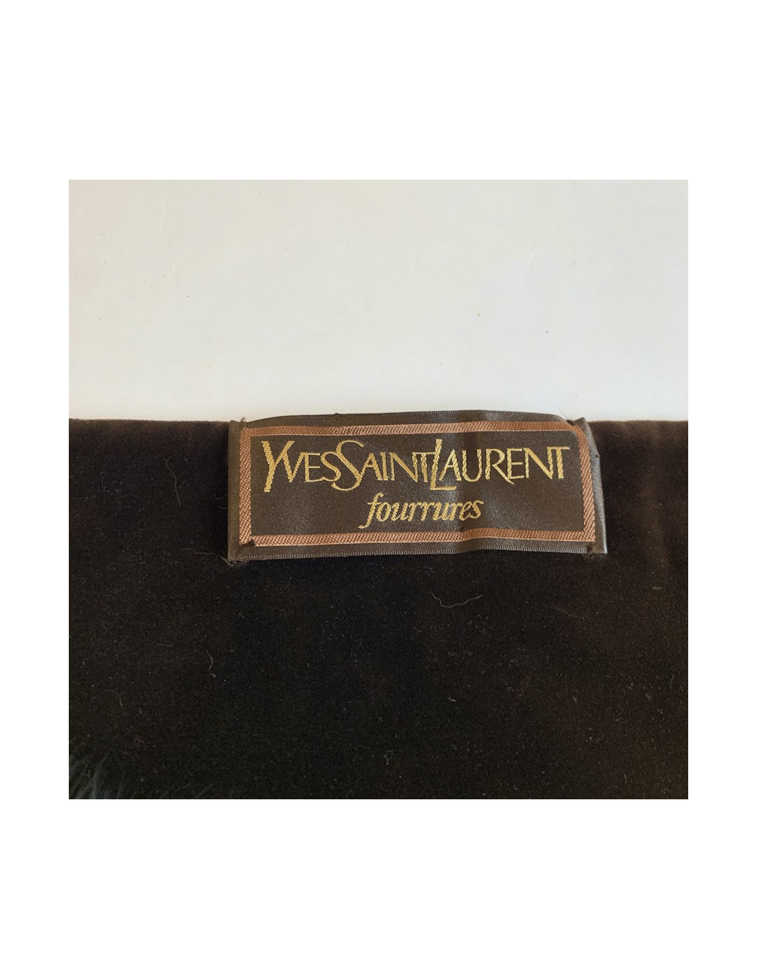 The shawl is signed YVES SAINT LAURENT Fourrures. Made of black velvet on the front and brown on the back, it is trimmed with black fur on each side. Dressed for the winter!