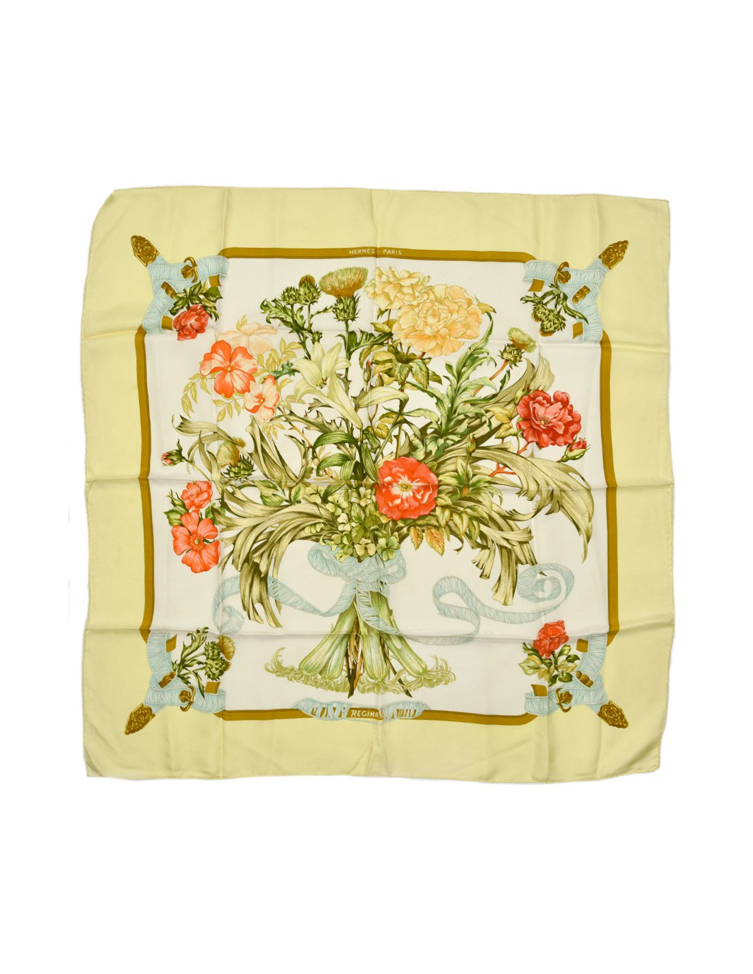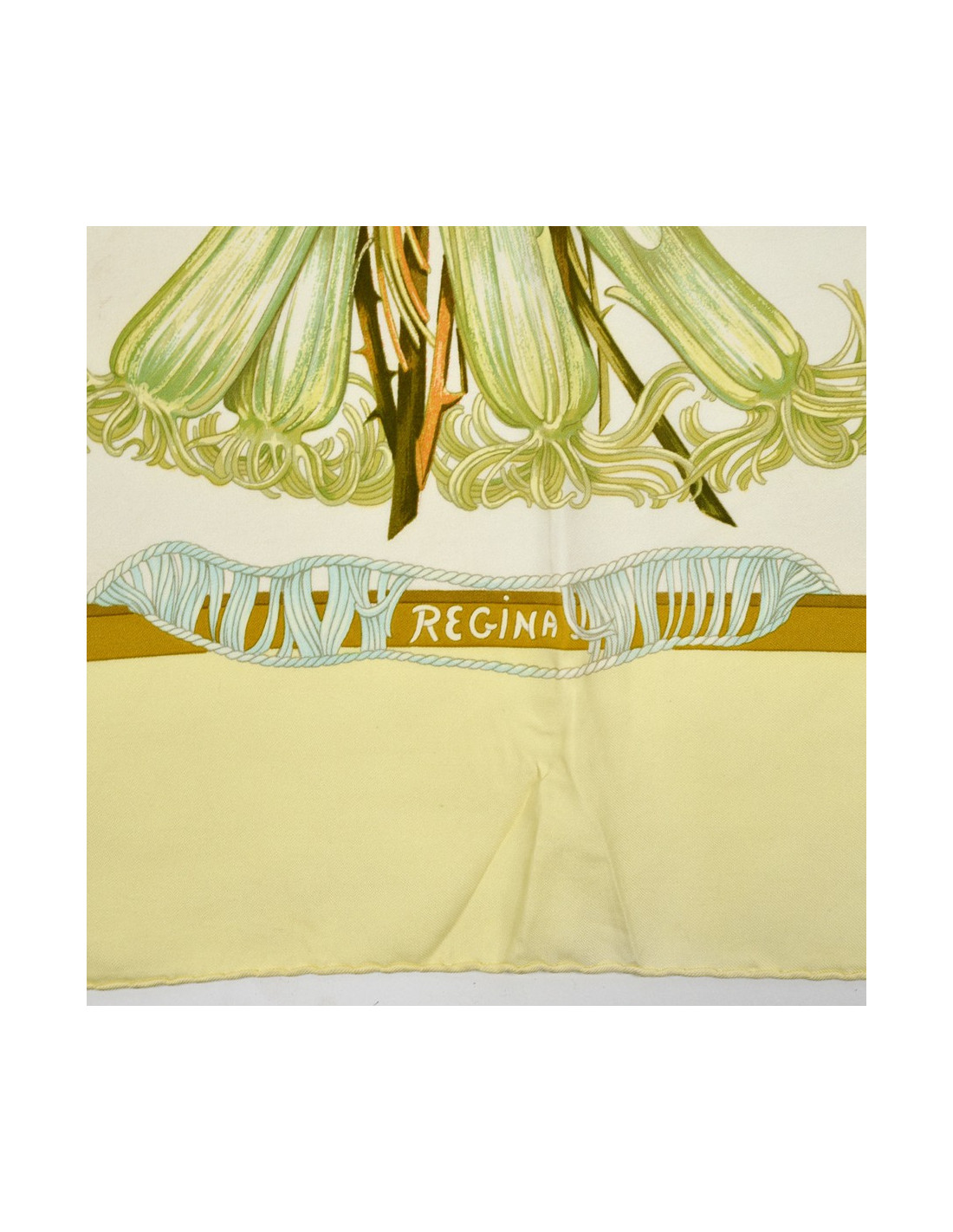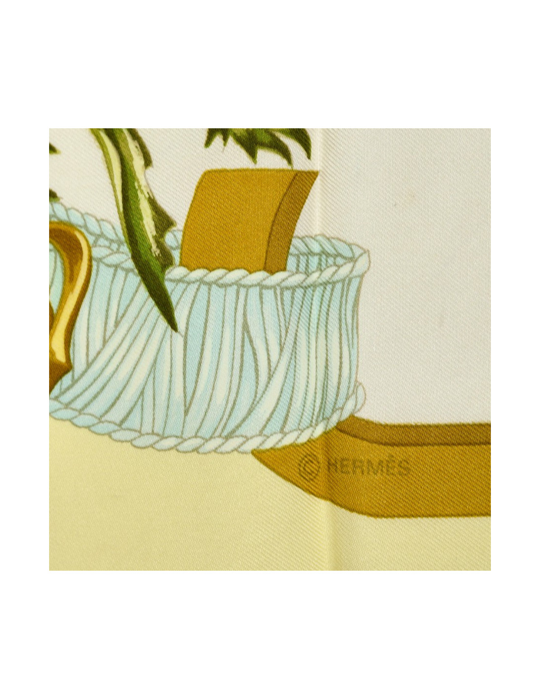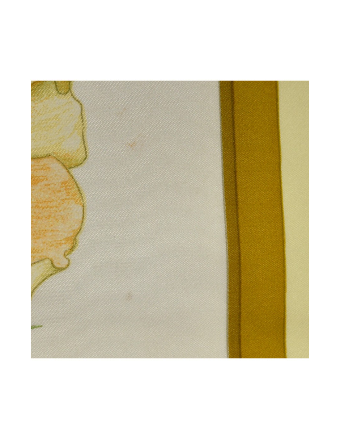 Last items in stock SCARVES AND SHAWLS HERMES "Folklore" white and yellow silk twill large scarf HERMES 17049 970.00 € HERMES "Folklore" white and yellow silk twill large scarf Made in FranceCondition: very goodMaterial: silkColors: yellow, white, blackDesigner: Henri d'Origny.S of the brand's salesMeasurements: 135x135xmDetails: HERMES “Folklore” giant square in feather silk twill with yellow borders on a white background. Impeccable black rolled hem. Advantage Valois... Add to cart