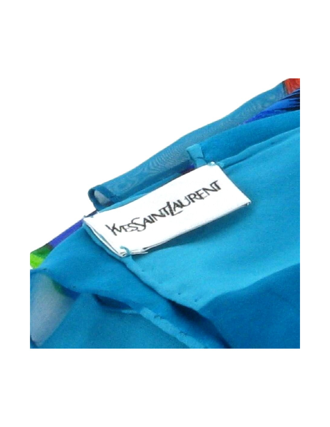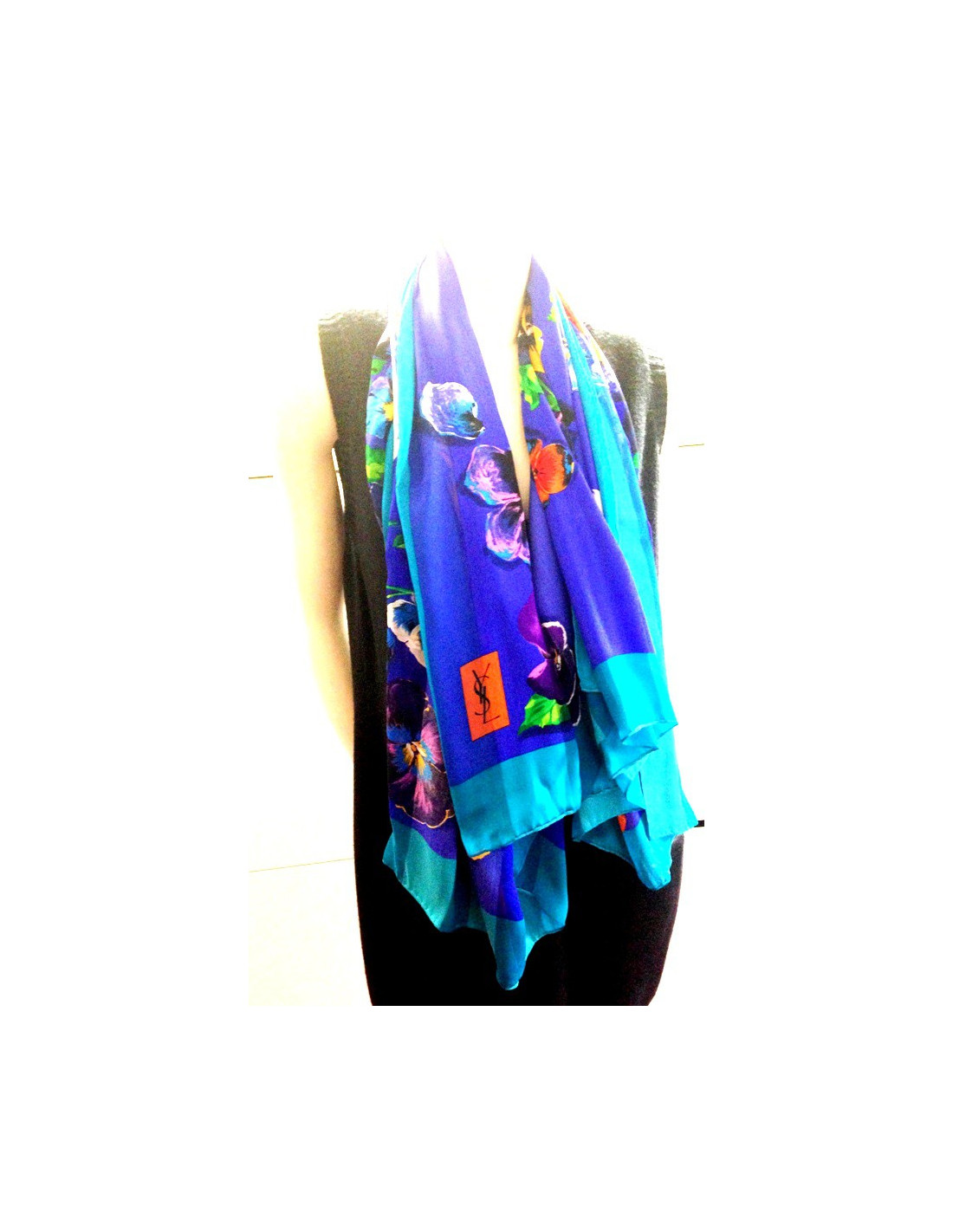 YVES SAINT LAURENT large shawl in 100% silk. This scarf with printed flowers on large turquoise and blue stripes Fund is in perfect condition because never door.