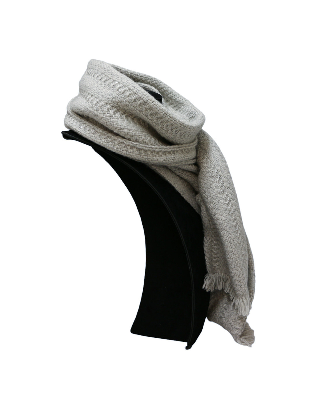 Details : large cashmere scarf with fringed trims at each end. A large CC in sequins.