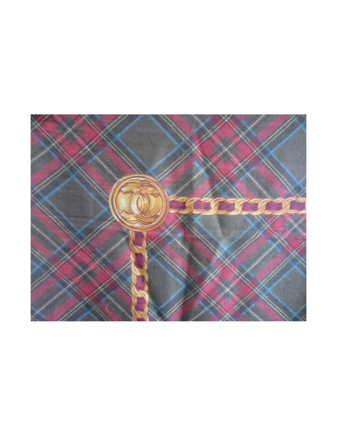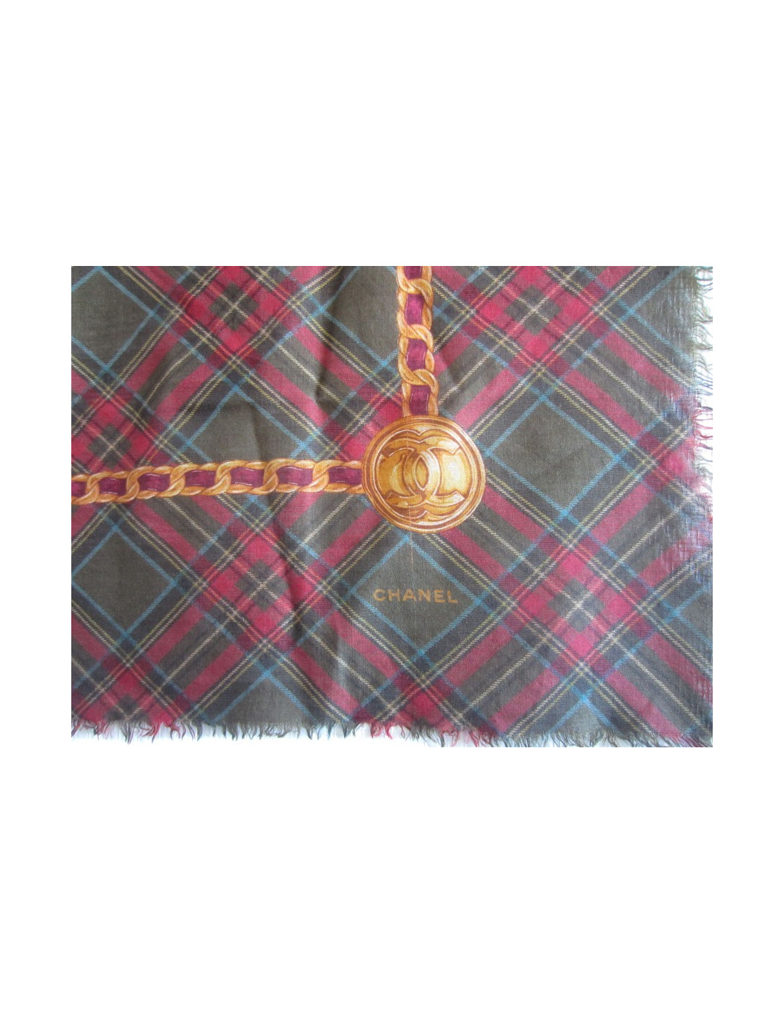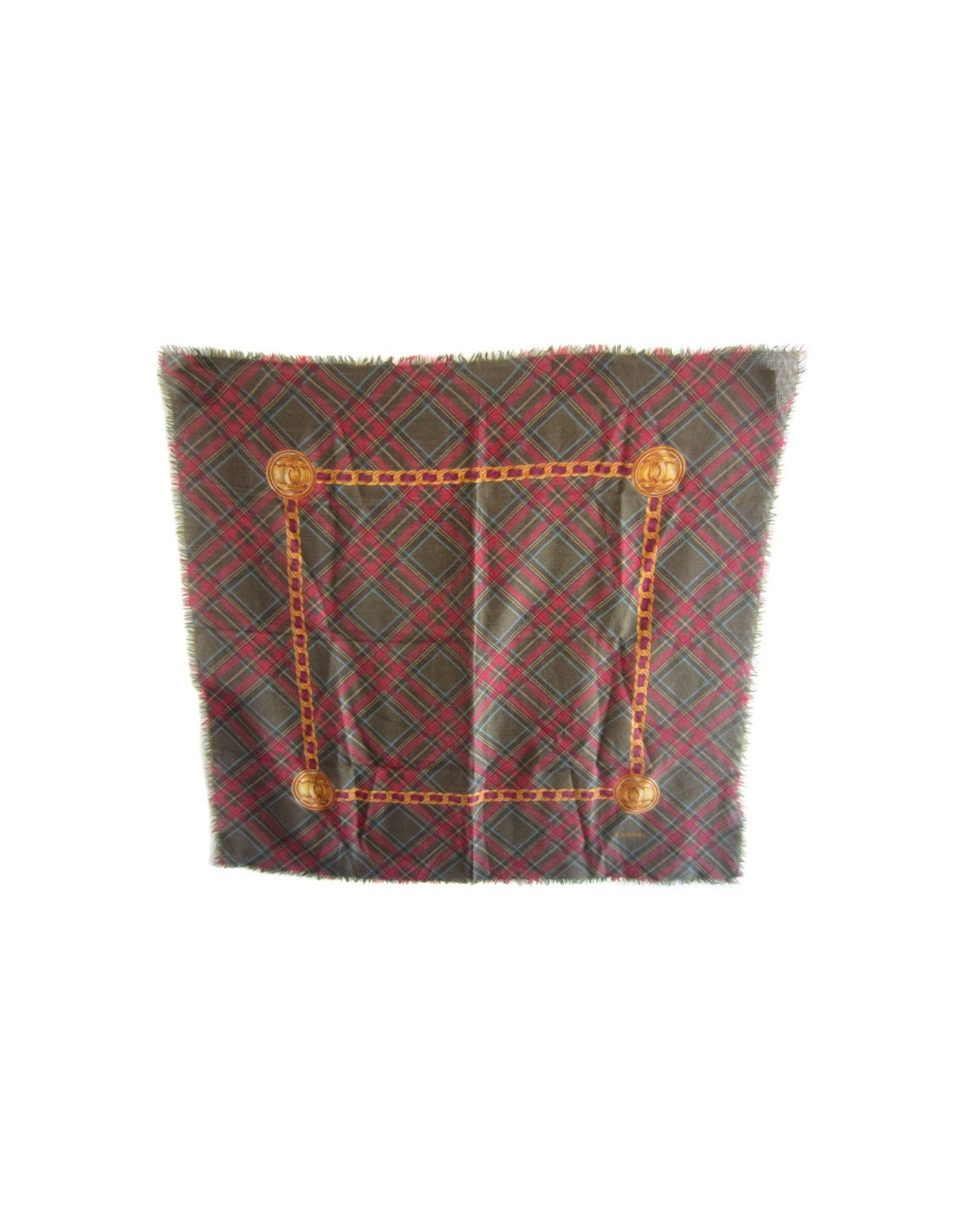 CHANEL scarf, wool and silk fringed on board. Green and Red plaid with pattern string. Absence of label material. Slight zipper at the level of the CHANEL brand. In very good condition.
