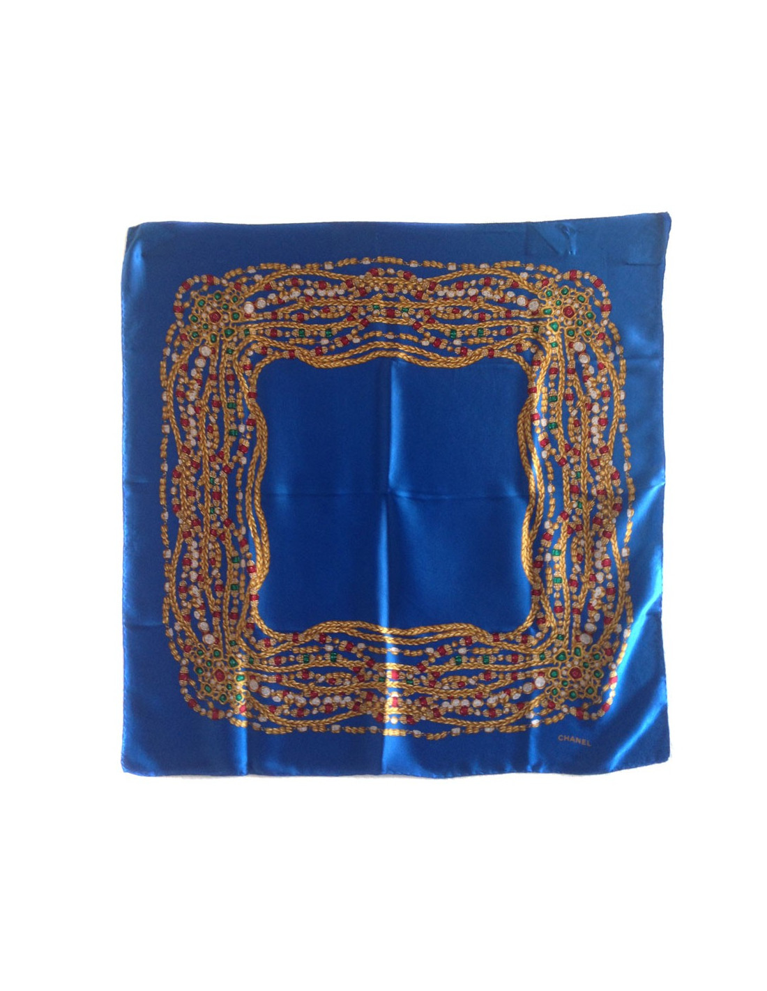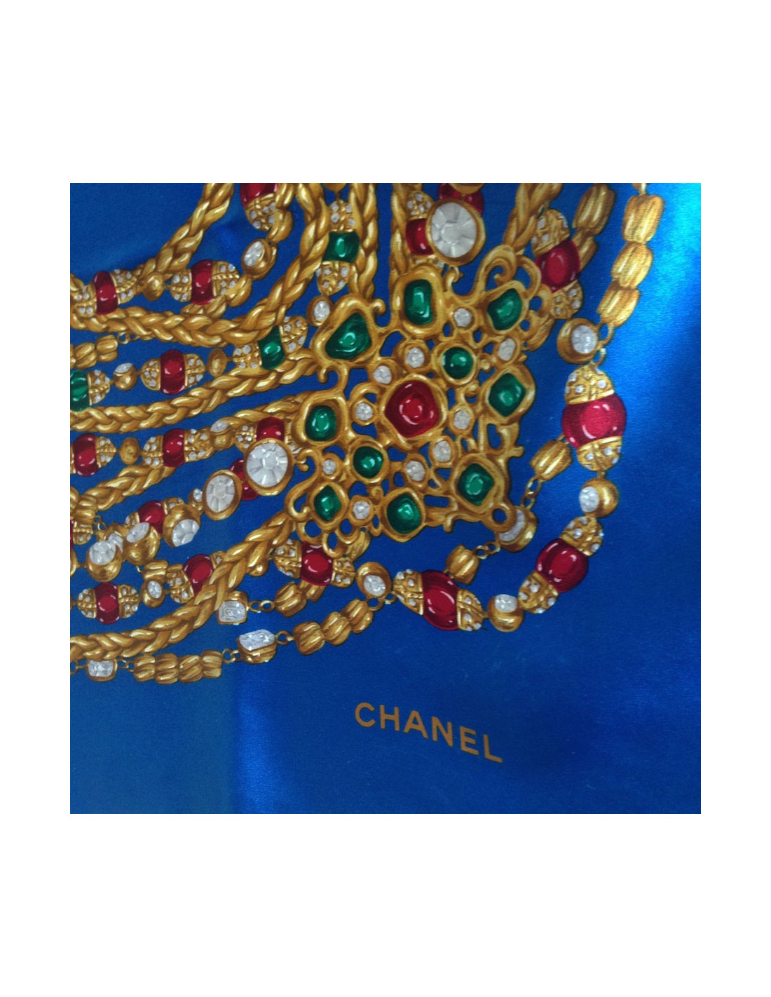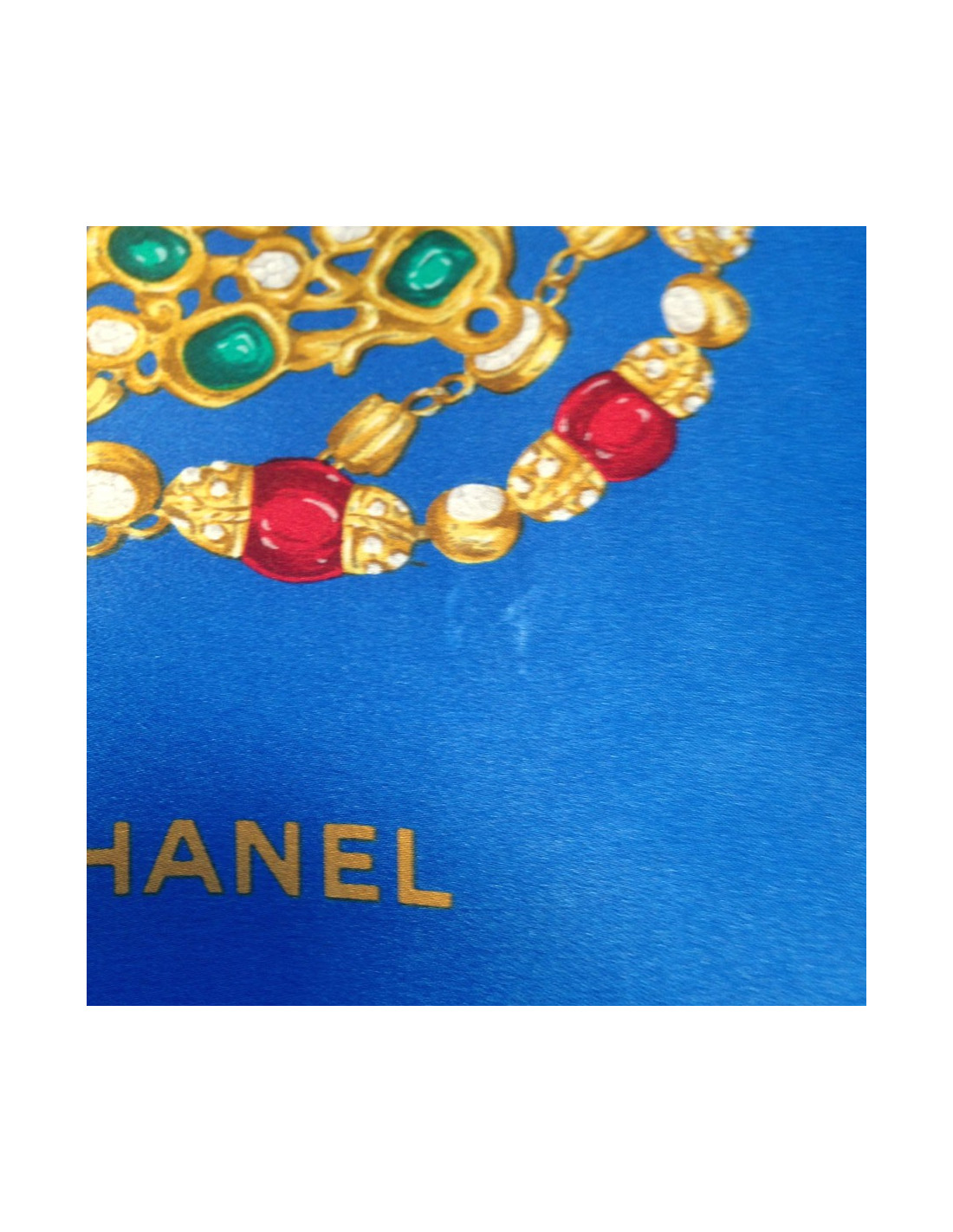 Superb square of silk CHANEL vintage in shades of blue. Reason: the Chanel necklaces in rubies, emeralds, etc... Silk very slightly damaged at the level of the signature (see photo). The trailer is in very good condition. Absence of label material. The square has been cleaned to a luxury cleaners.